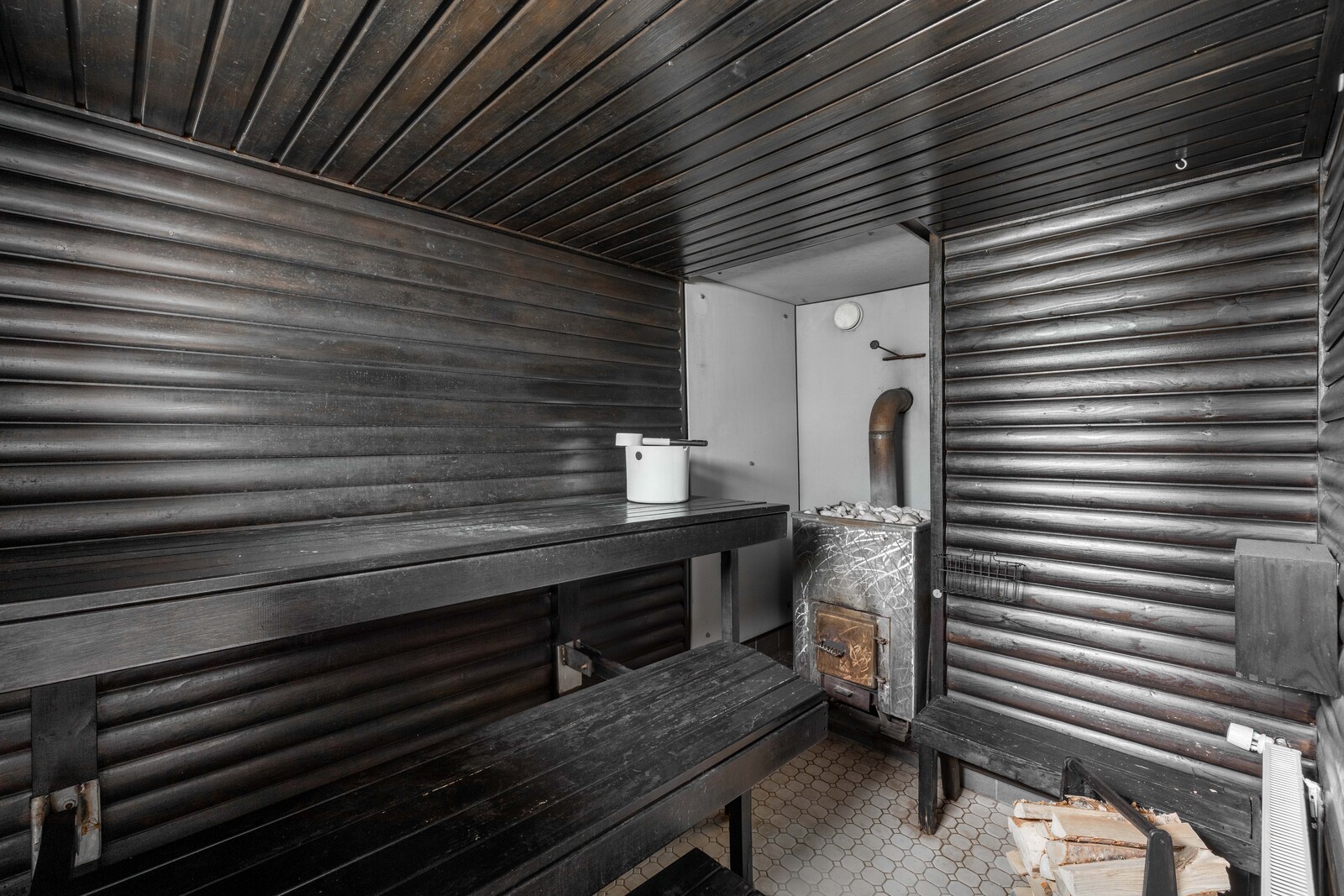 | Saunan kuvaus | Seinät (puu), lattiat (laatta), Puukiuas |