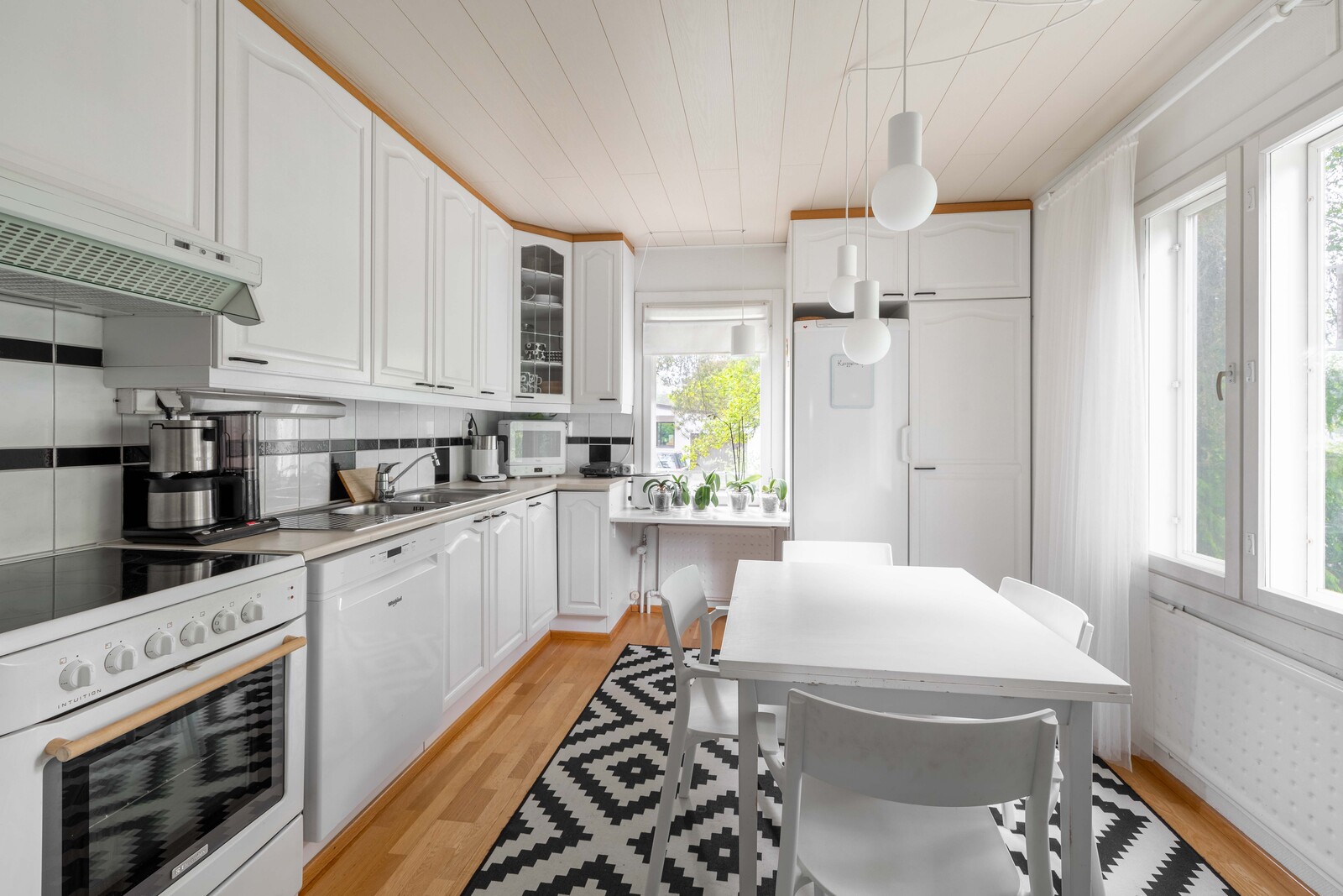 | Keittiön kuvaus | Liesi (sähköliesi), työtasot (laminaatti), seinät (maali ja lasikuitutapetti), lattiat (parketti), astianpesukone, liesituuletin, jääkaappi, erillinen pakastin, liesi ja kiinteät valaisimet |
