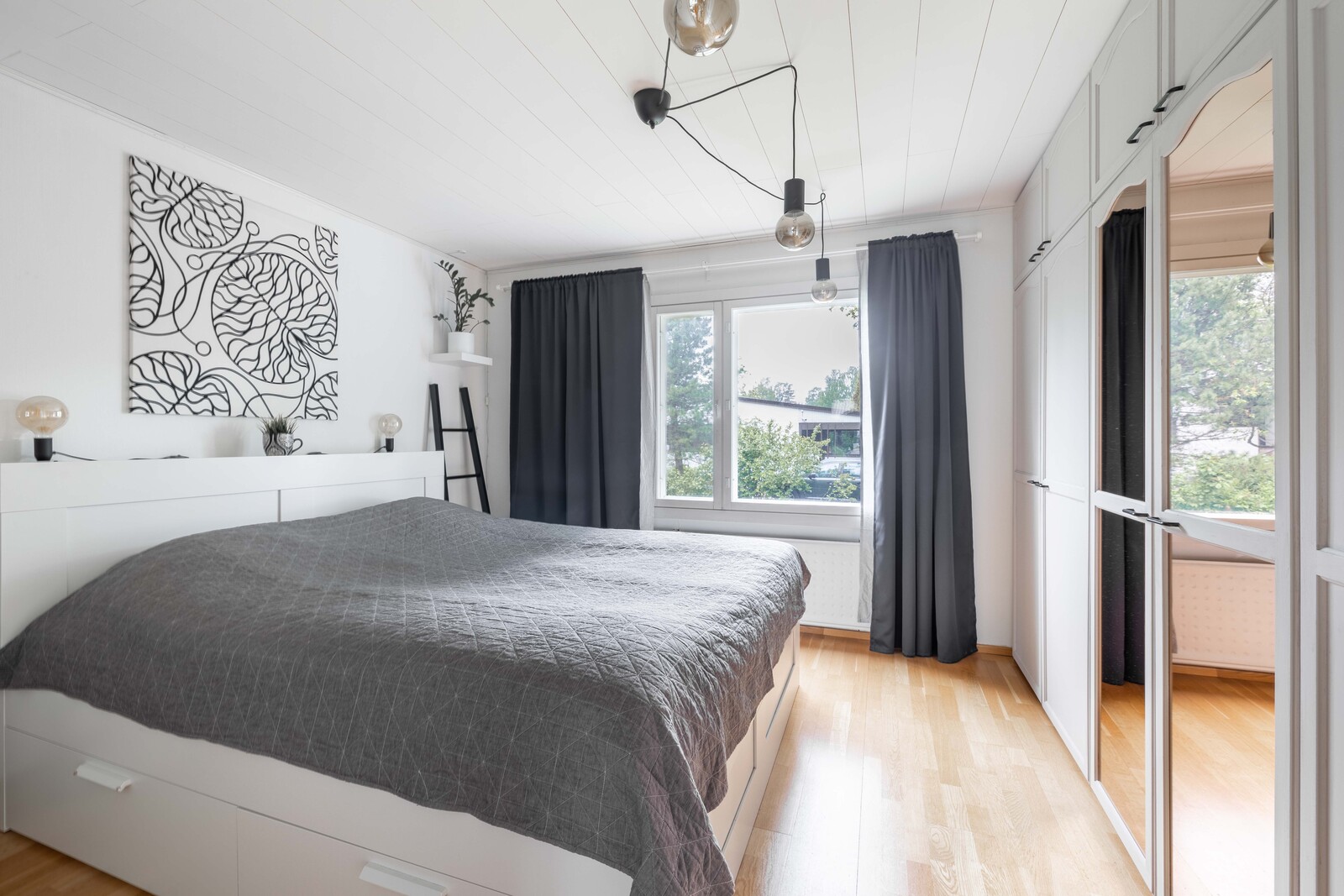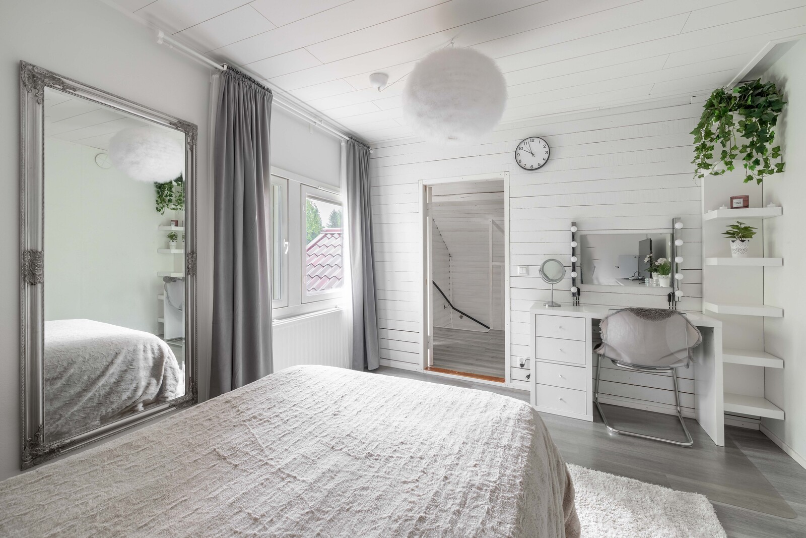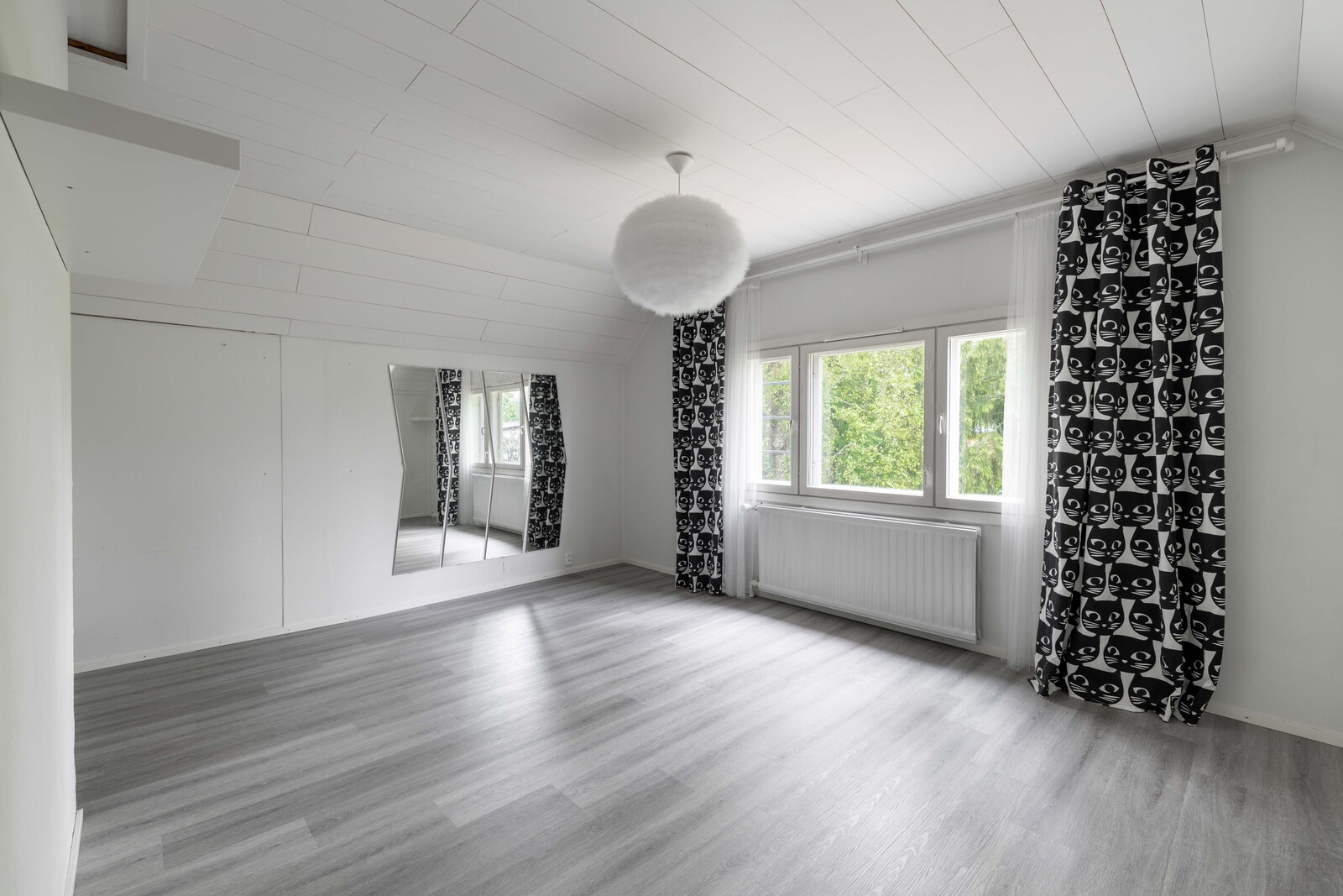 | Makuuhuoneen kuvaus | Lukumäärä: 3, seinät (tapetti ja maali), lattiat (parketti), yläkerrassa lattia: vinyyli, seinät: tapetti/maalattu/puu |