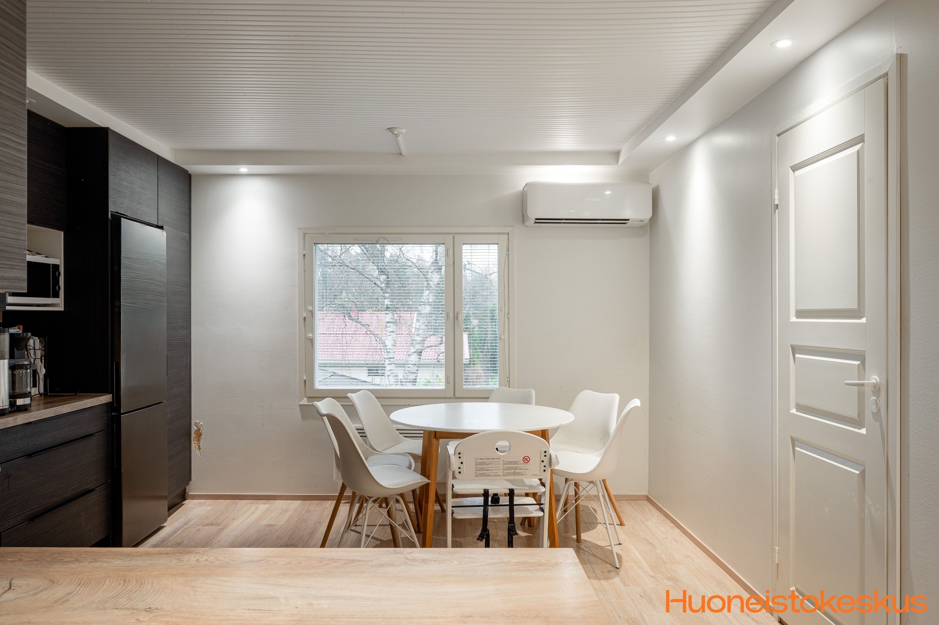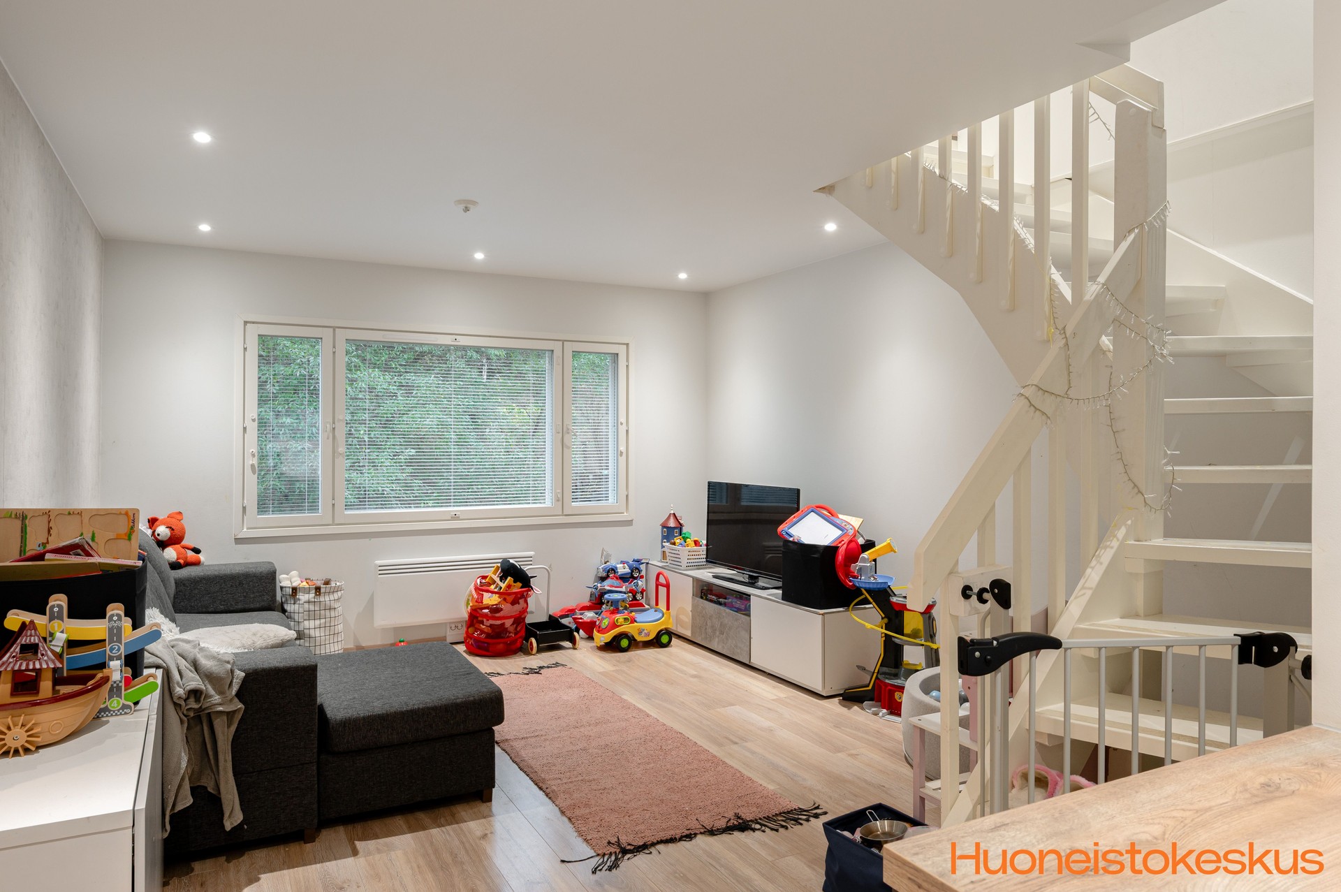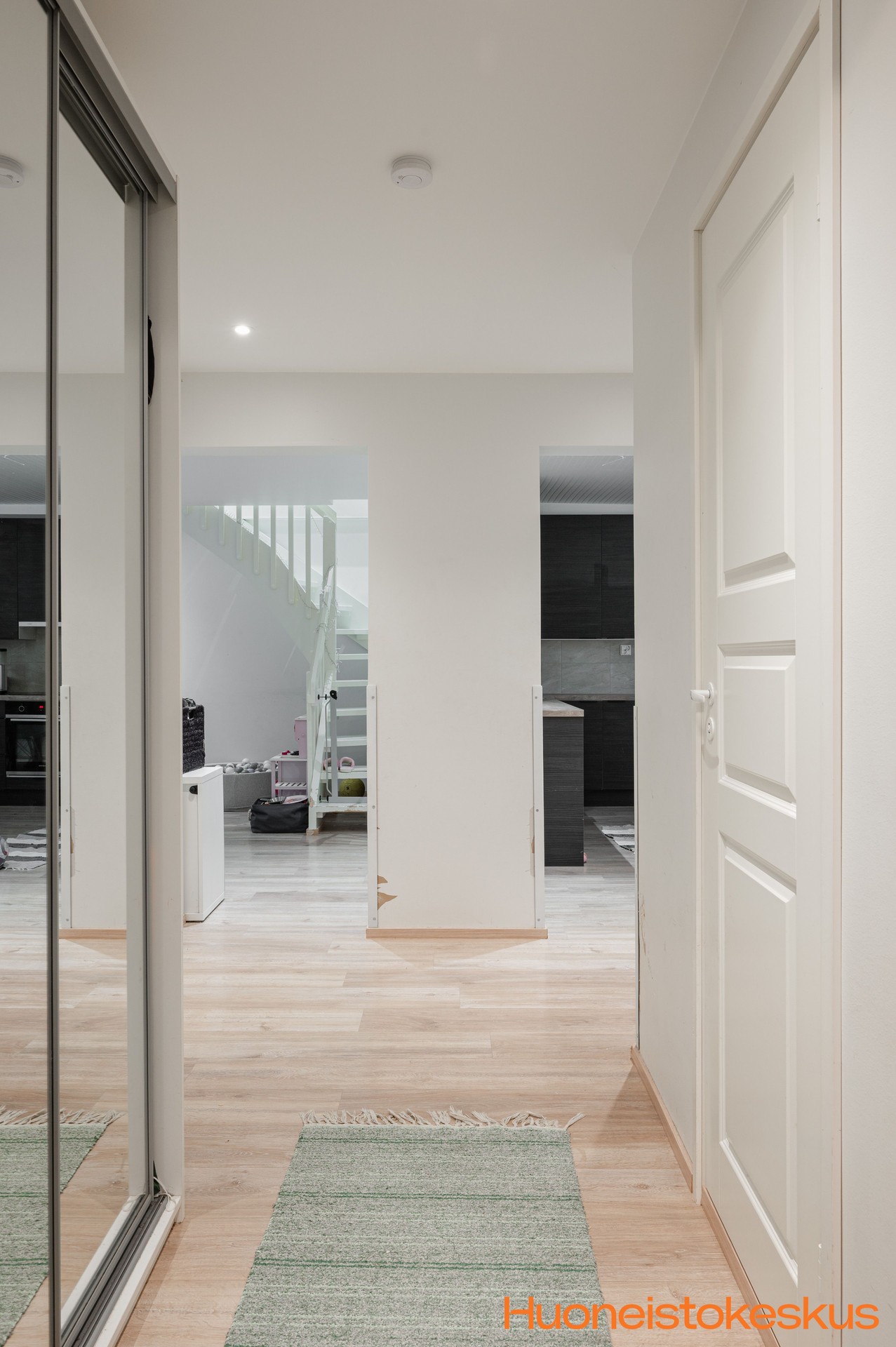 Alakerrassa valoisa olohuone yhdistyy keittiöön, luoden avaran ja viihtyisän kokonaisuuden yhteisiin hetkiin. Lisäksi alakerrasta löytyvät sauna ja kylpyhuone, pieni kodinhoitohuone sekä yksi makuuhuone – käytännöllinen ratkaisu moneen elämäntilanteeseen.