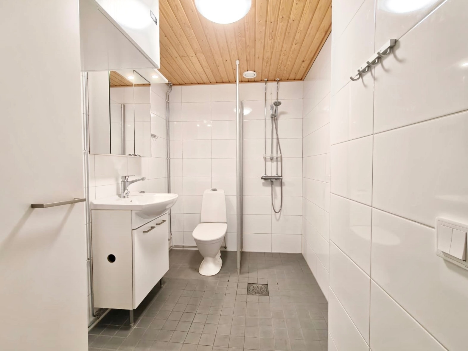 | Kylpyhuoneen kuvaus | Pesukoneliitäntä, suihkuseinä ja wc-istuin, seinät (kaakeli), lattiat (laatta) |