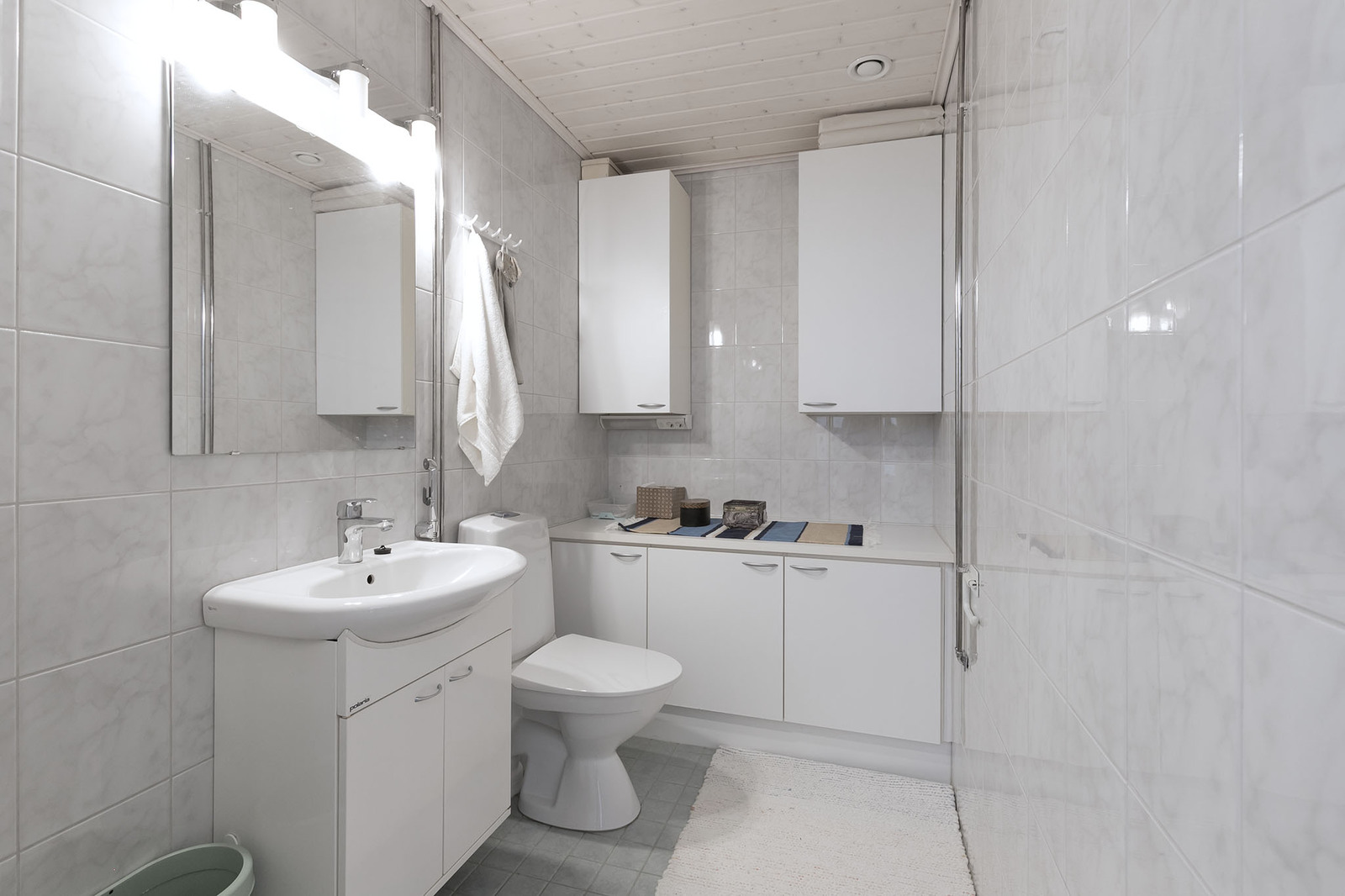 | Kylpyhuoneen kuvaus | Pesukoneliitäntä, suihkuseinä, allaskaappi, lattialämmitys, peilikaappi, suihku ja kiinteät valaisimet, seinät (kaakeli), lattiat (laatta) |