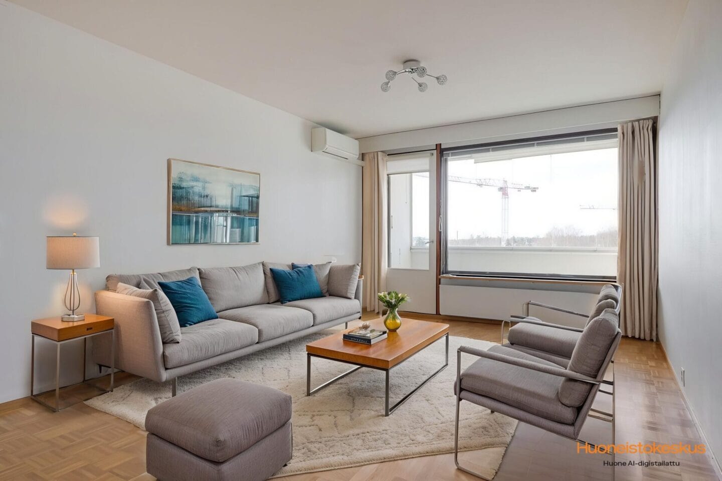 Olohuoneen kuvaus Seinät (maali ja tapetti), lattiat (parketti), Olohuoneessa ilmalämpöpumppu.