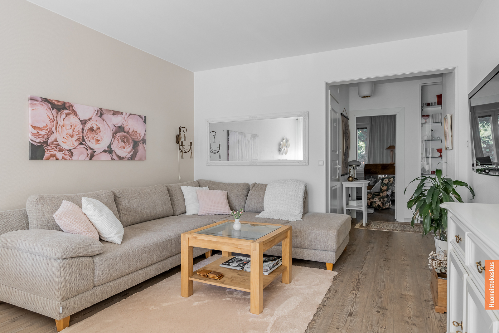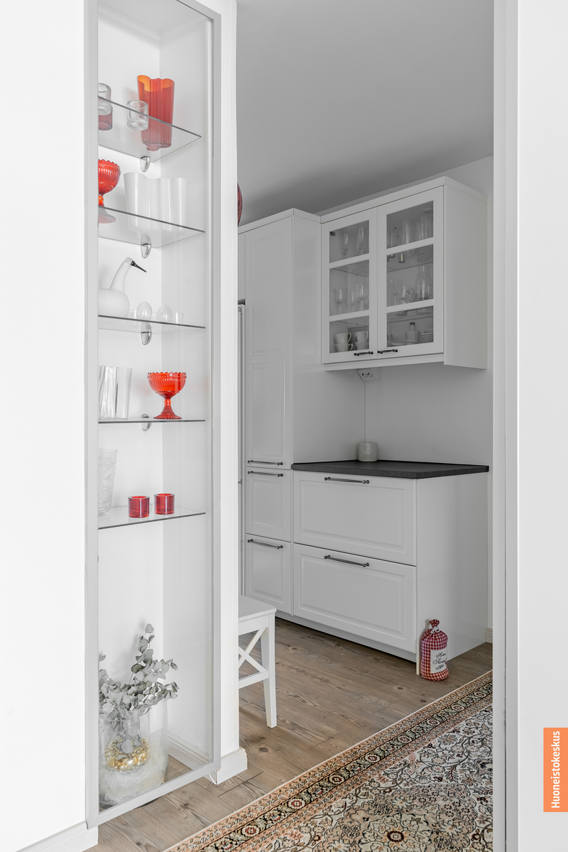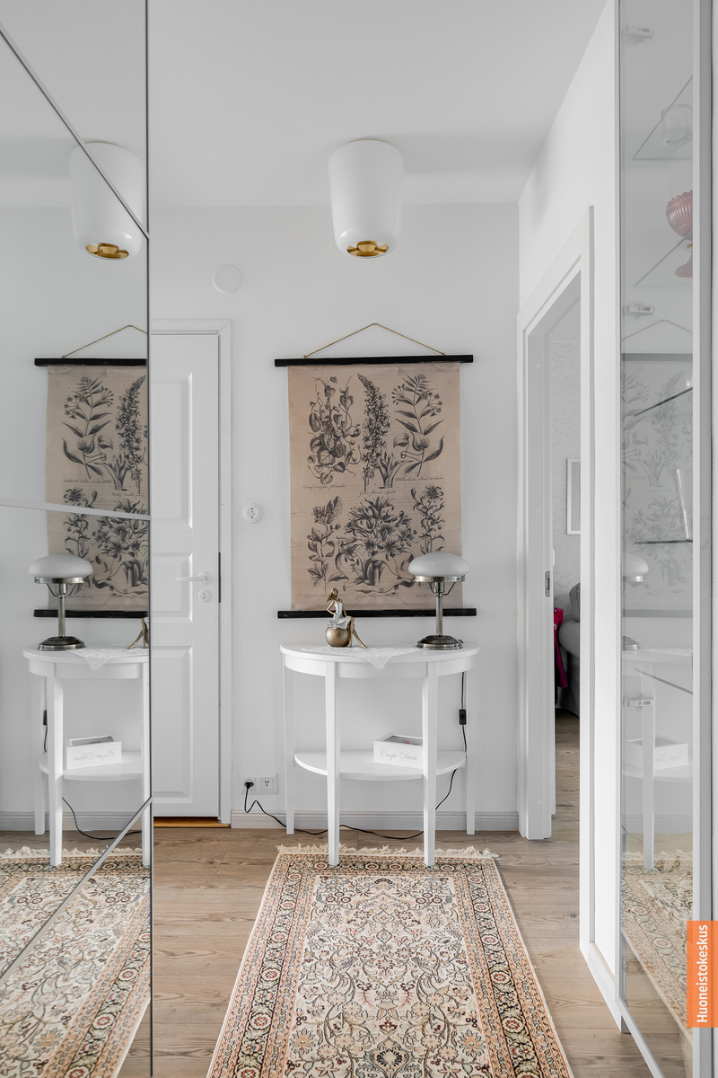 Pohjaratkaisu on todella käytännöllinen ja joustava: yksiön keittiö on muutettu toimivaksi kodinhoito- ja pukeutumistilaksi, jossa pienet yksityiskohdat ja säilytysratkaisut on mietitty tarkkaan. Kahden kylpyhuoneen ansiosta asuminen on erityisen helppoa, ja säilytystilaa on runsaasti niin asunnossa kuin vintti- ja kellarivarastoissa – kahden asunnon verran. Kodissa on lisäksi lasitettu parveke olohuoneen yhteydessä, joka tarjoaa rauhallisen paikan hengähtää raikkaassa ulkoilmassa arjen keskellä.