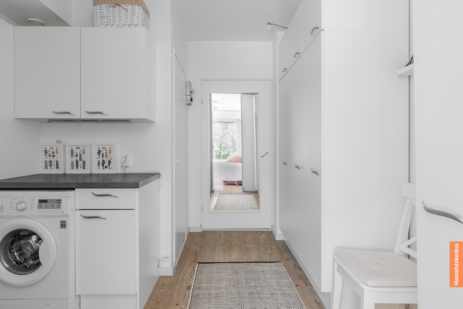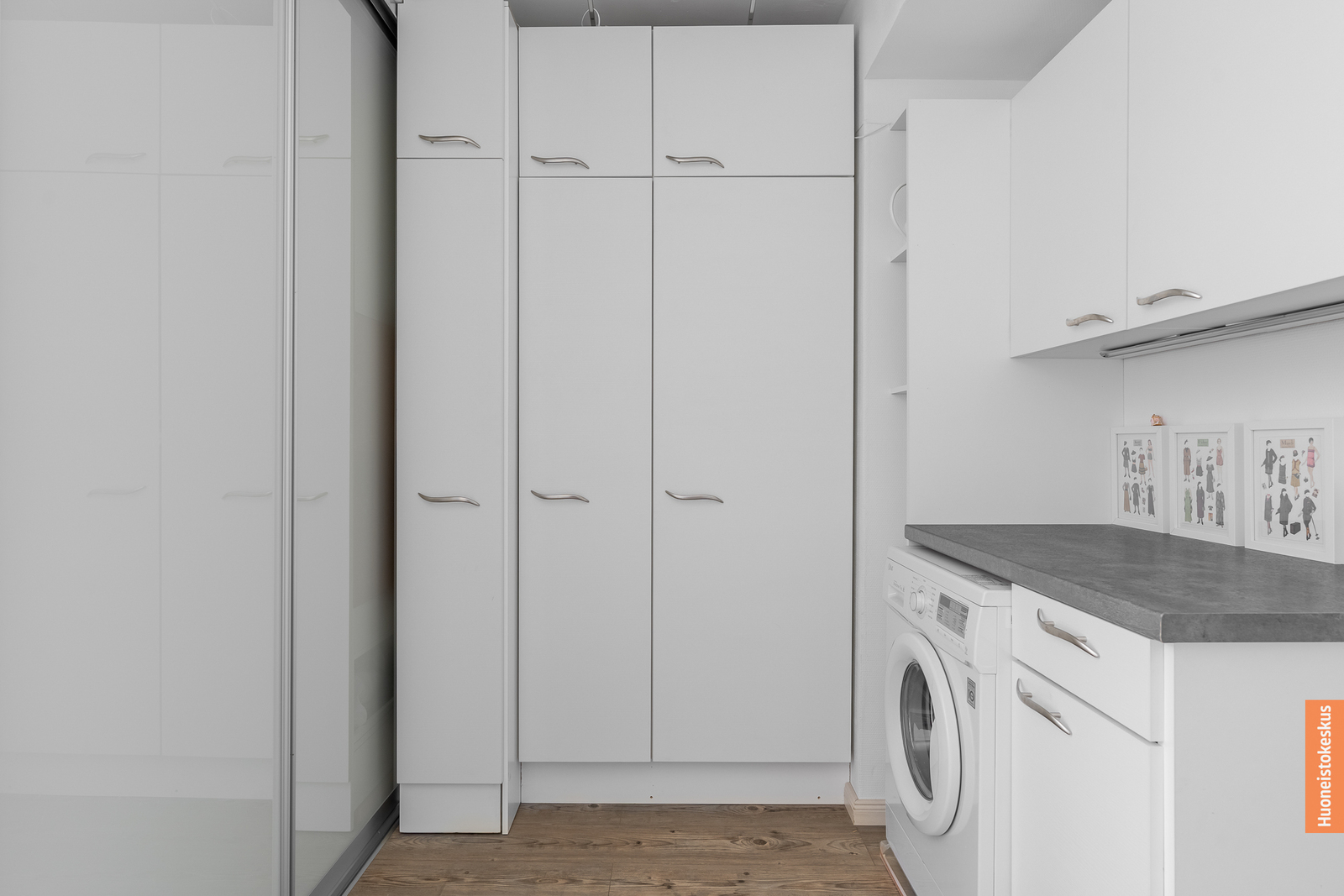 | Kodinhoitohuoneen kuvaus | Silityspöytä/taso, pyykkikaapit, pesukoneliitäntä ja pöytätaso, seinät (maali), Kodinhoitohuone/ pukeutumishuone remontoitu vuonna 2016 |