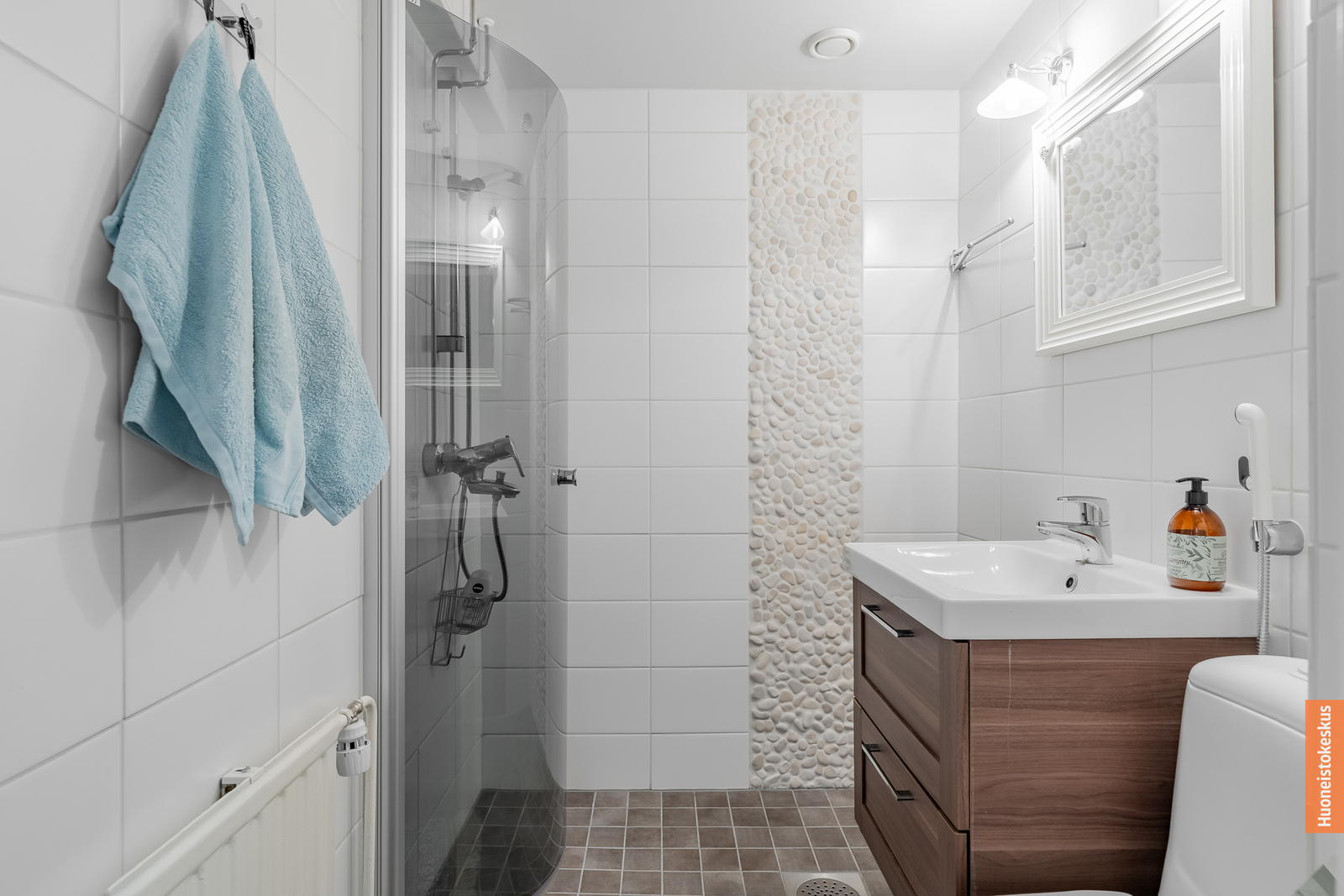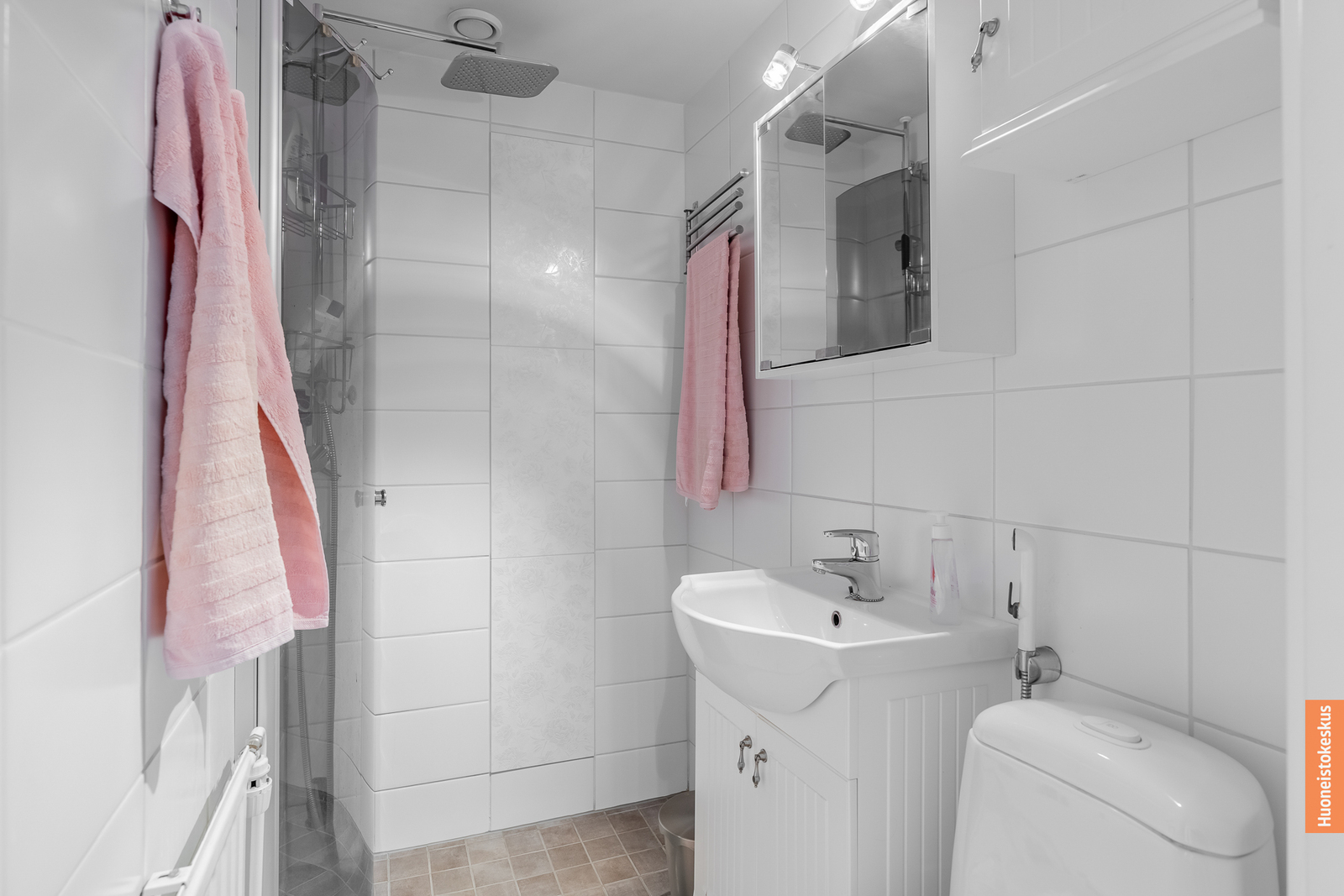| Kylpyhuoneen kuvaus | Suihku, wc-istuin, peili, peilikaappi ja suihkuseinä, seinät (kaakeli), lattiat (laatta) |