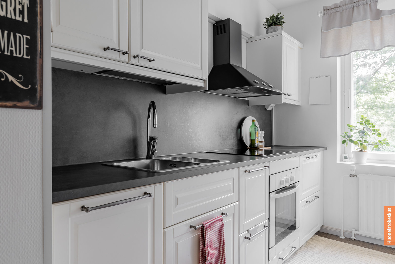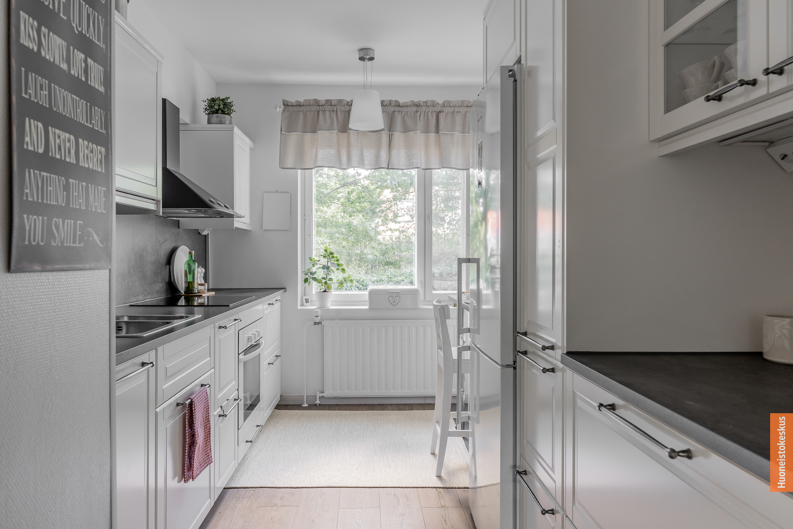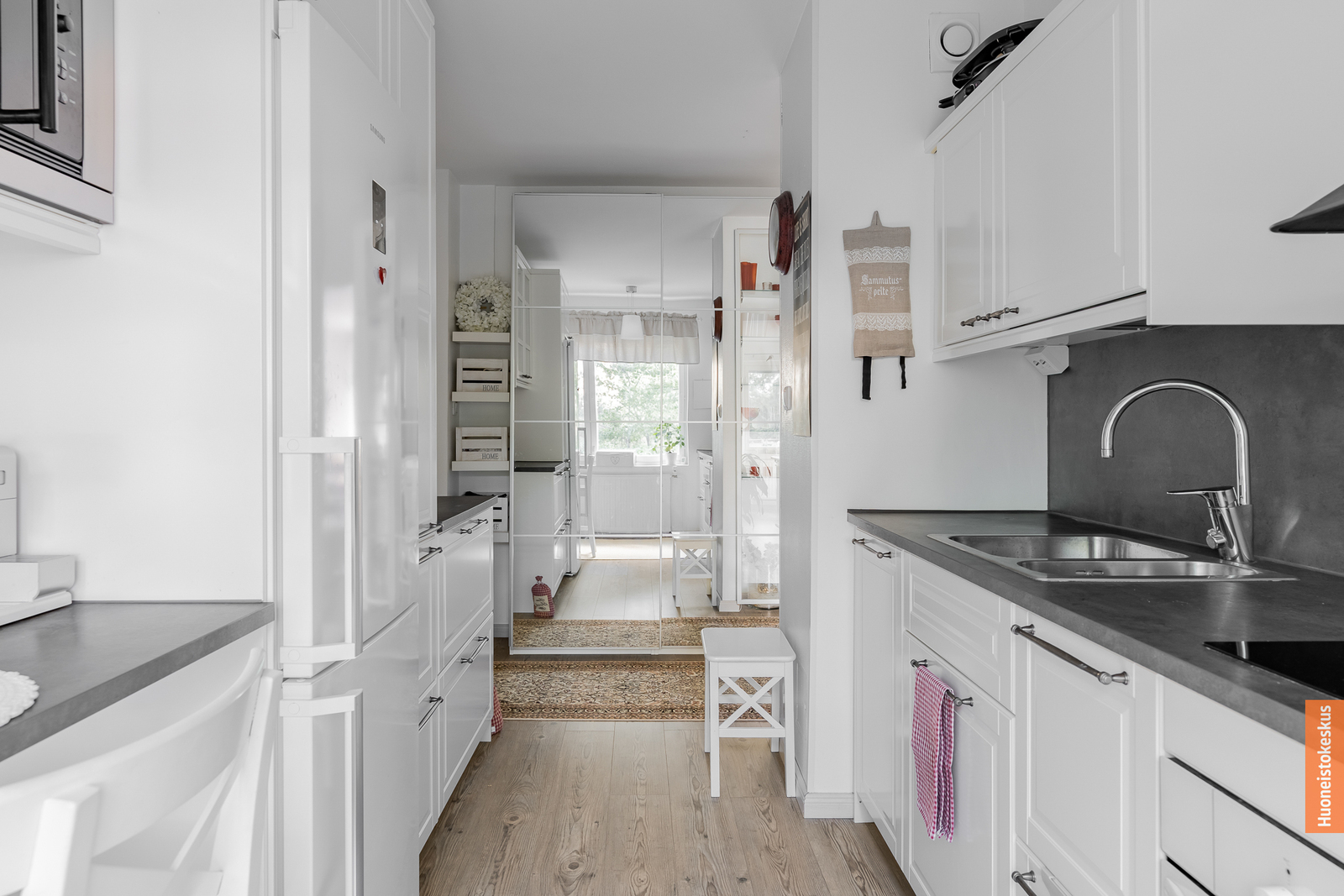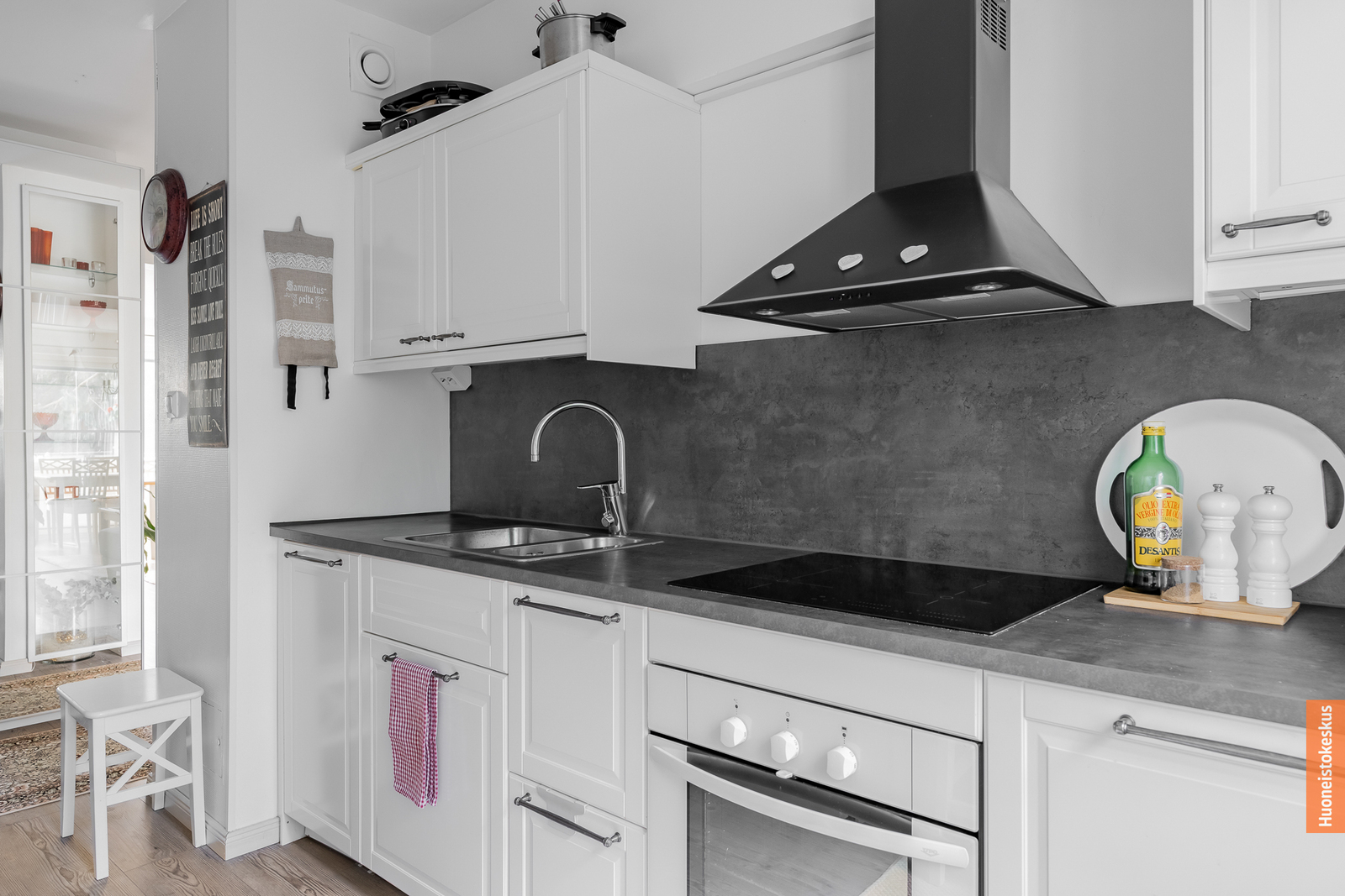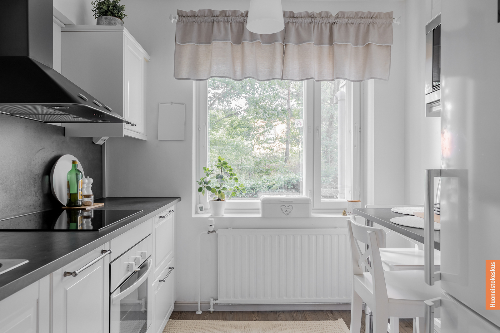 | Keittiön kuvaus | Liesi (Induktioliesi ja erillisuuni), työtasot (laminaatti), seinät (maali ja lasikuitutapetti), lattiat (laminaatti), erillisuuni, mikroaaltouuni, liesituuletin, liesi, jääkaappipakastin ja astianpesukone |