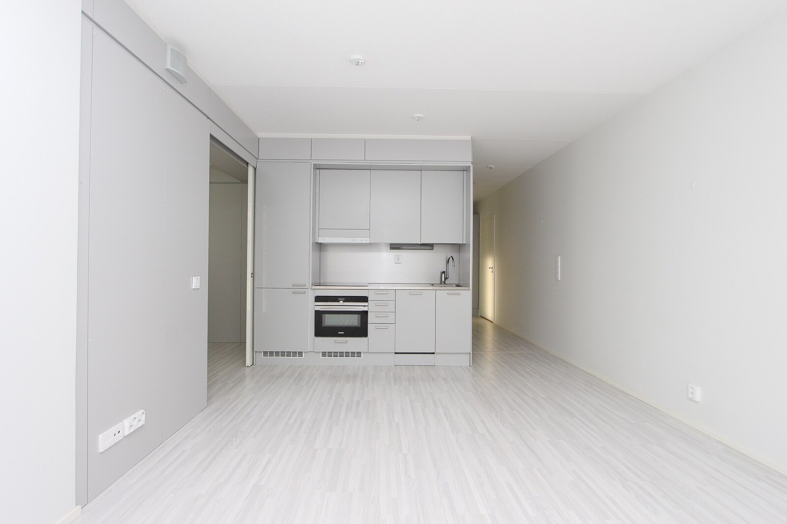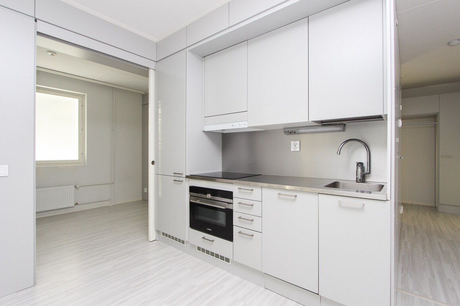 Liesi (Keraaminen liesi ja erillisuuni), työtasot (metalli), seinät (maali), lattiat (laminaatti), jääkaappipakastin, astianpesukone, erillisuuni ja liesituuletin |