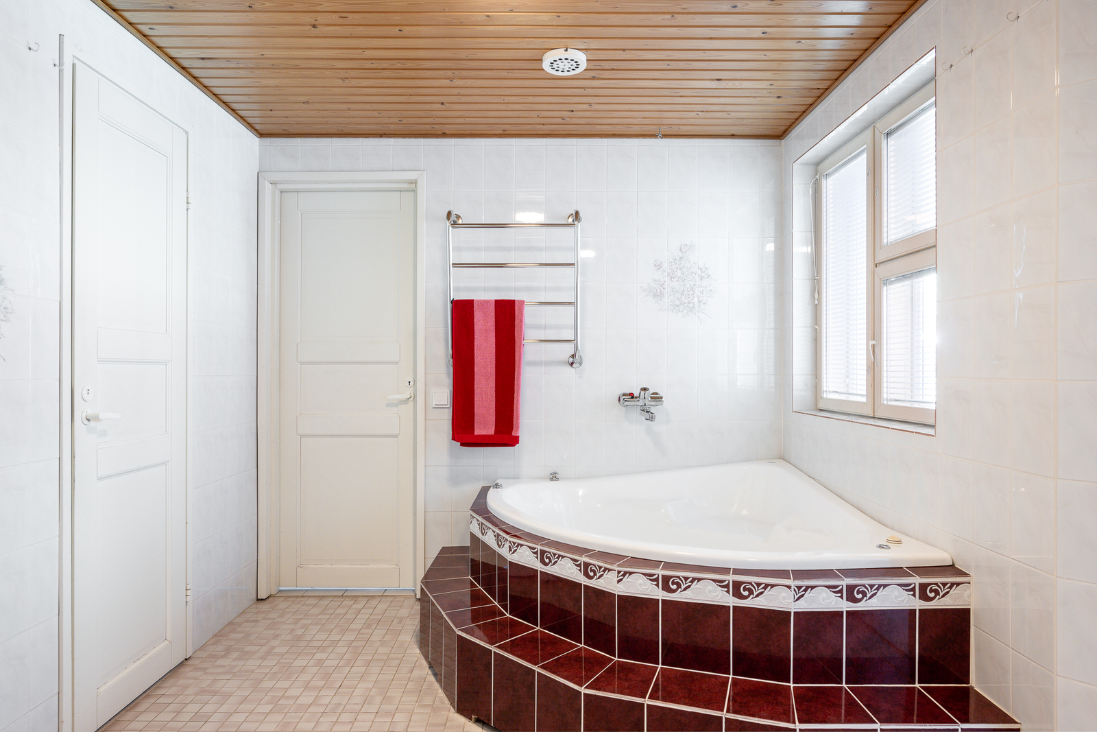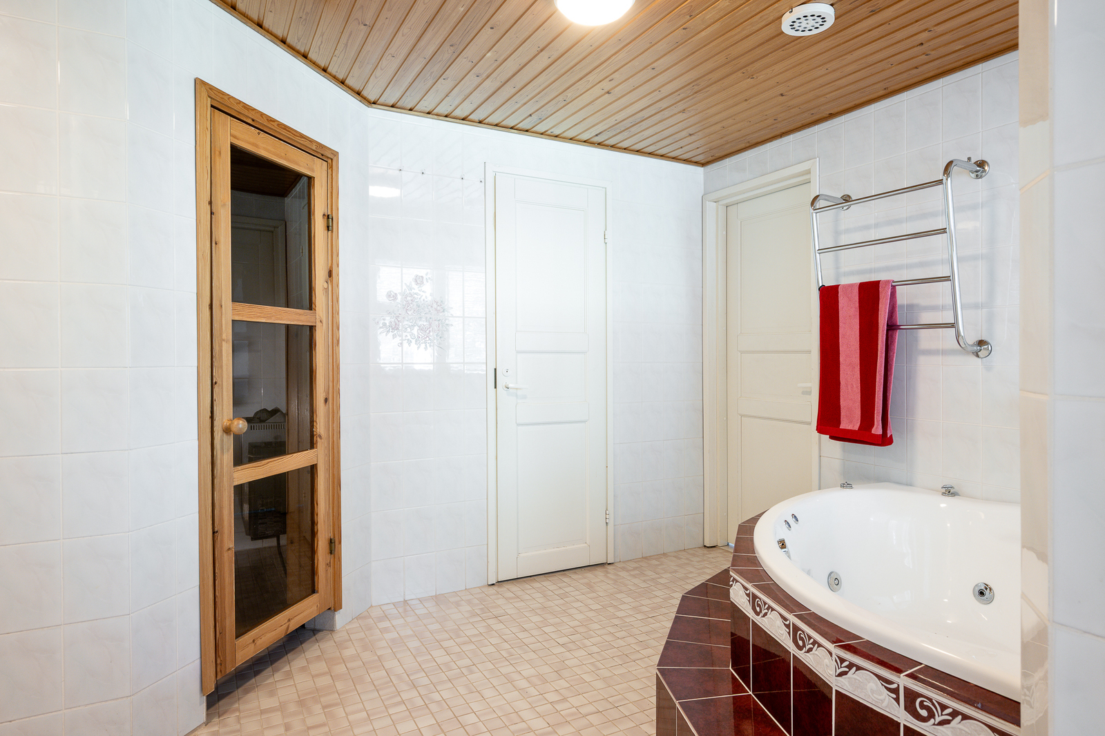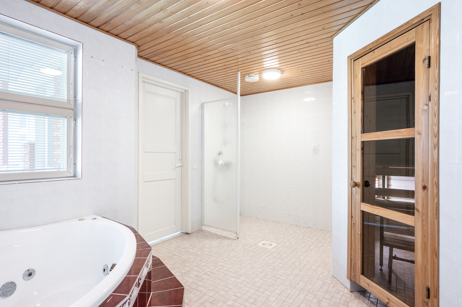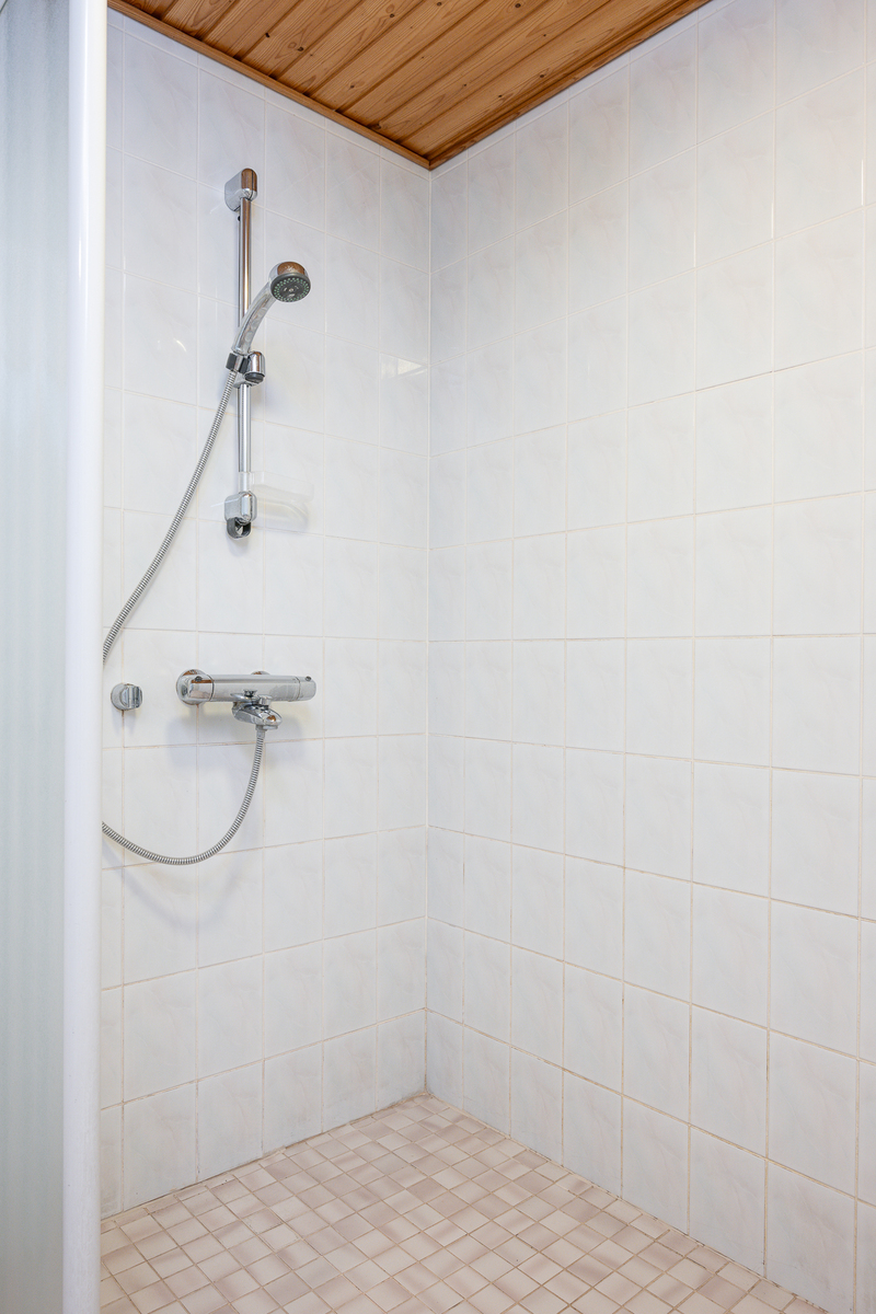 Suihkuseinä, poreamme, lattialämmitys, wc-istuin, suihku ja kiinteät valaisimet, seinät (kaakeli), lattiat (laatta) |