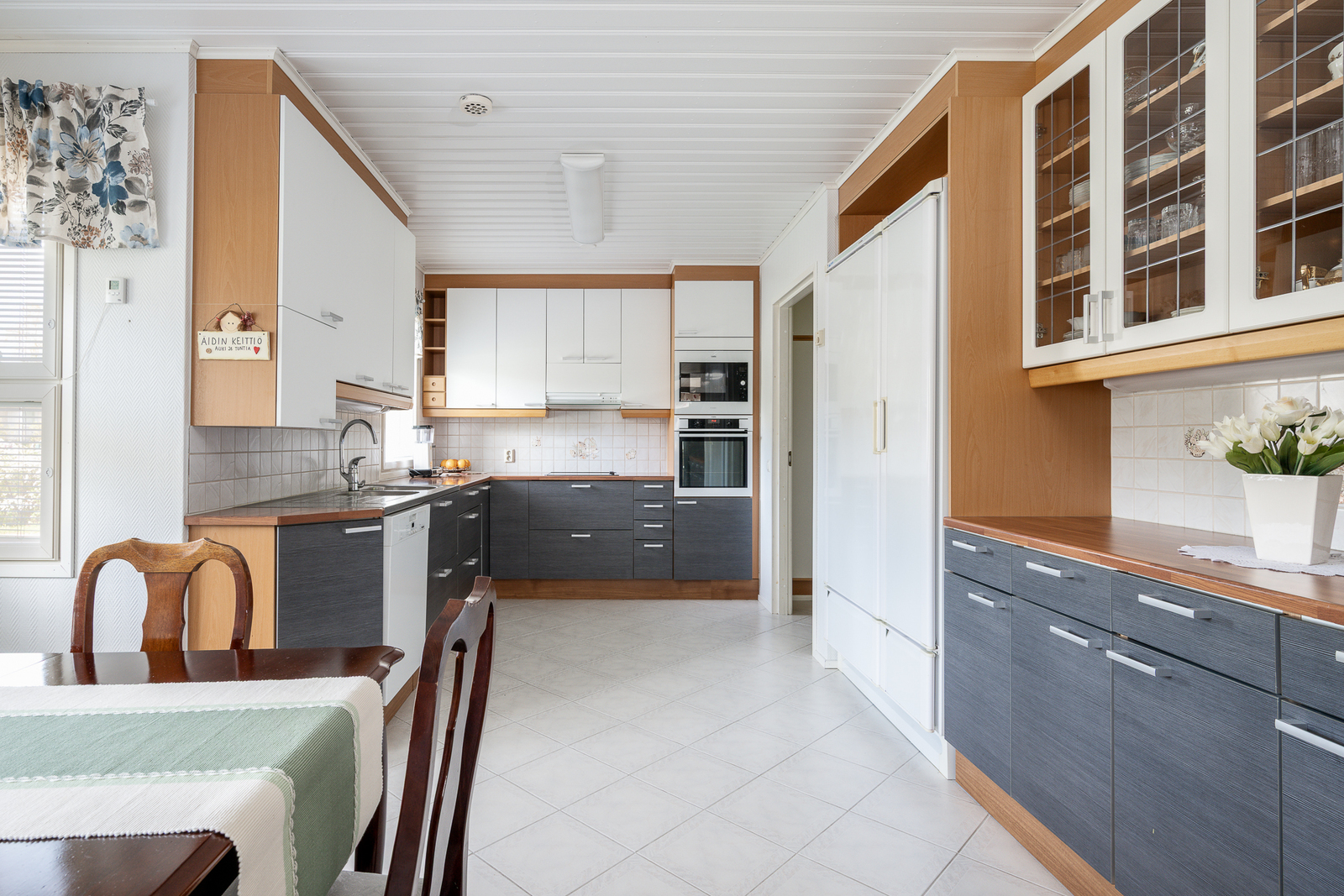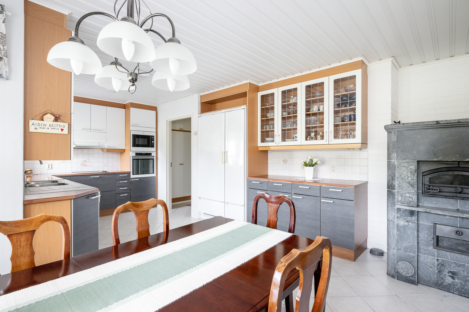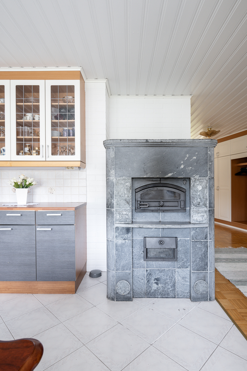 Liesi (Keraaminen liesi ja erillisuuni), työtasot (laminaatti), seinät (lasikuitutapetti), lattiat (laatta), astianpesukone, erillisuuni, mikroaaltouuni, jää-viileäkaappi, erillinen pakastin ja liesituuletin / hormi |