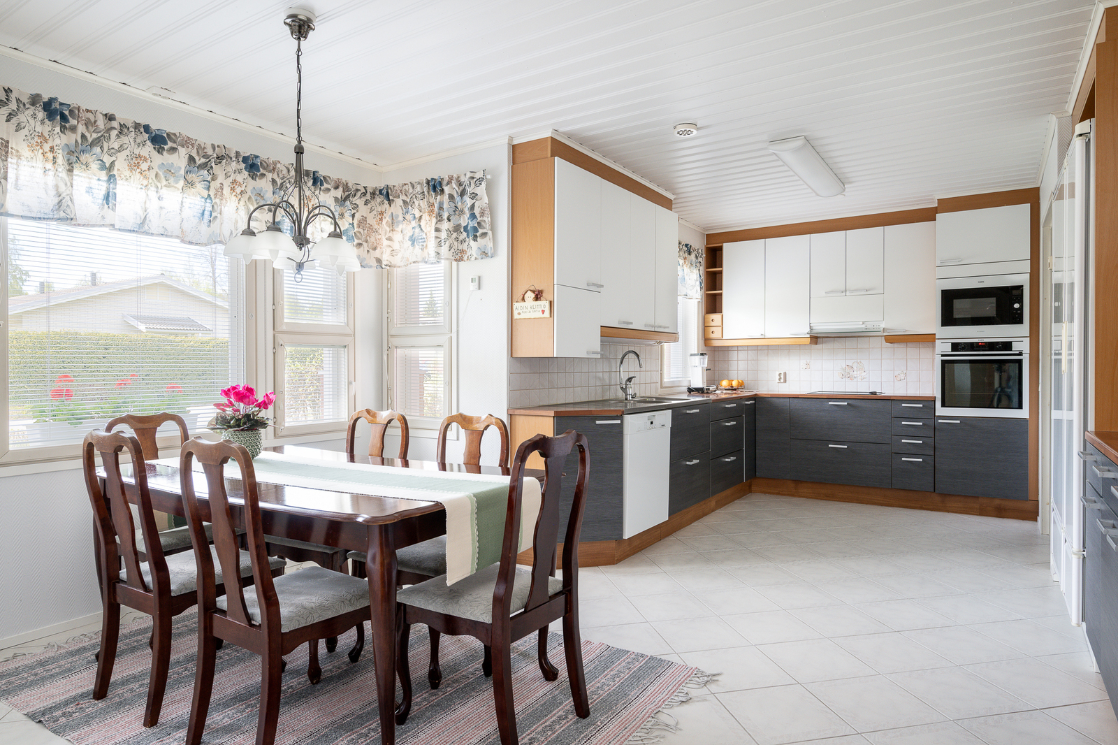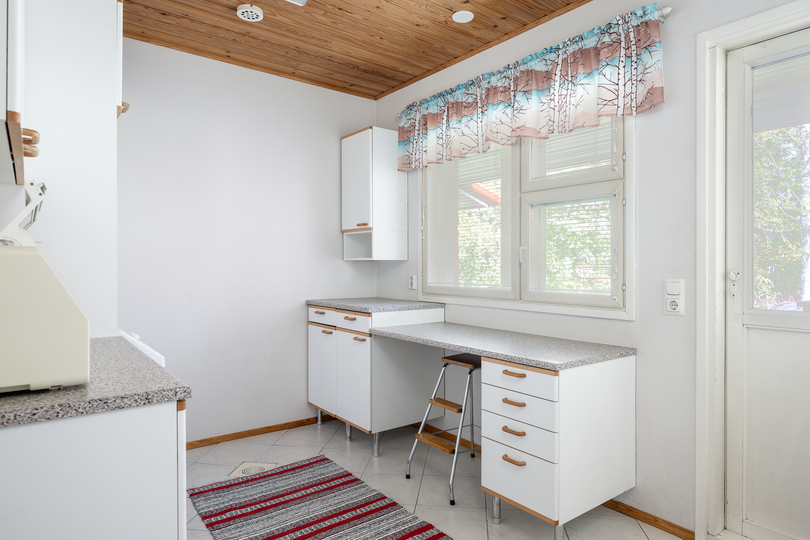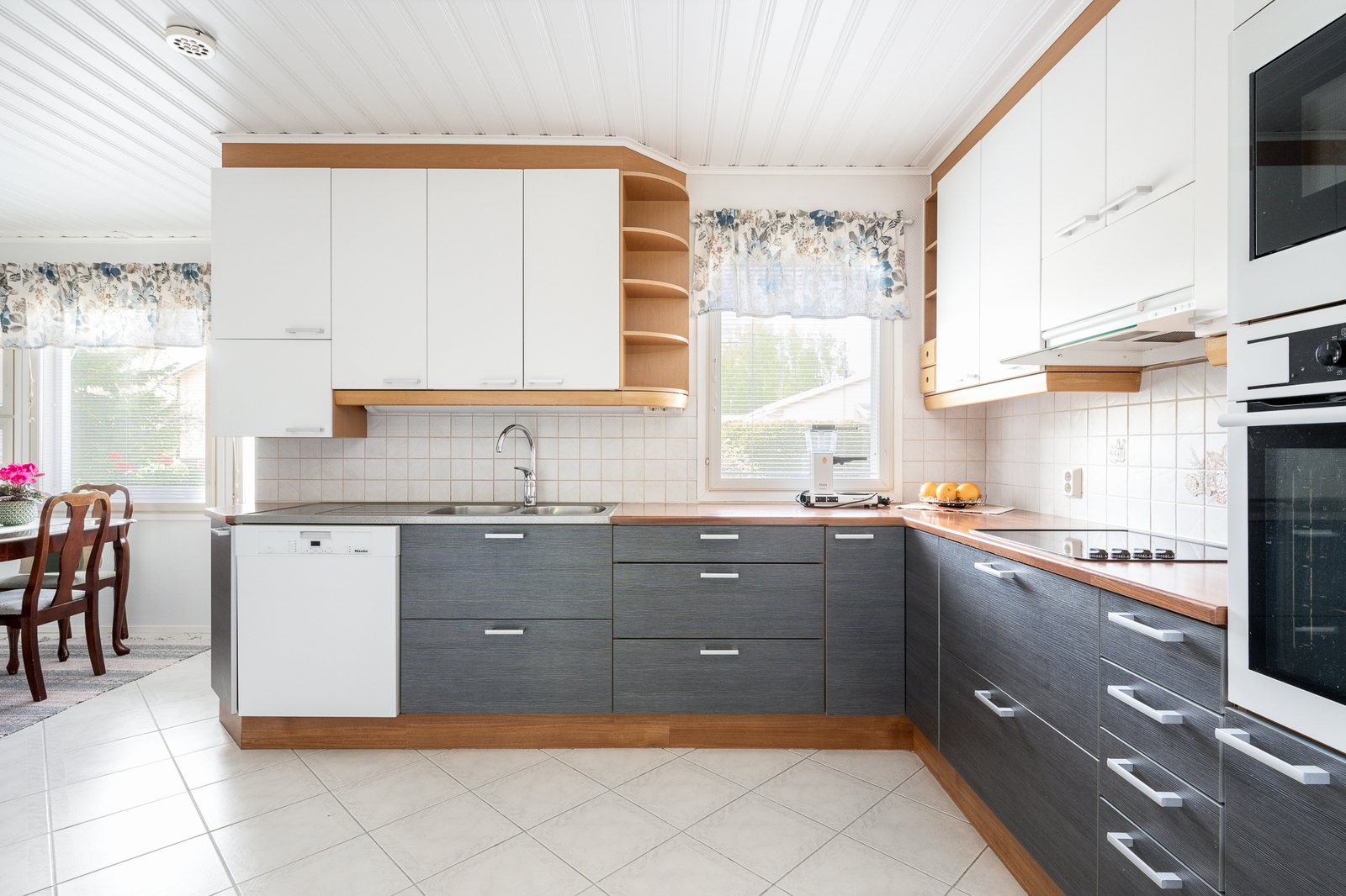 Liesi (Keraaminen liesi ja erillisuuni), työtasot (laminaatti), seinät (lasikuitutapetti), lattiat (laatta), astianpesukone, erillisuuni, mikroaaltouuni, jää-viileäkaappi, erillinen pakastin ja liesituuletin / hormi |