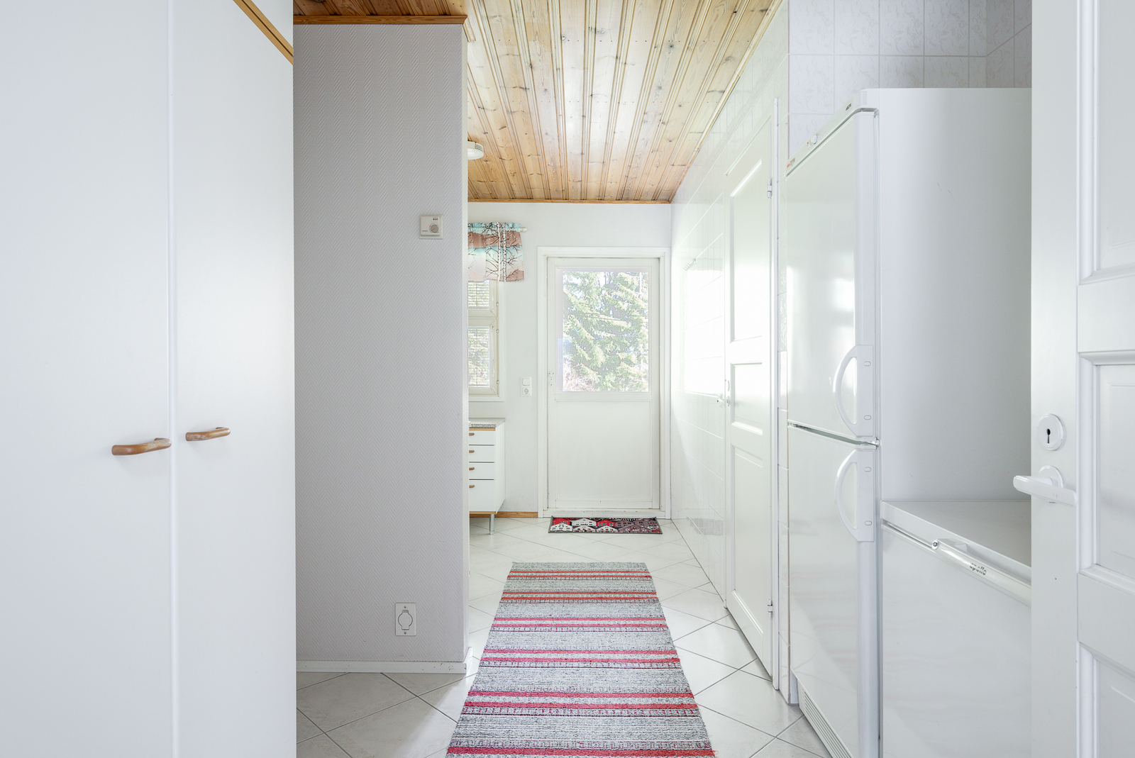 Kuivauskaappi, silityspöytä/taso, pesukoneliitäntä, keskuspölynimuri, lattiakaivo, pöytätaso ja pyykkikaapit, lattiat (laatta), seinät (lasikuitutapetti ja kaakeli) |