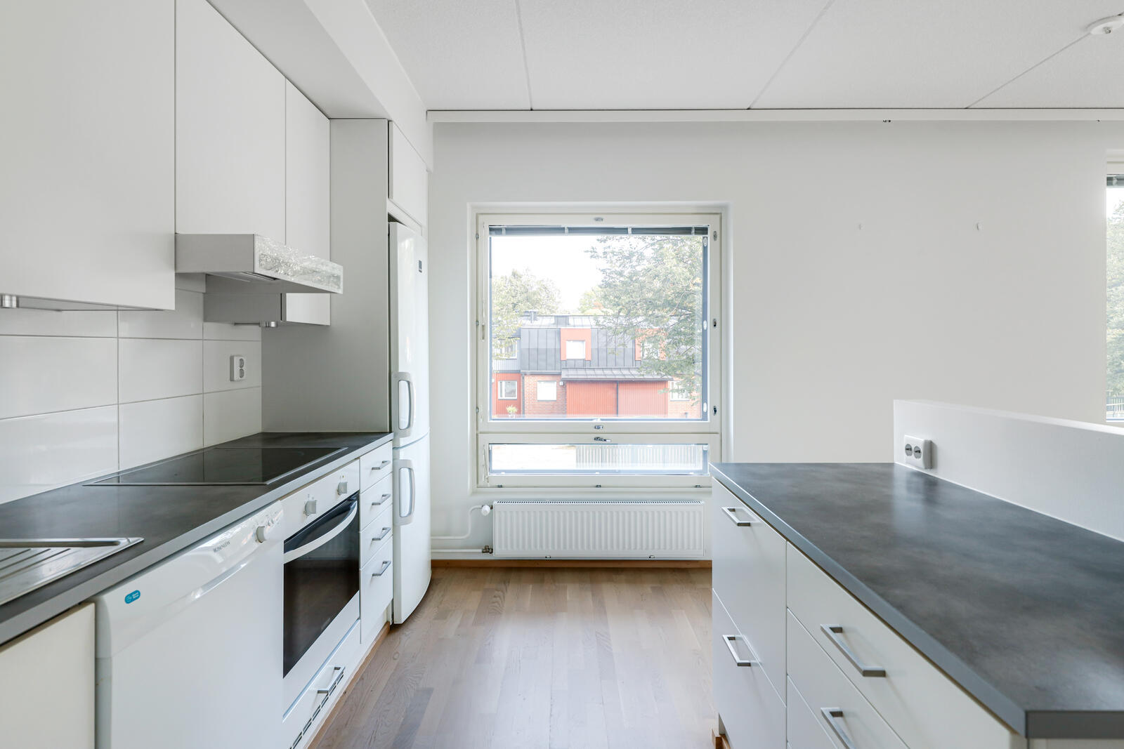 | Keittiön kuvaus | Liesi (Keraaminen liesi ja erillisuuni), työtasot (laminaatti), seinät (maali), lattiat (parketti), jääkaappipakastin, erillisuuni, liesituuletin, astianpesukone ja kiinteät valaisimet |