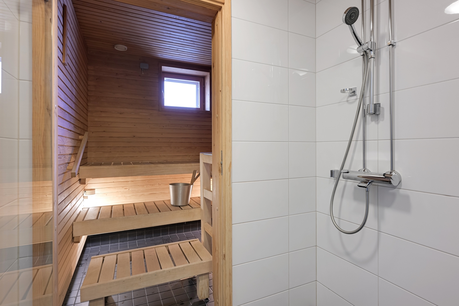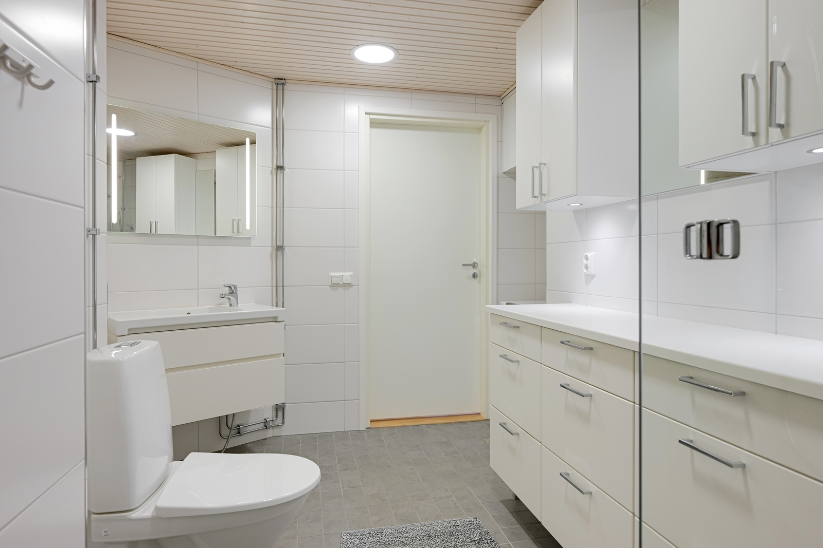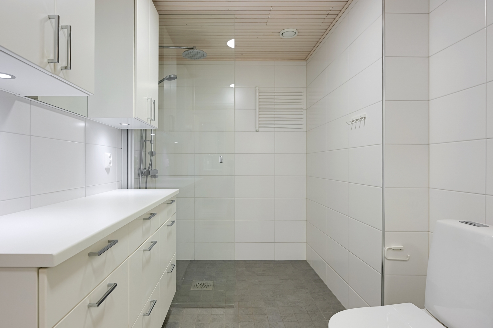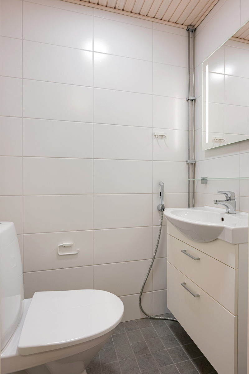 WC-istuin, pesukoneliitäntä, peili, suihkuseinä, lattialämmitys ja suihku, seinät (kaakeli), lattiat (laatta) |
