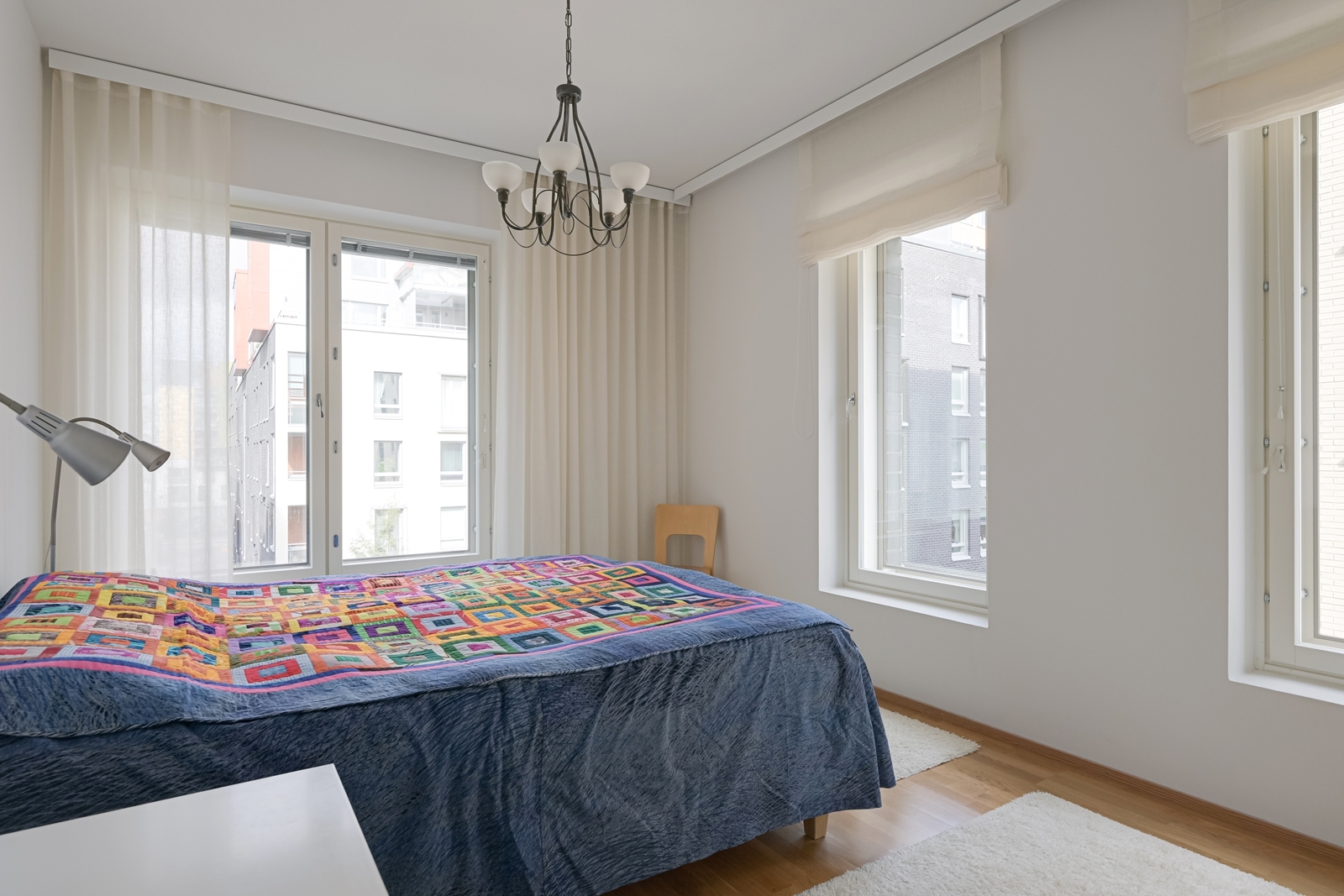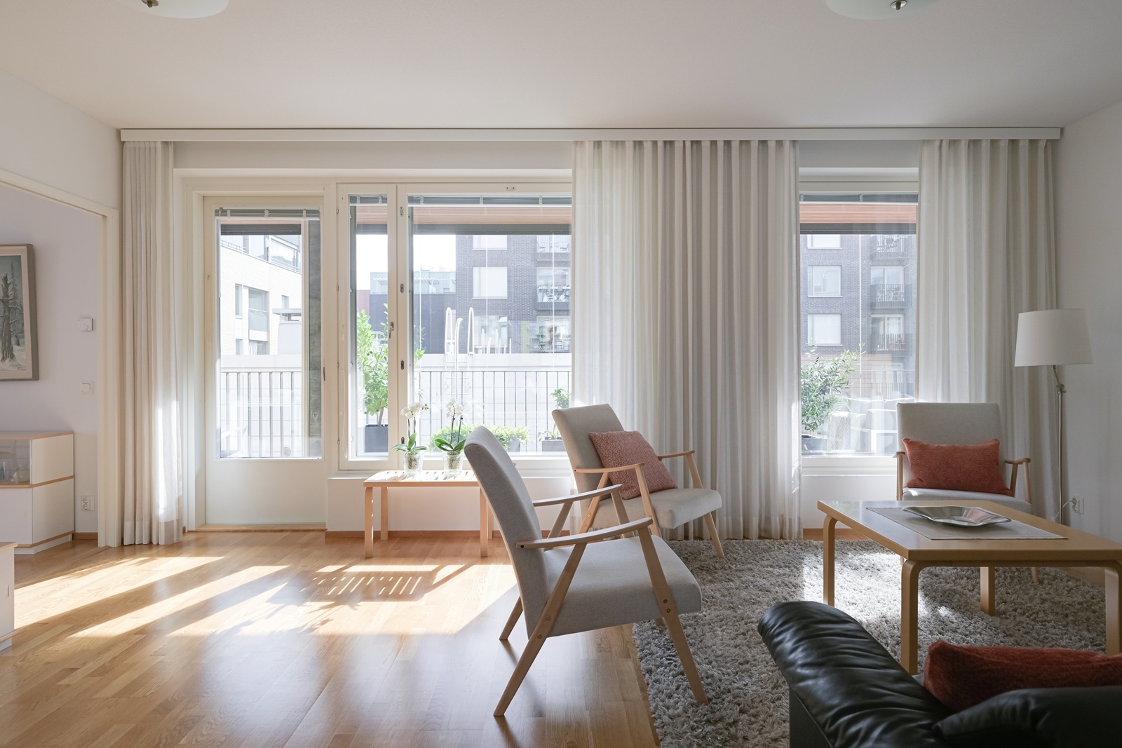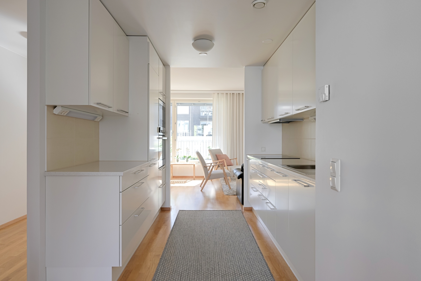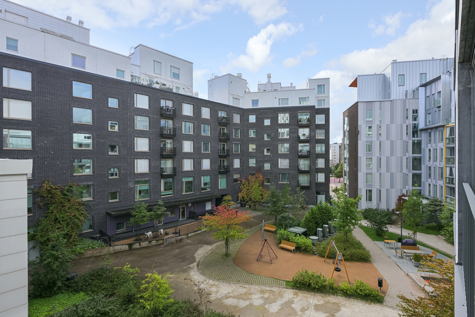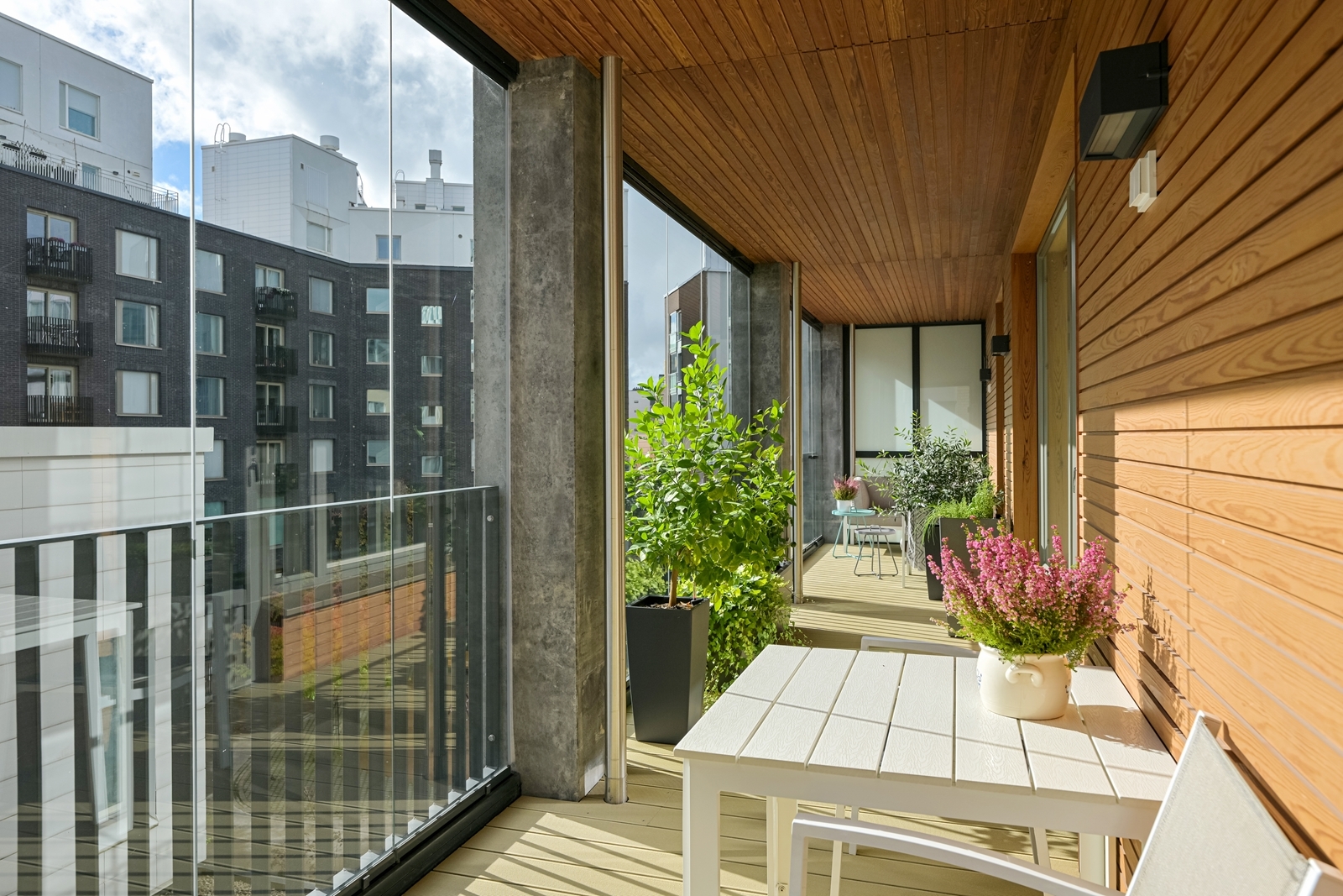 Vuonna 2014 valmistuneessa Hitas-taloyhtiössä sijaitseva huoneisto hurmaa avaralla tunnelmallaan ja suurilla ikkunoilla, joita avautuu kolmeen eri suuntaan. Toimiva ja hyvin varusteltu keittiö, jonka yhteydessä on luonteva ruokailutila. Olohuoneesta ja toisesta makuuhuoneesta on käynti koko huoneiston levyiselle hulppealle lasitetulle terassille,