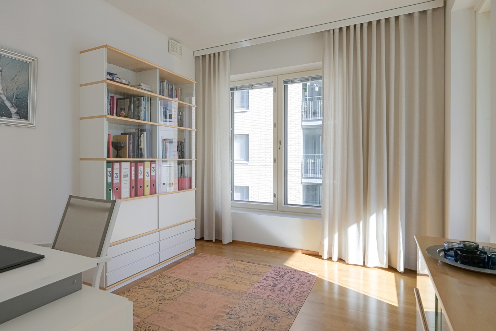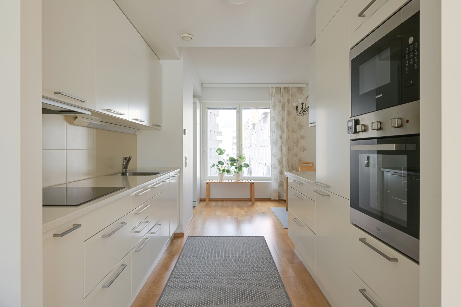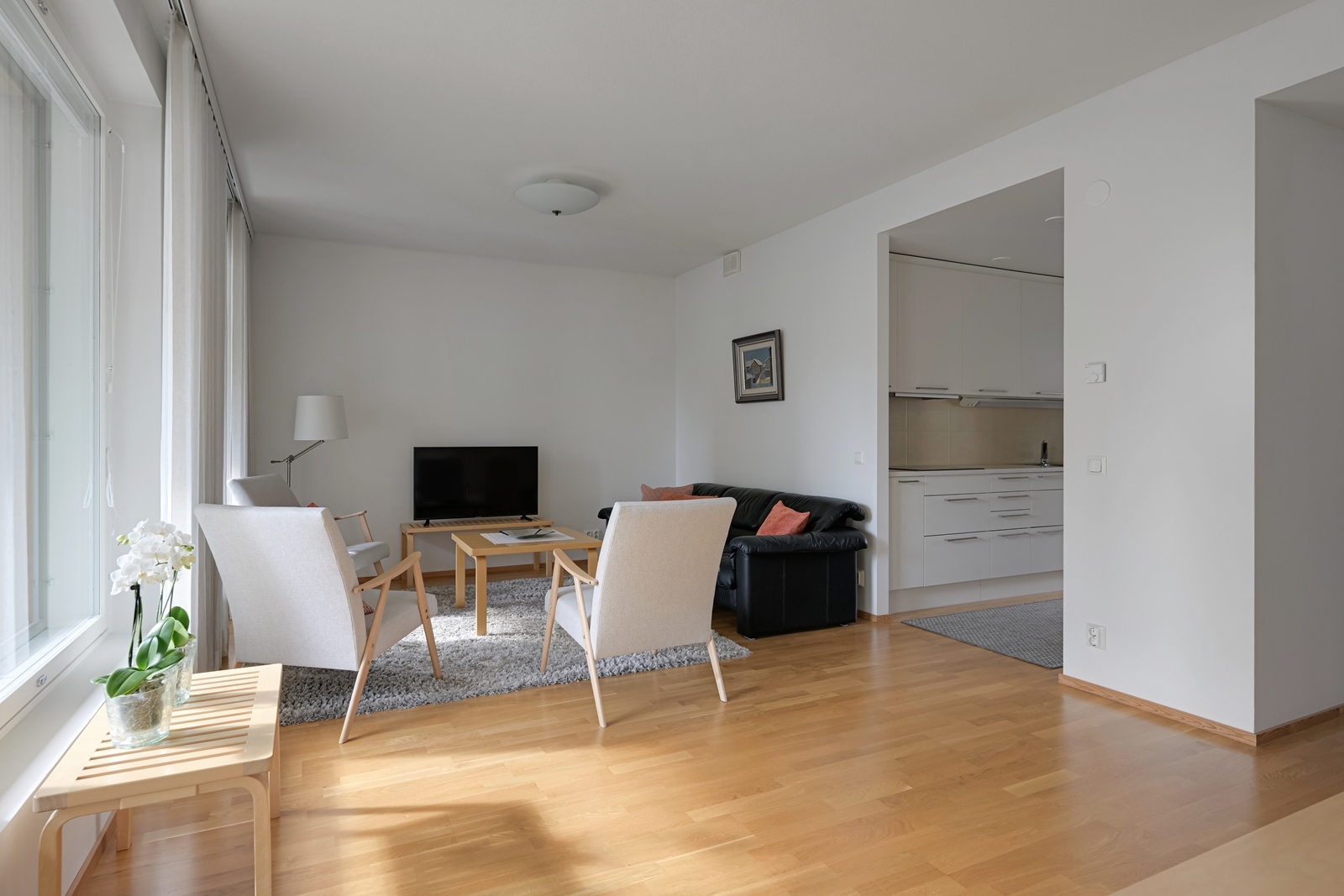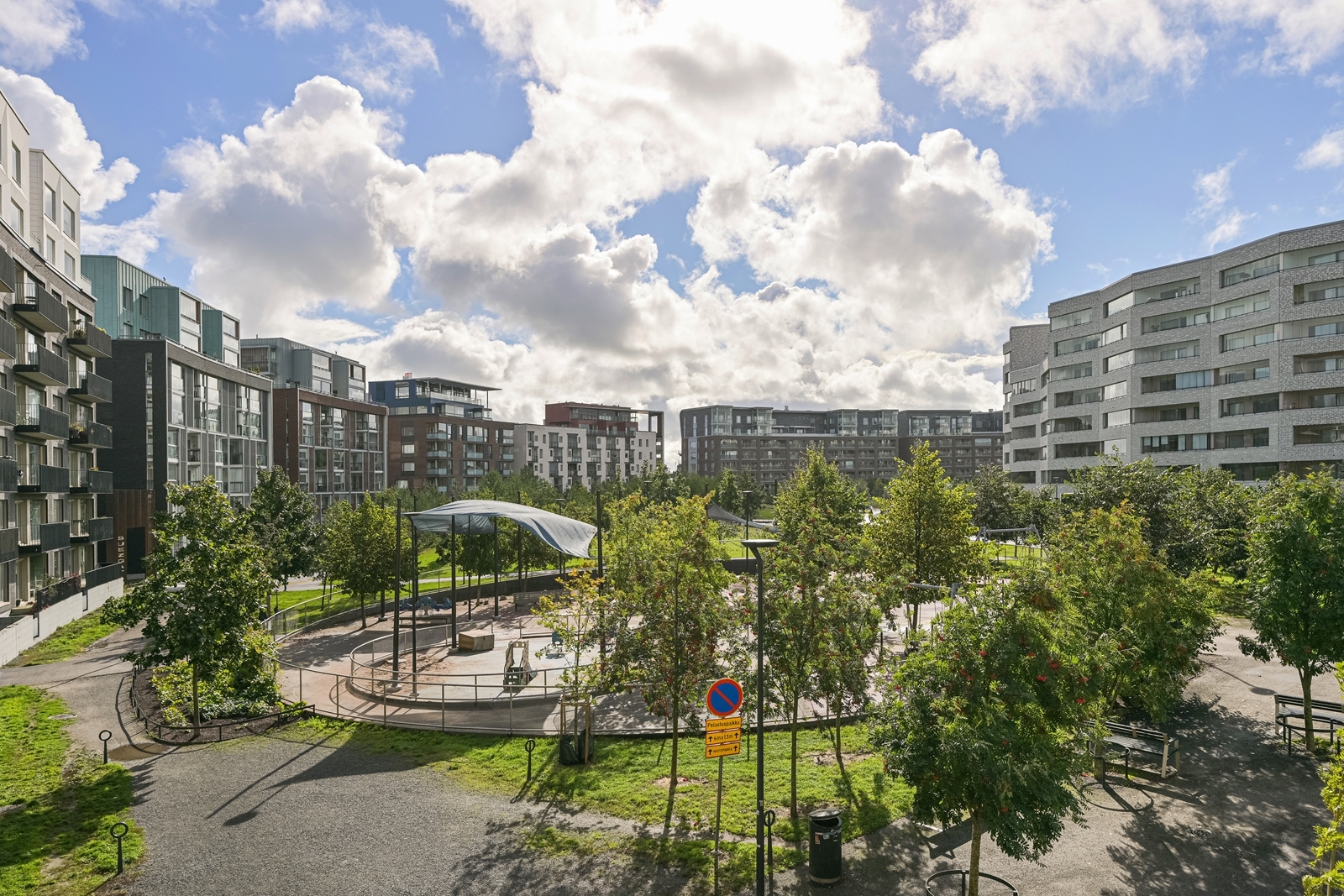 Vuonna 2014 valmistuneessa Hitas-taloyhtiössä sijaitseva huoneisto hurmaa avaralla tunnelmallaan ja suurilla ikkunoilla, joita avautuu kolmeen eri suuntaan. Toimiva ja hyvin varusteltu keittiö, jonka yhteydessä on luonteva ruokailutila. Olohuoneesta ja toisesta makuuhuoneesta on käynti koko huoneiston levyiselle hulppealle lasitetulle terassille,