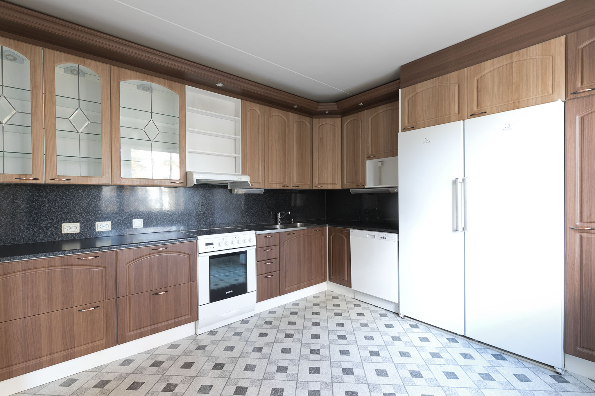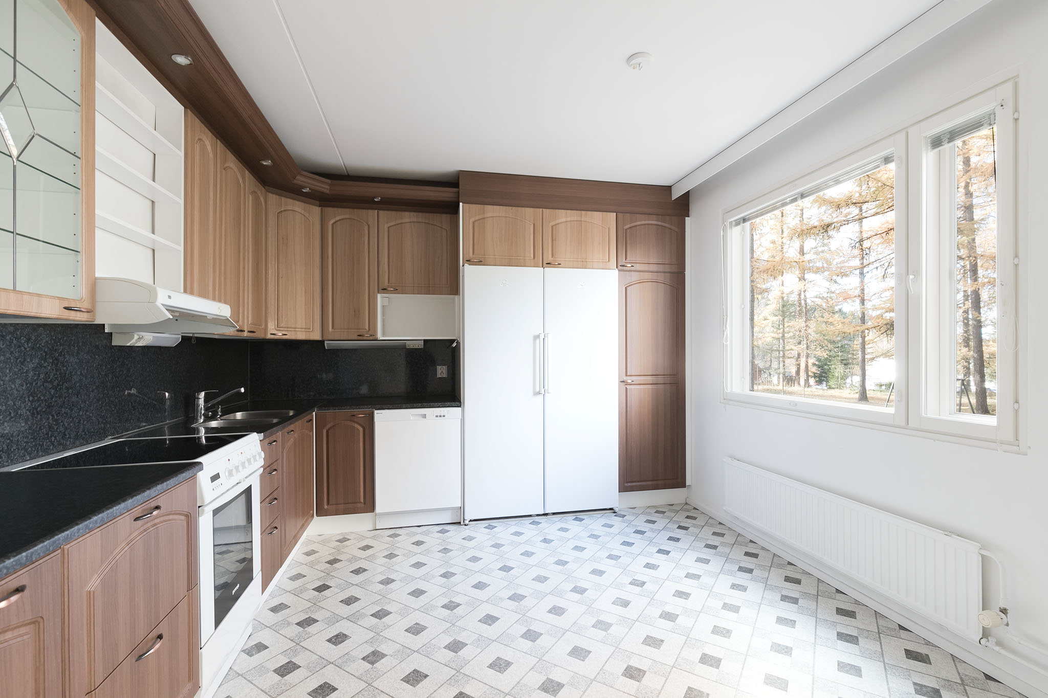 | Keittiön kuvaus | Liesi (Keraaminen liesi ja uuni pyrolyysitoiminnolla), työtasot (laminaatti), seinät (maali ja välitilassa levy), lattiat (muovimatto), jääkaappi, astianpesukone, liesi, liesituuletin ja pakastinkaappi |