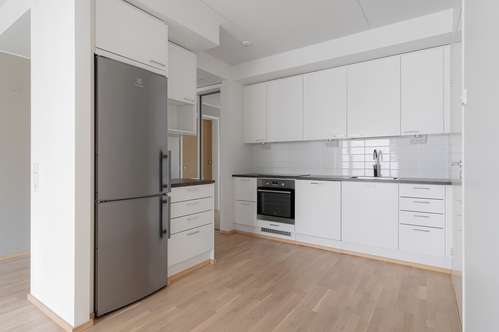 Liesi (liesitaso, erillisuuni), työtasot (laminaatti), seinät (laatta ja maali), lattiat (laminaatti), astianpesukone, jääkaappipakastin, erillisuuni ja liesitaso |