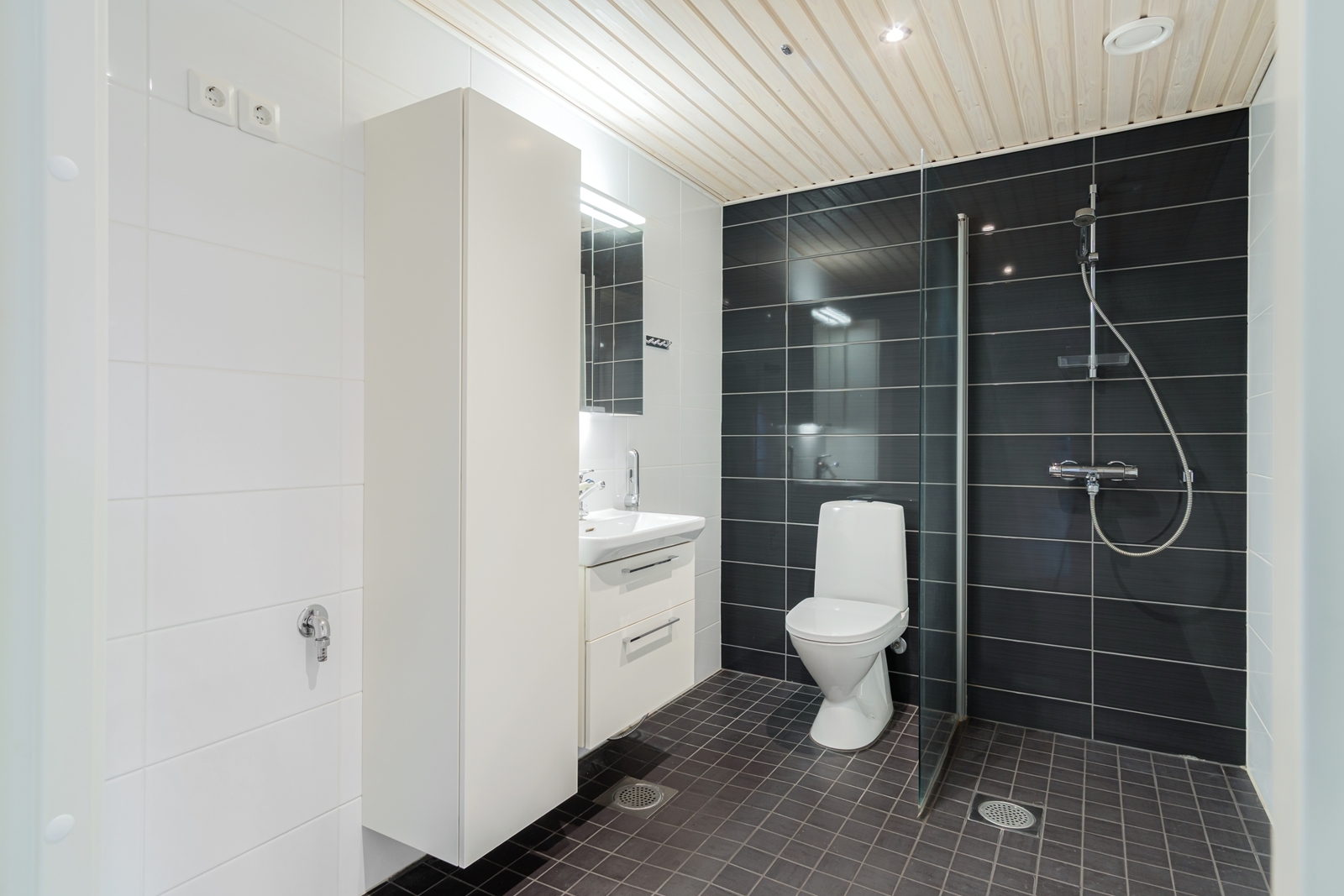 Suihkuseinä, pesukoneliitäntä, lattialämmitys, peilikaappi, wc-istuin, suihku ja kiinteät valaisimet, seinät (kaakeli), lattiat (laatta) |