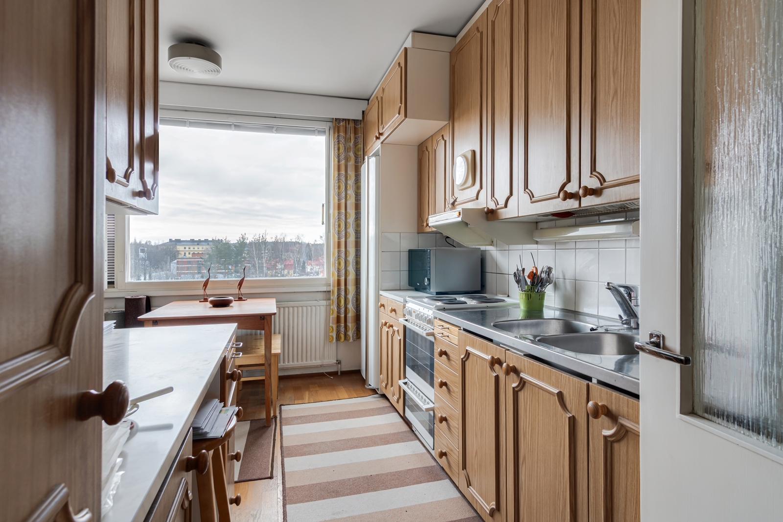 | Keittiön kuvaus | Liesi (sähköliesi), työtasot (laminaatti ja metalli), seinät (maali), lattiat (parketti), erillinen pakastin (parvekkeella), liesituuletin (liesikupu), liesi, jää-viileäkaappi ja varattu paikka astianpesukoneelle, kiinteät valaisimet |