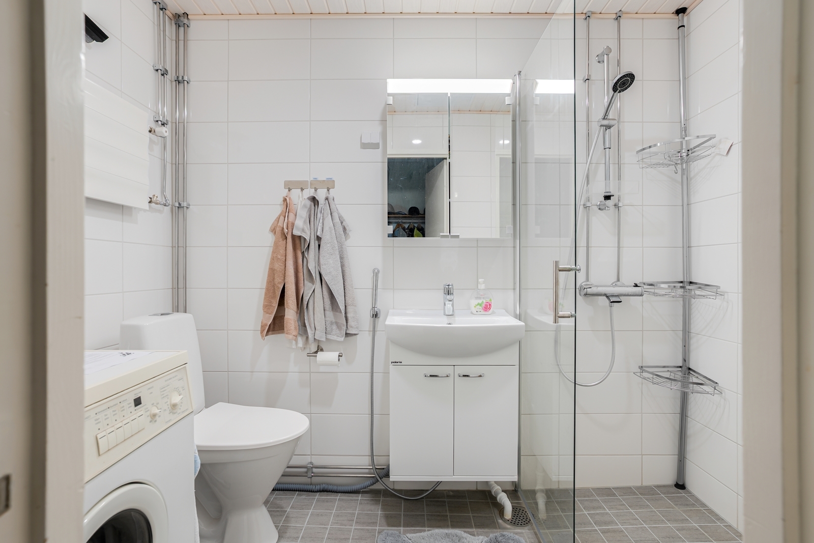 | Kylpyhuoneen kuvaus | Paneelikatto Varustus: suihkuseinä (taittuva), pesukoneliitäntä, lattialämmitys, wc-istuin, suihku, peilikaappi, kiinteät valaisimet, kylpyhuonekaapisto (pesuallaskaappi). Lattia: laatta. Seinät: kaakeli. |