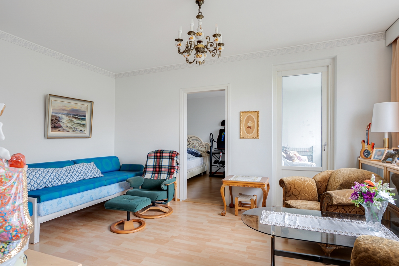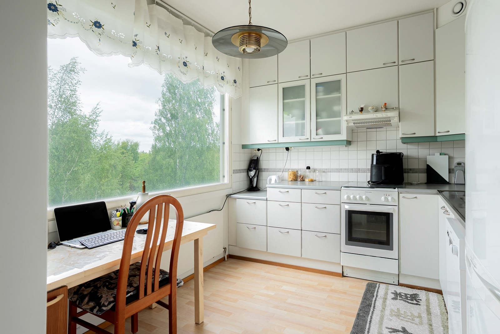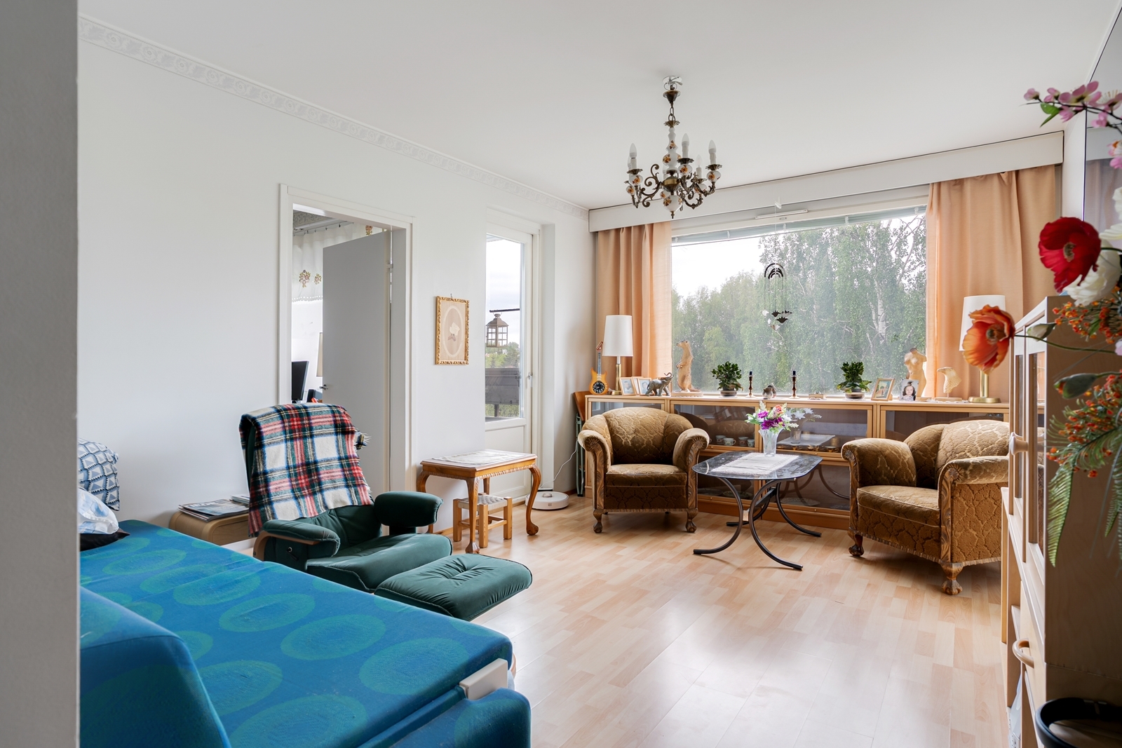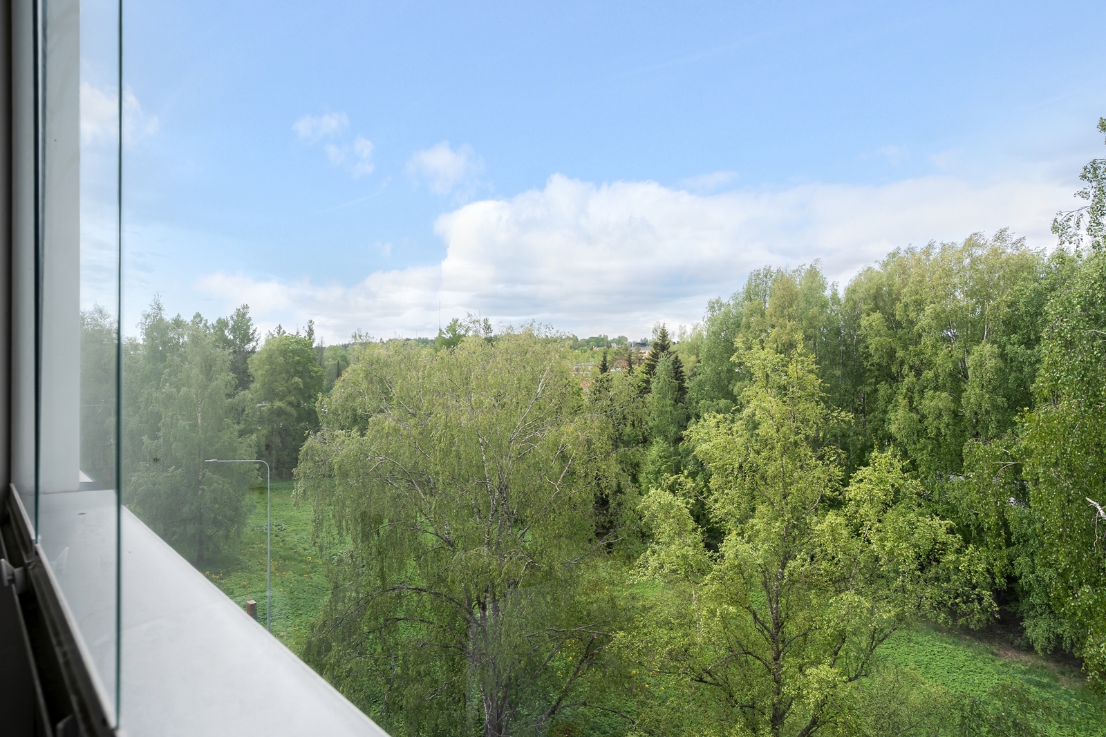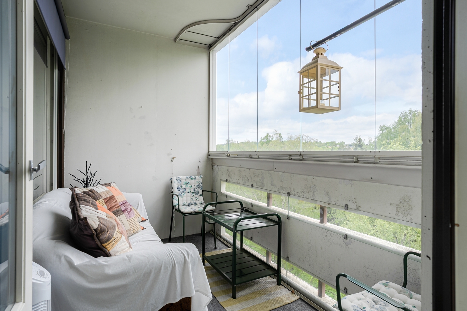 Valo tulvii sisään suurista ikkunoista, ja lasitetulta parvekkeelta avautuu mukavat näkymät vehreälle alueelle. Parveke toimii kesäisin kuin toinen olohuone.