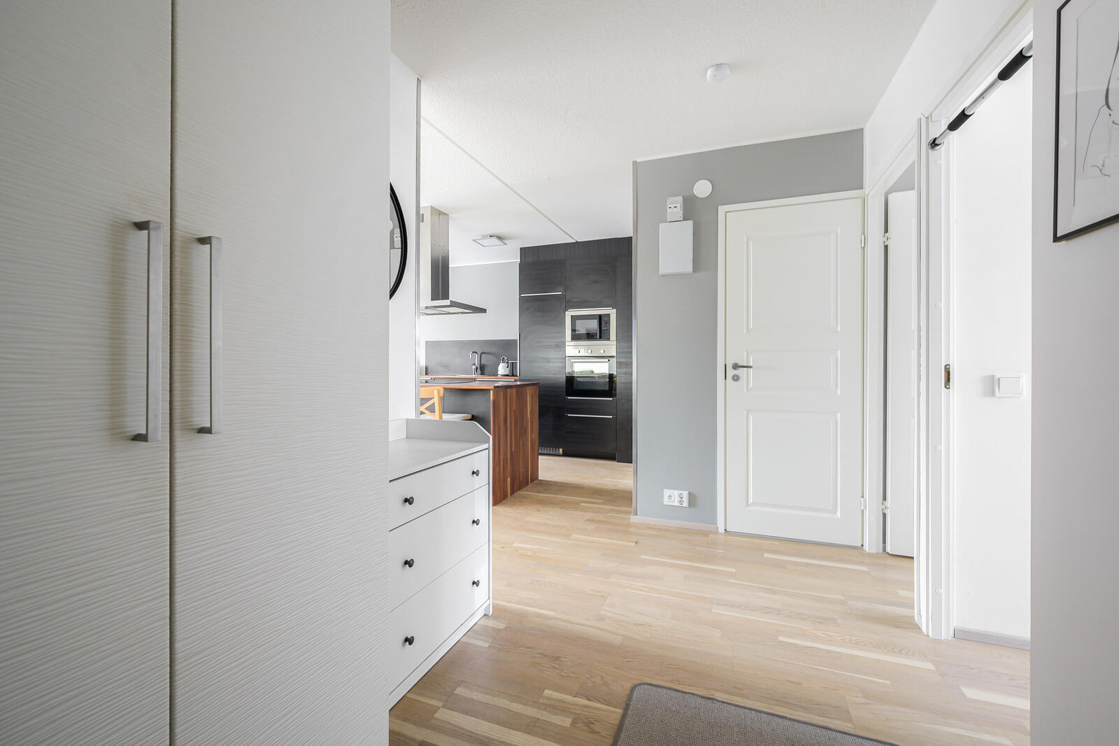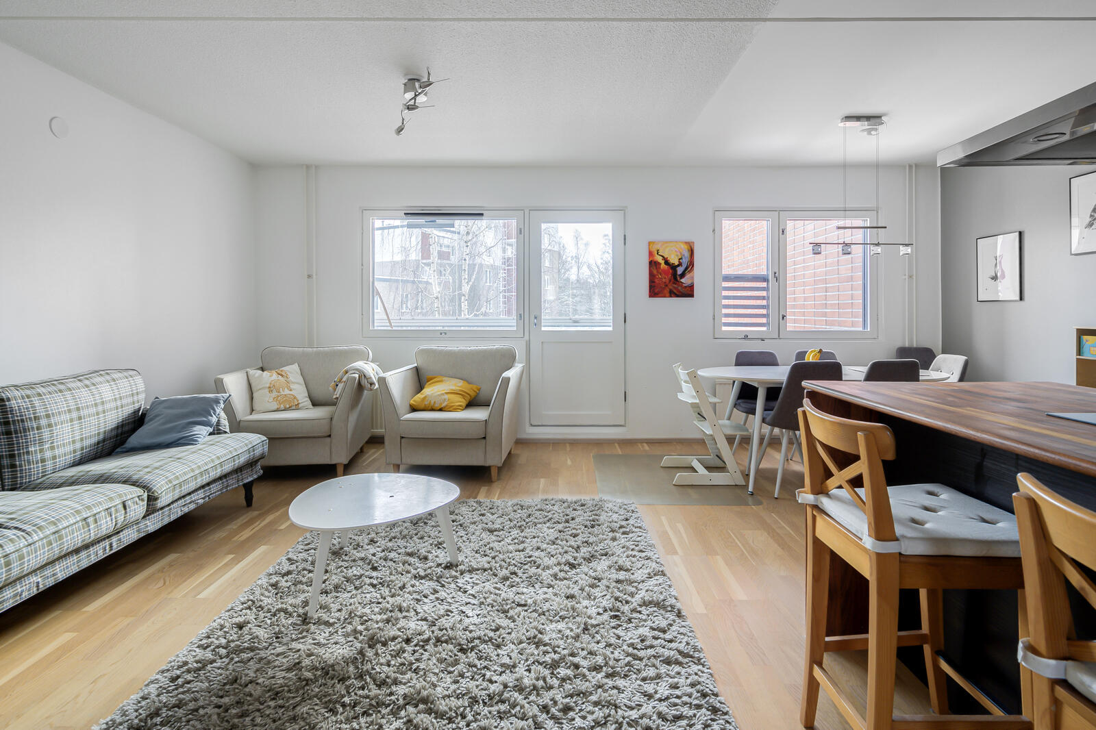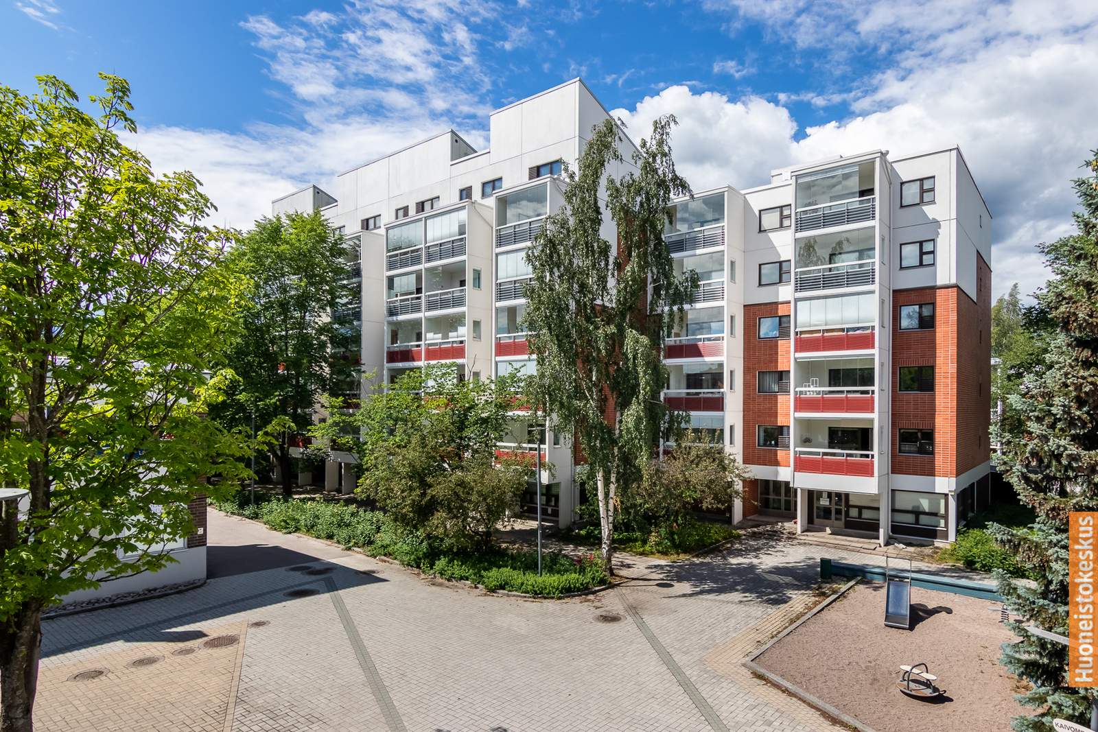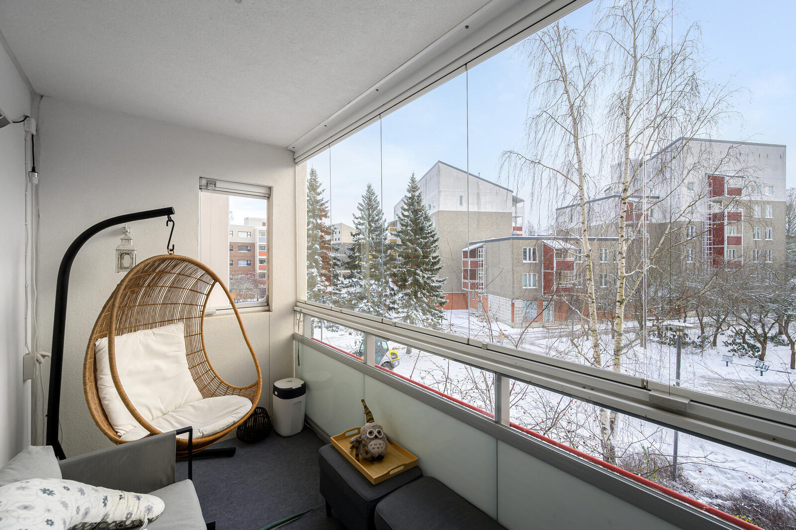 This apartment has been renovated thoroughly and is in very good shape. It is on the 2. floor in an elevator house. It has functioning layout. Open kitchen and living room are heart of home. Glazed balcony toward sunny South. Good location. Schools, day care centers, services, busses near. Walking distance to Entresse Shopping Center, public swimming, gym and train station. Chance of a lifetime!