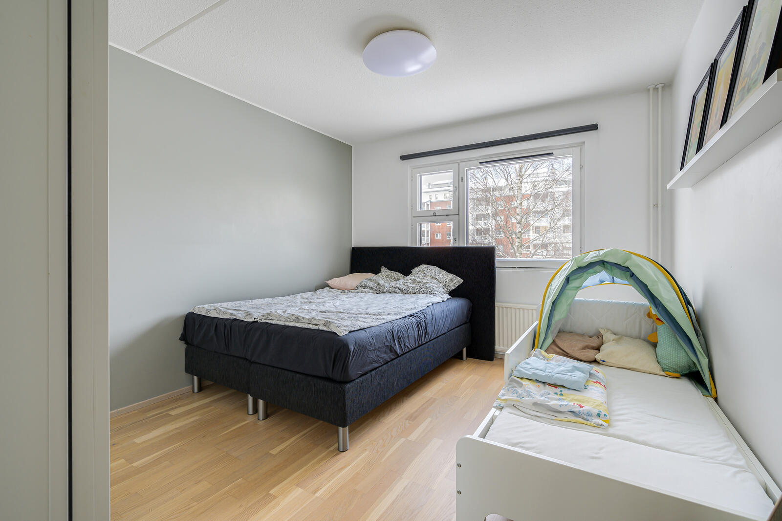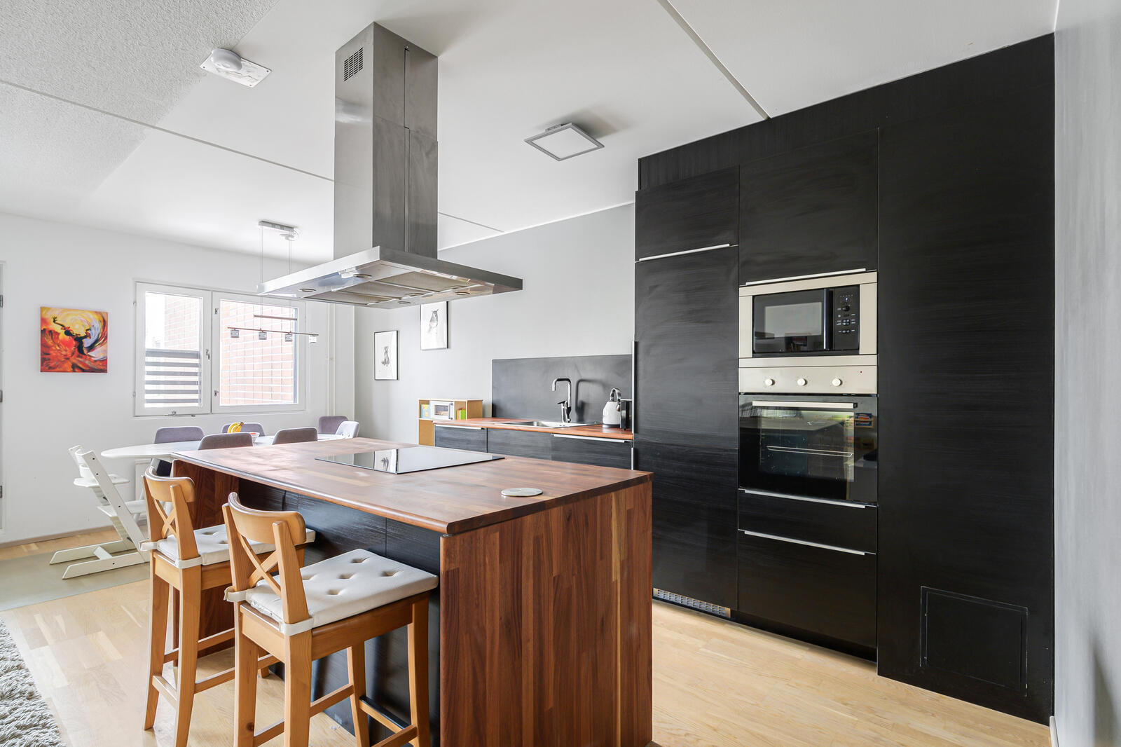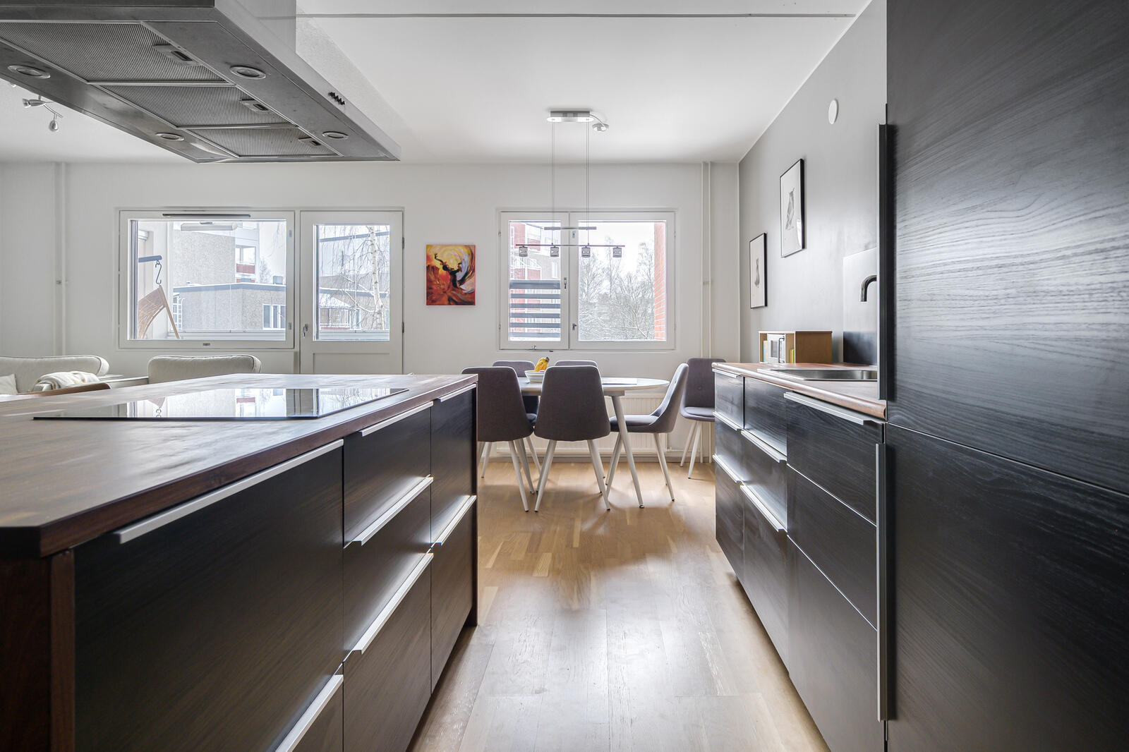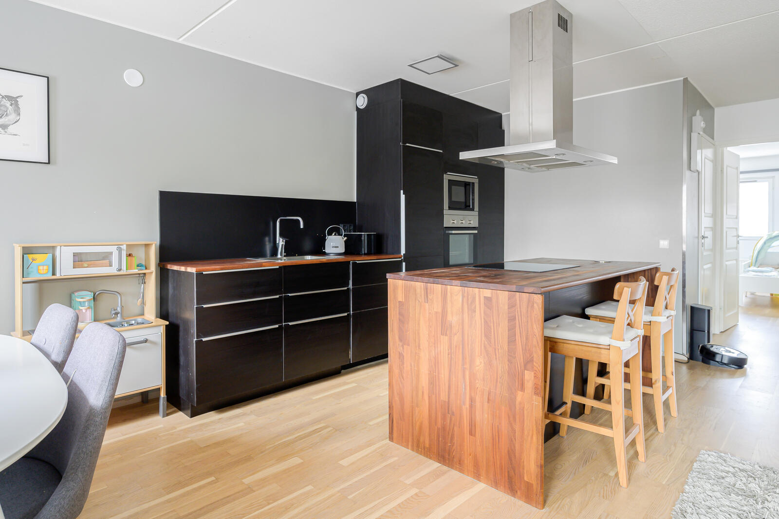 This apartment has been renovated thoroughly and is in very good shape. It is on the 2. floor in an elevator house. It has functioning layout. Open kitchen and living room are heart of home. Glazed balcony toward sunny South. Good location. Schools, day care centers, services, busses near. Walking distance to Entresse Shopping Center, public swimming, gym and train station. Chance of a lifetime!