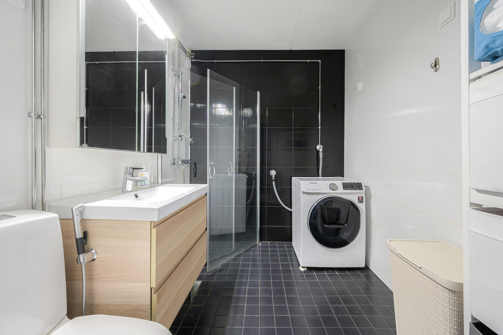 | Kylpyhuoneen kuvaus | Suihkukaappi (lasiovet), peilikaappi, pesuallas, allaslaatikosto, pesukoneliitäntä, wc-istuin, kokonaan laatoitettu, mukavuuslattialämmitys. |