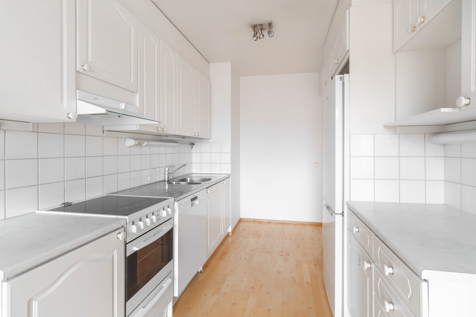 | Keittiön kuvaus | Liesi (sähköliesi), työtasot (laminaatti), seinät (maali), lattiat (parketti), jääkaappipakastin ja liesi |