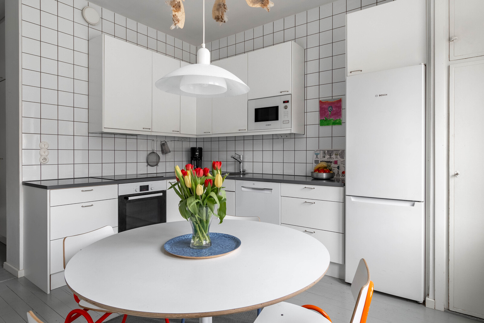 | Keittiön kuvaus | Liesi (Keraaminen liesi ja erillisuuni), seinät (maali), lattiat (lauta), erillisuuni, mikroaaltouuni, liesituuletin, jääkaappipakastin ja astianpesukone, keittiön välitila: laatta valkoiset kaapistot, lankavetimet, komposiittitasot |