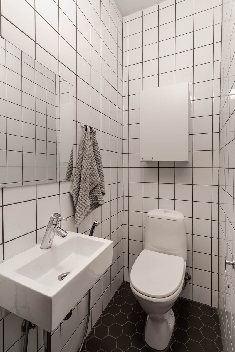 | WC-tilojen kuvaus | Bidee-suihku, seinät (Kaakeli), lattiat (Laatta), peili, seinäkaappi |