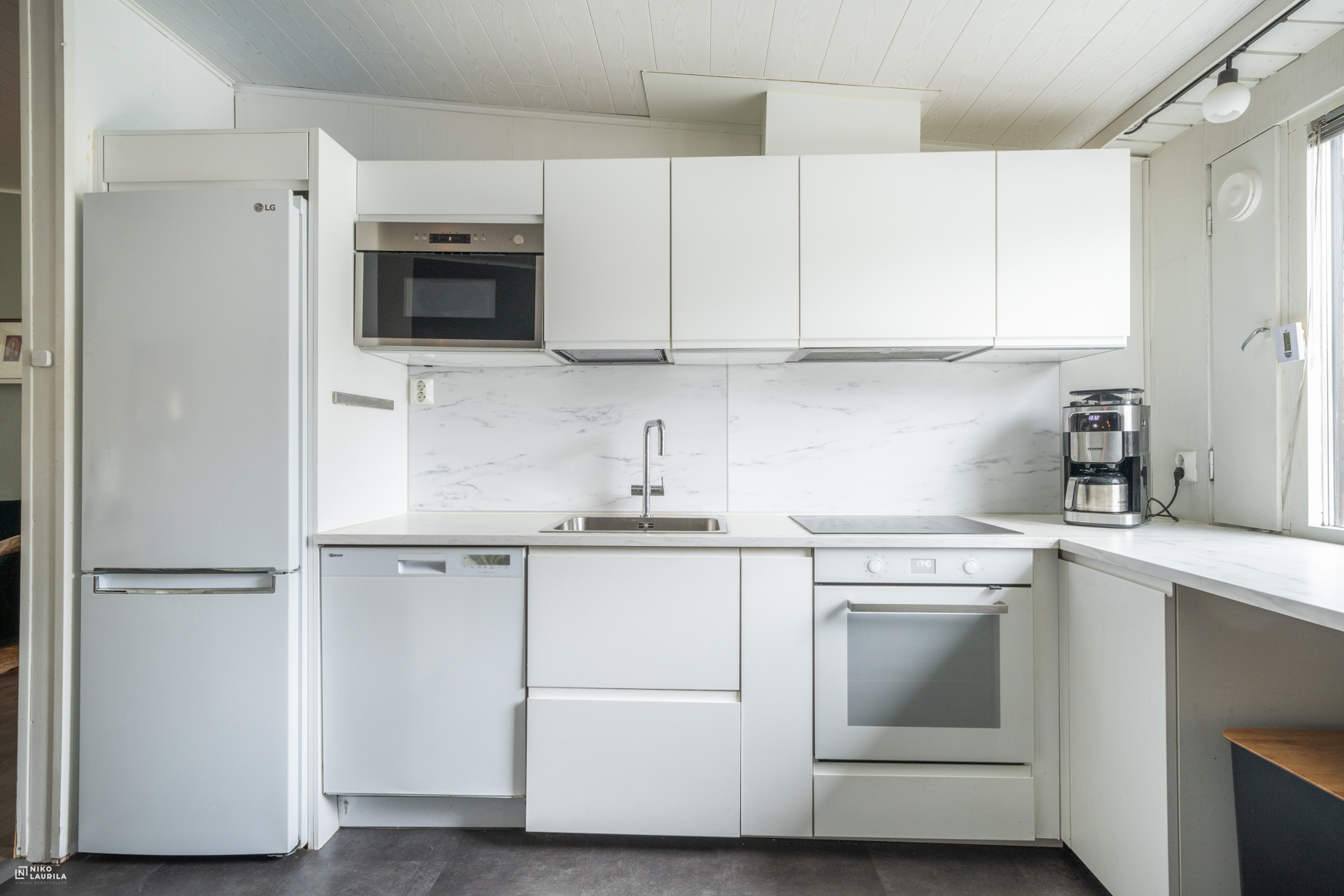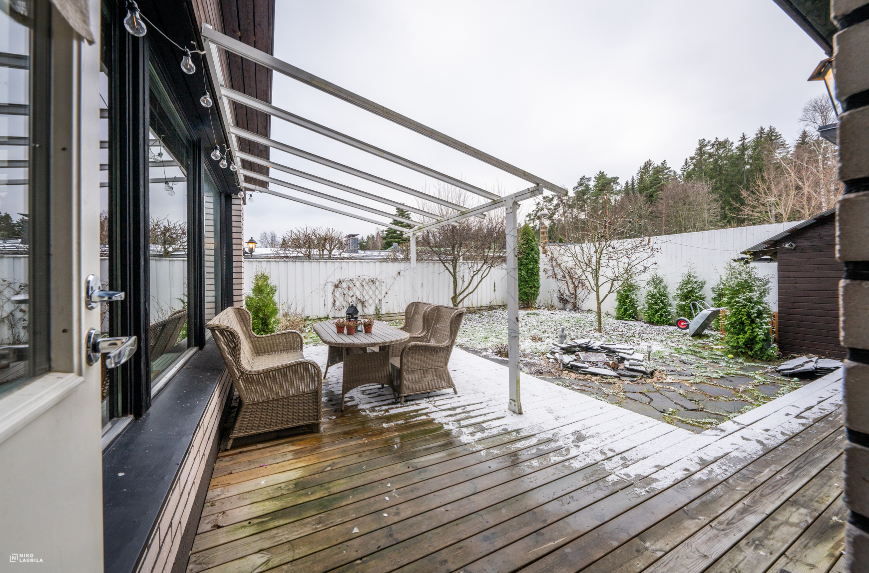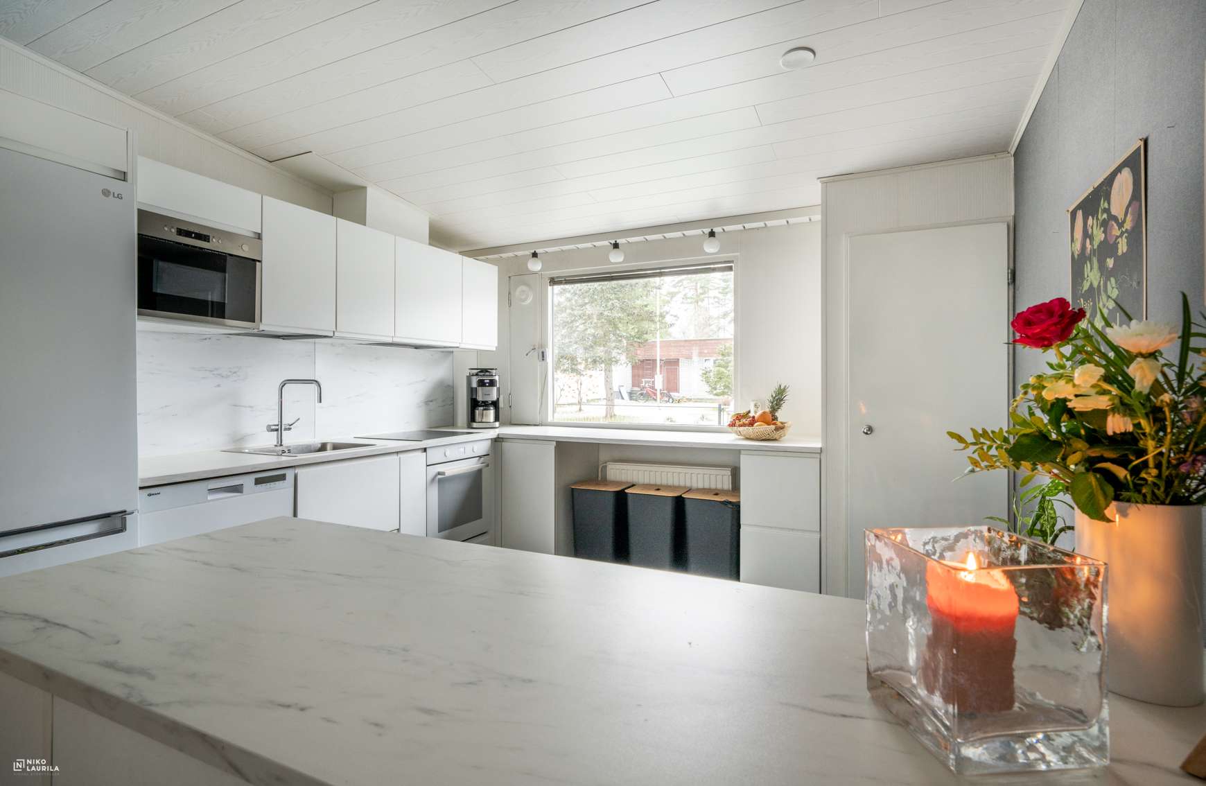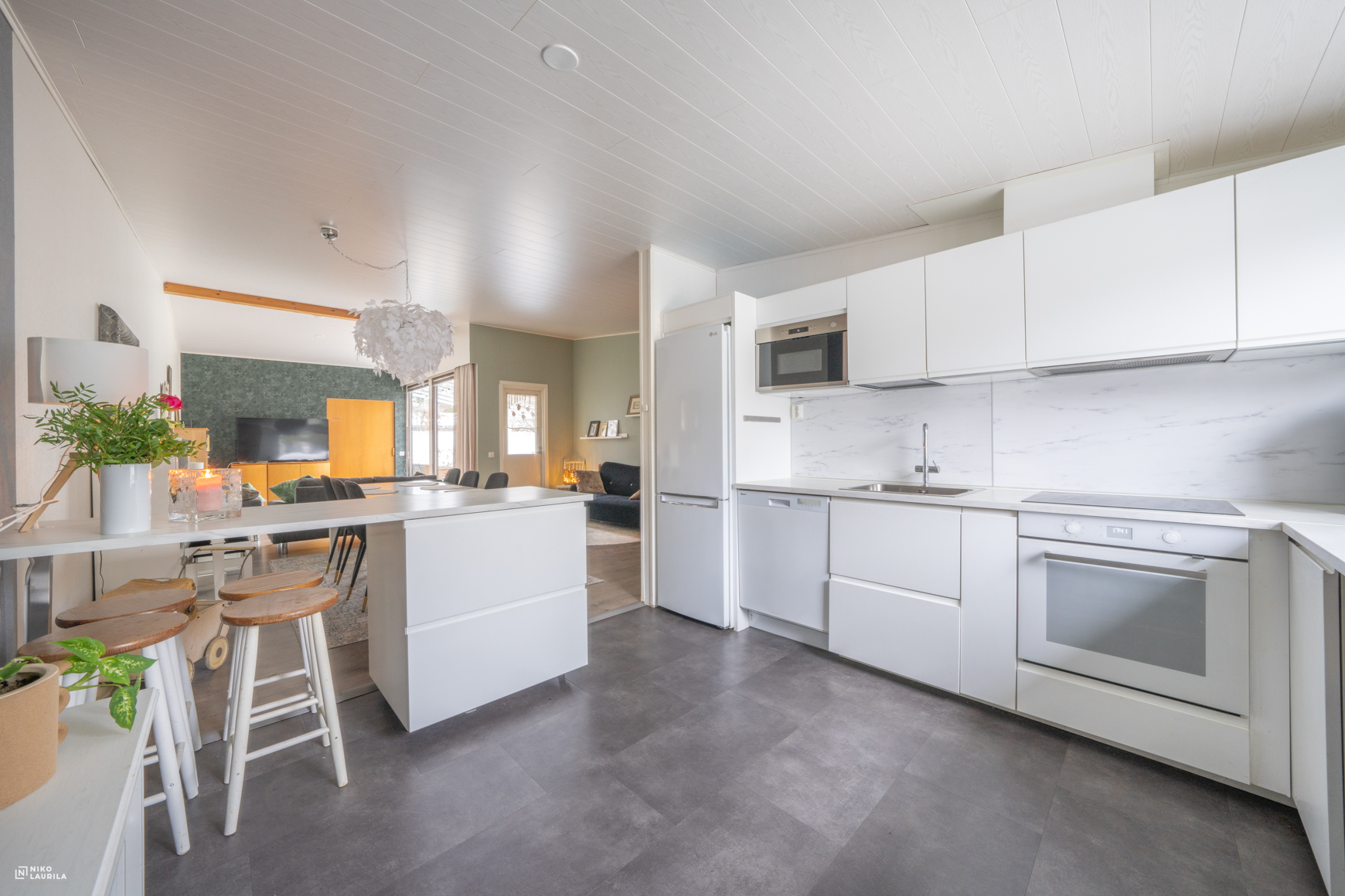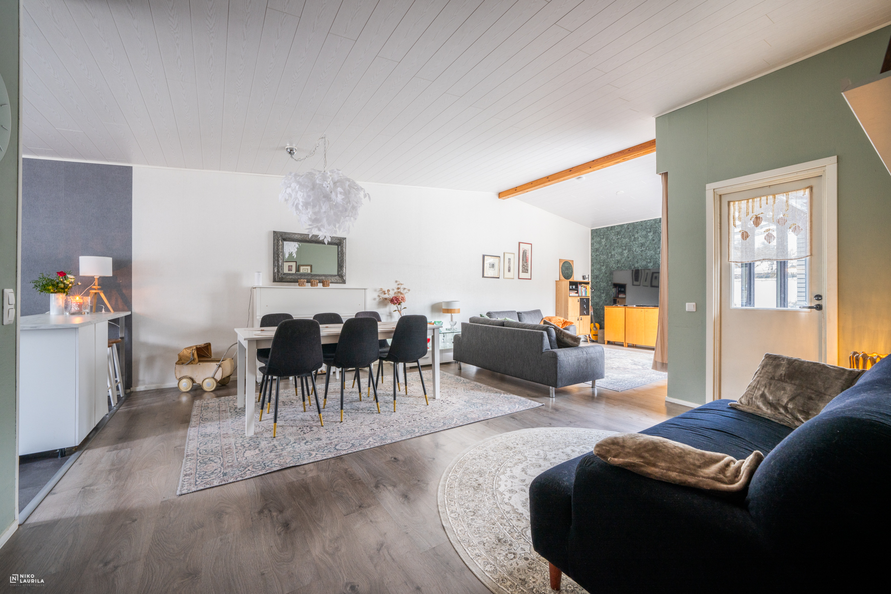 Avara ja valoisa keittiö-olohuonekokonaisuus korkealla sisäkatolla luo kodikkaan ja ilmavan tunnelman. Olohuoneesta suora kulku katetulle terassille ja suojaisalle pihalle, jossa on tilaa niin oleskeluun kuin puutarhan hoitoonkin. Talossa on lisäksi lämmin autotalli ja runsaasti säilytystilaa.