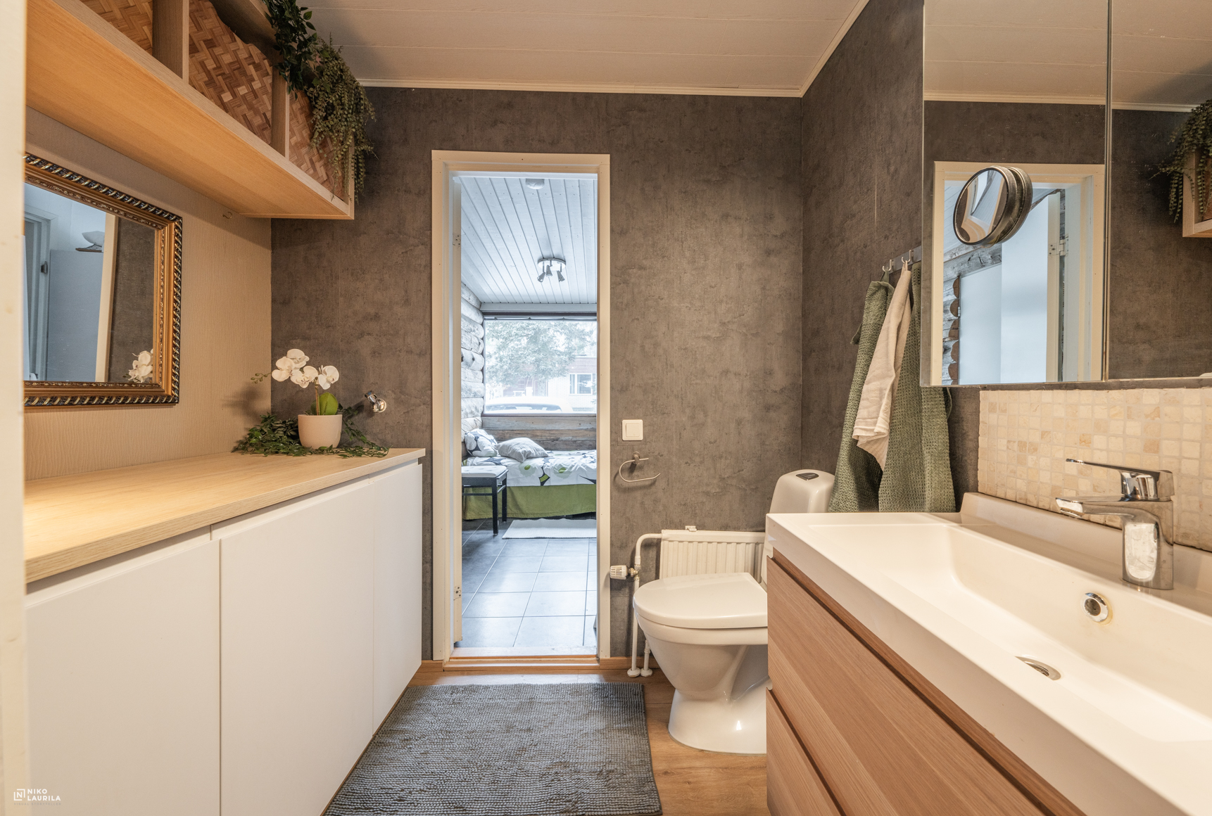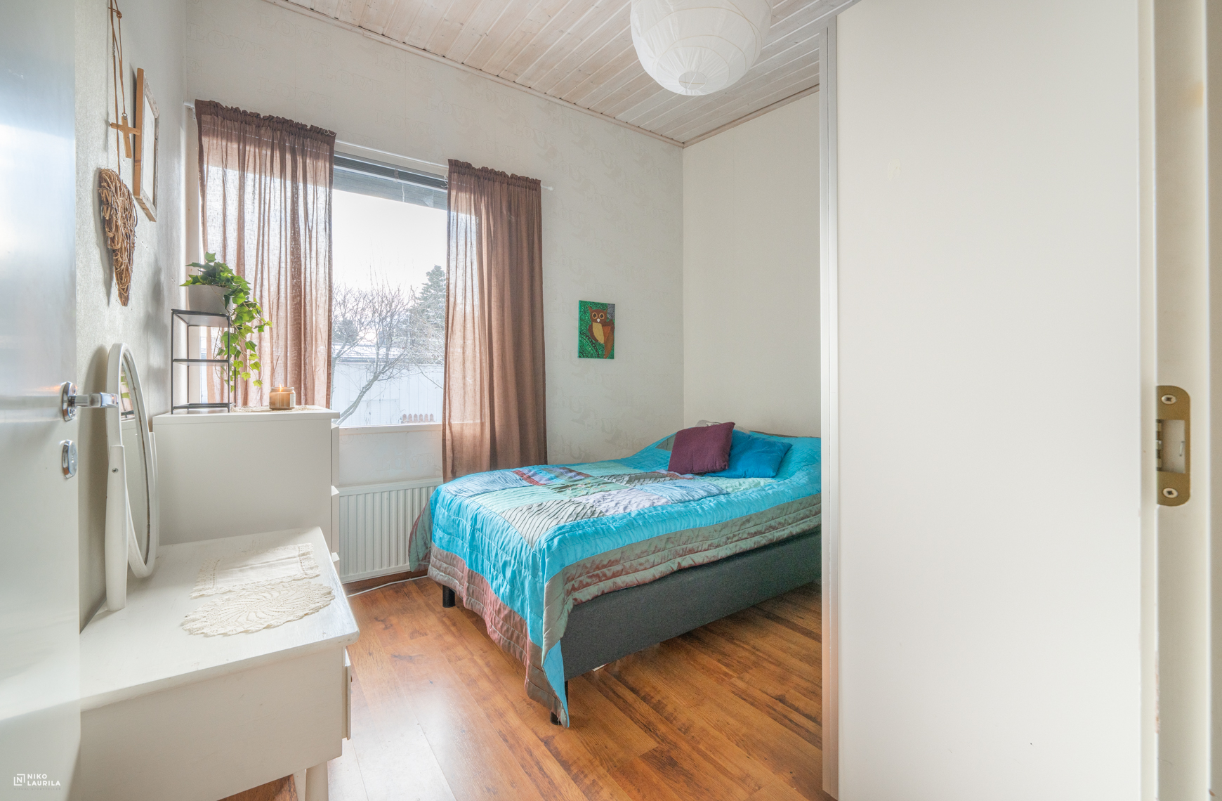 | Makuuhuoneen kuvaus | Seinät (maali, tapetti ja puu), lattiat (laminaatti ja laatta) |