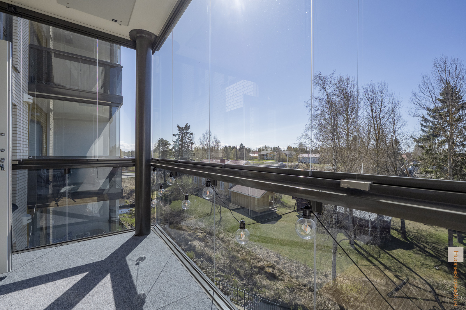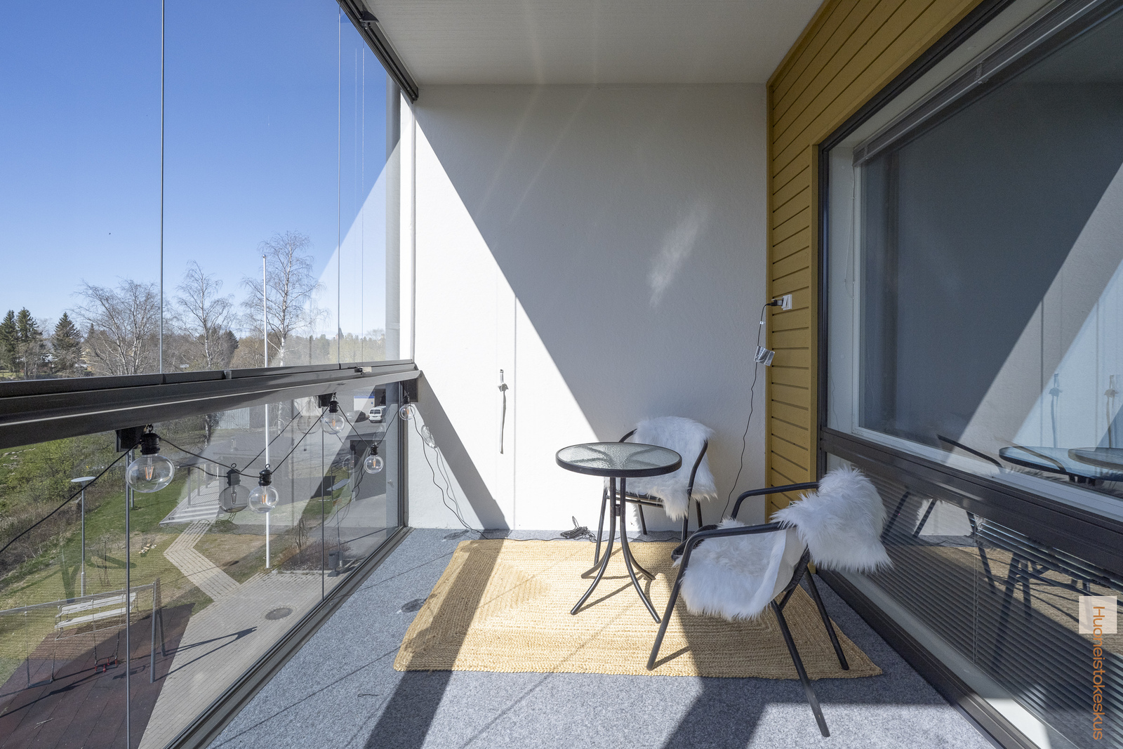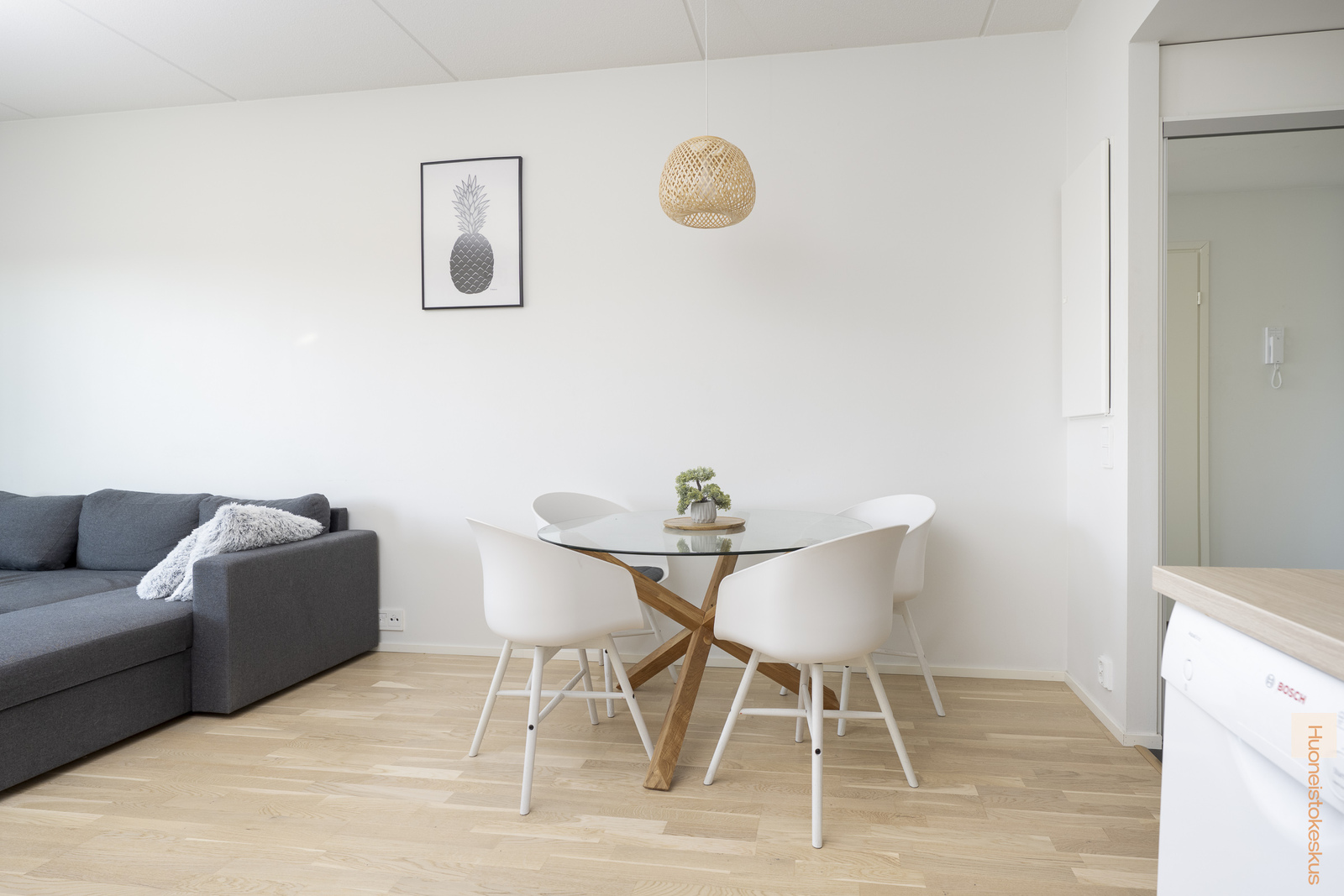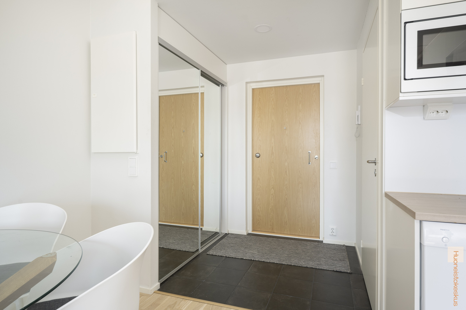 Siistikuntoinen kompakti asunto. Laatoitettu eteinen peilikaapistoilla. Sisäänkäynnin vieressä tilava pesuhuone ja oma sauna. Keittiö ja olohuone avointa tilaa, jonka jatkeena lasitettu parveke joen suuntaan. Säilytystilaa löytyy eteisen ja makuuhuoneen kaapistoista sekä alakerran lämpimästä varastosta. Taloyhtiöllä lisäksi yhteiset pyörävarastot ja puulämmitteinen ulkosauna, joka varattavissa omaan käyttöön.