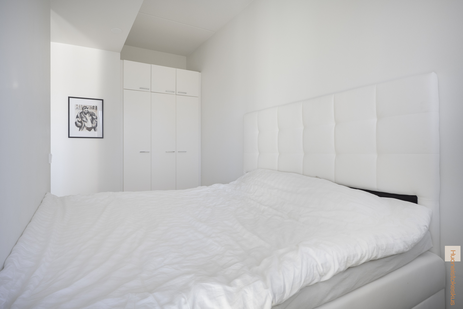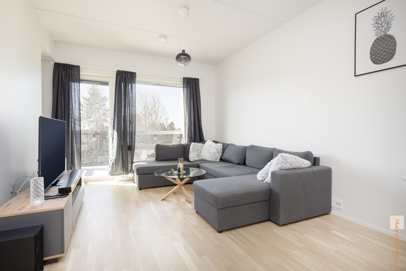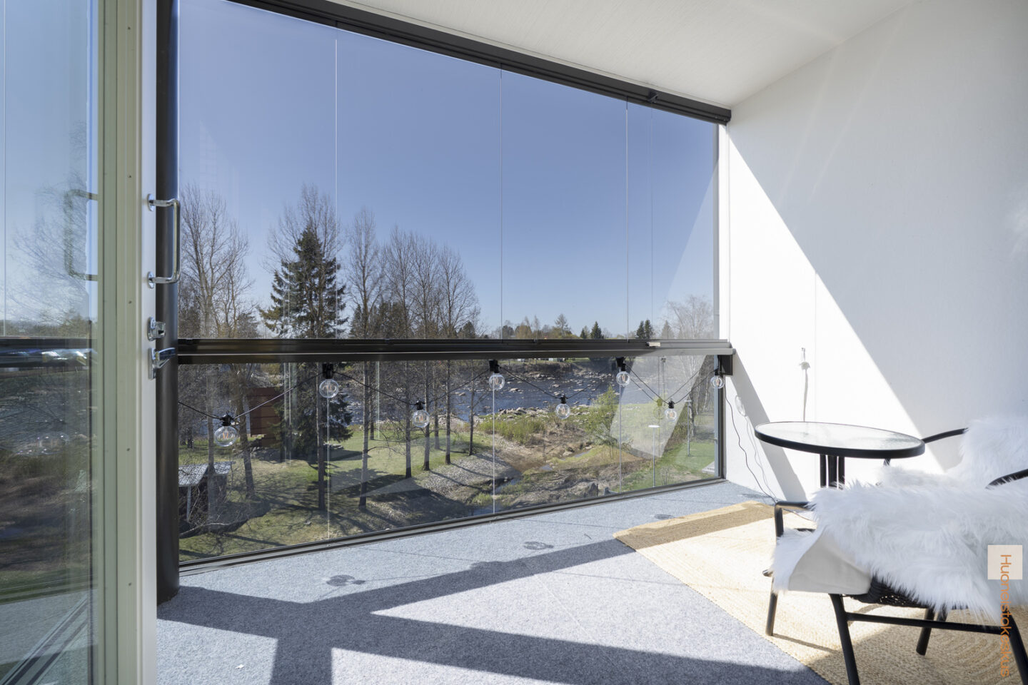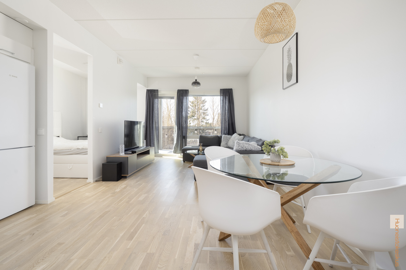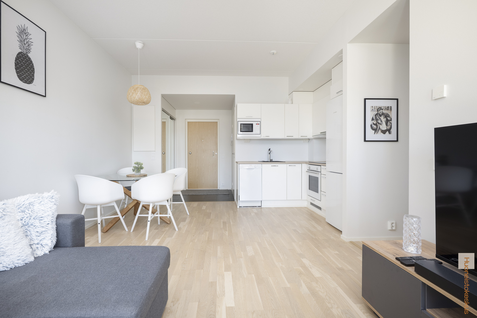 Siistikuntoinen kompakti asunto. Laatoitettu eteinen peilikaapistoilla. Sisäänkäynnin vieressä tilava pesuhuone ja oma sauna. Keittiö ja olohuone avointa tilaa, jonka jatkeena lasitettu parveke joen suuntaan. Säilytystilaa löytyy eteisen ja makuuhuoneen kaapistoista sekä alakerran lämpimästä varastosta. Taloyhtiöllä lisäksi yhteiset pyörävarastot ja puulämmitteinen ulkosauna, joka varattavissa omaan käyttöön.