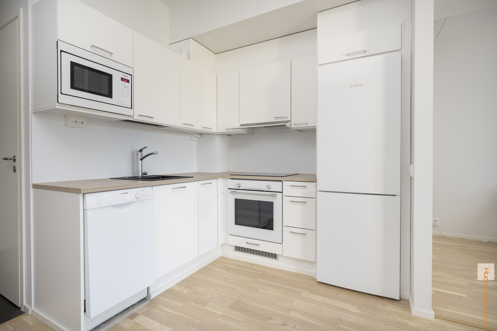 | Keittiön kuvaus | Liesi (sähköliesi), työtasot (laminaatti), seinät (maali), lattiat (laminaatti), liesi, astianpesukone, jääkaappipakastin ja liesituuletin |