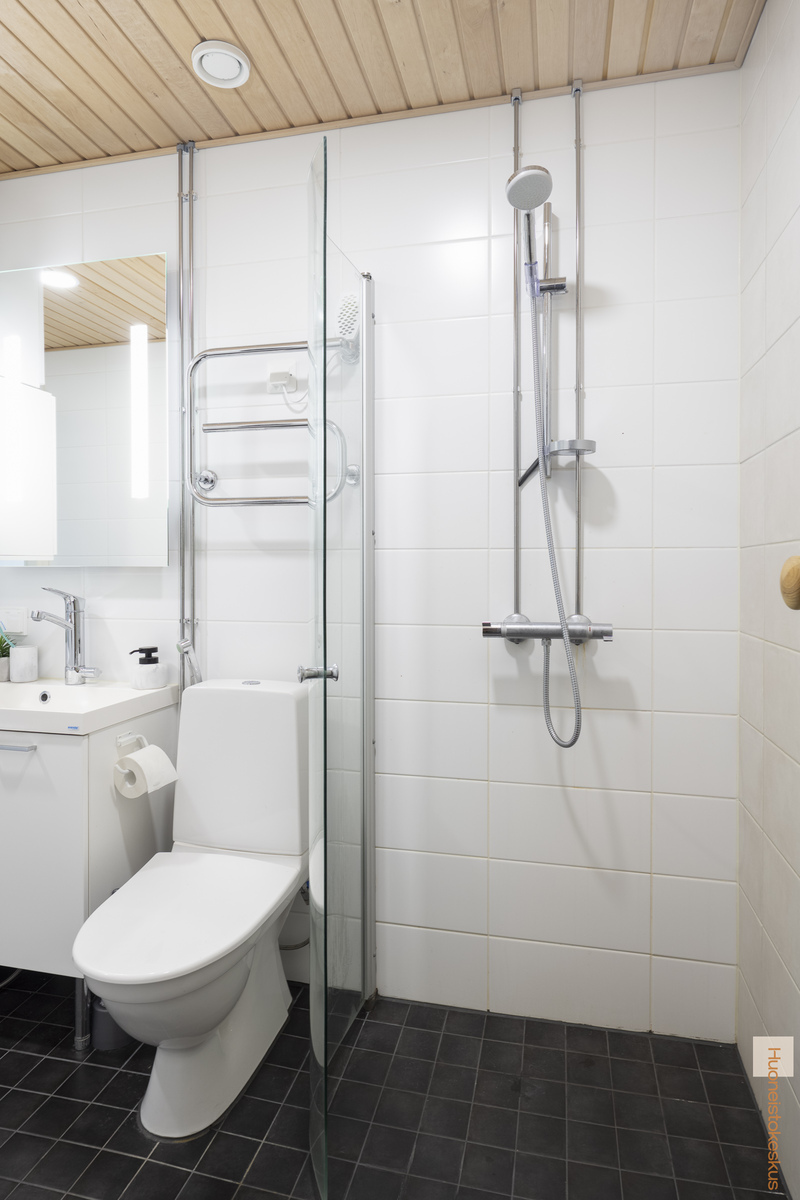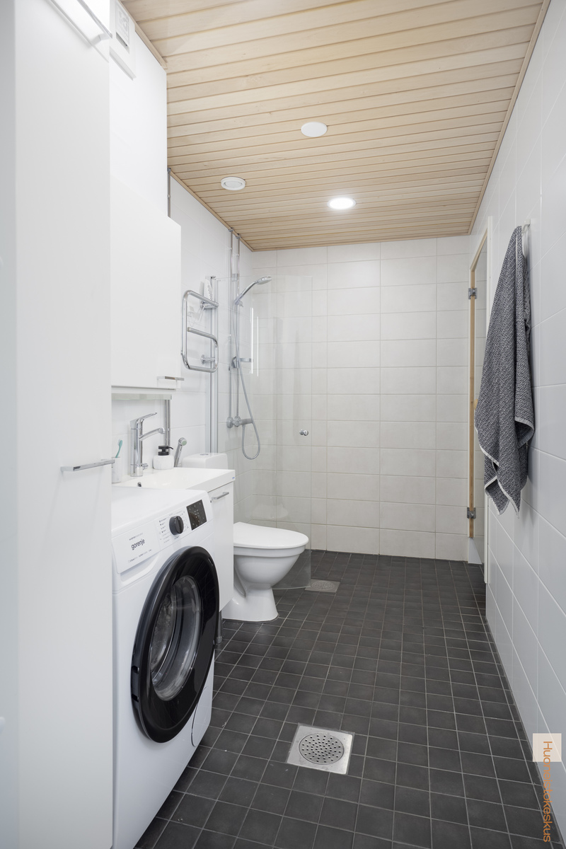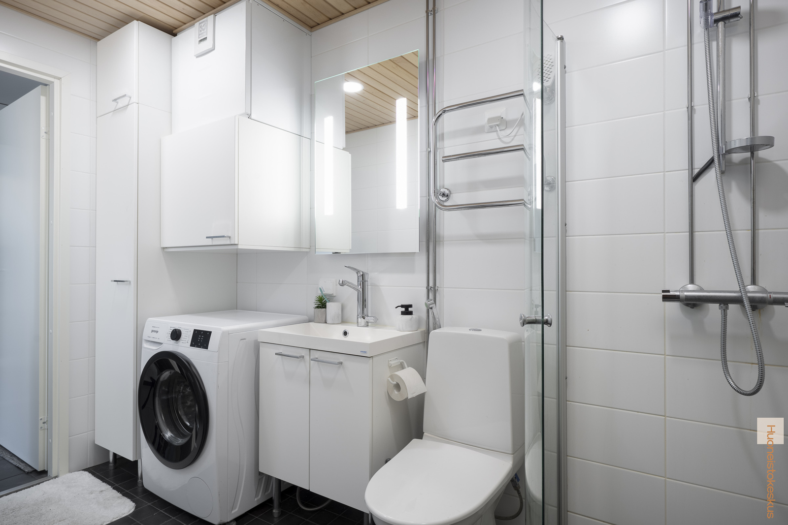 | Kylpyhuoneen kuvaus | Pesukoneliitäntä, wc-istuin, lattialämmitys, peilikaappi, suihku ja kiinteät valaisimet, seinät (kaakeli), lattiat (laatta) |