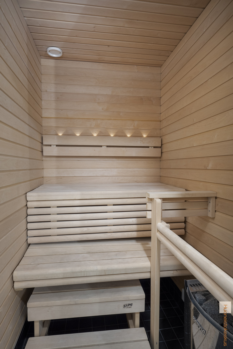 | Saunan kuvaus | Seinät (puu), lattiat (laatta), Sähkökiuas |