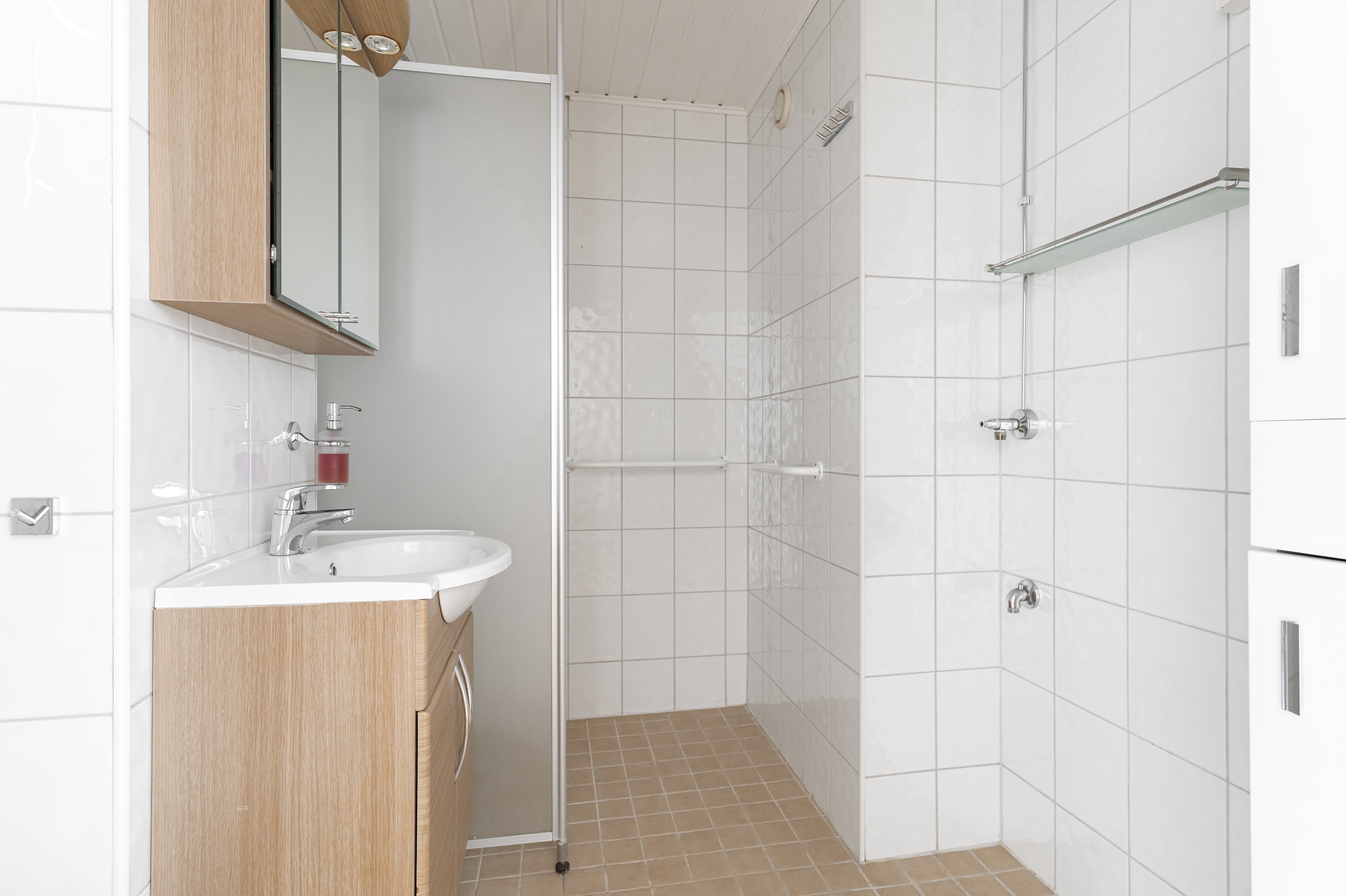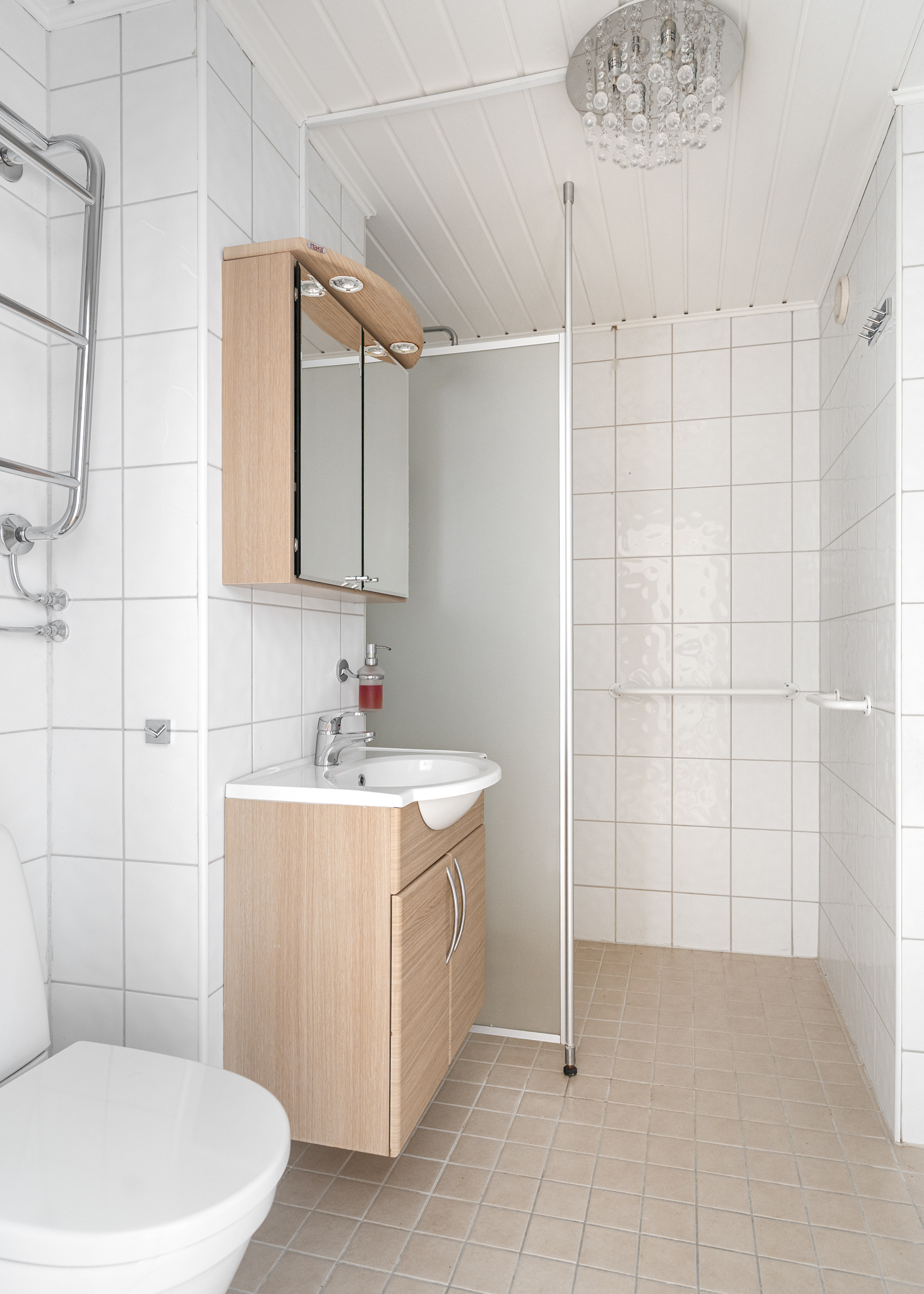 WC-istuin, suihku, suihkuseinä, pesukoneliitäntä, peilikaappi, pesuallas, allaskaappi ja pyyhekuivain, seinät (kaakeli), lattiat (laatta) |