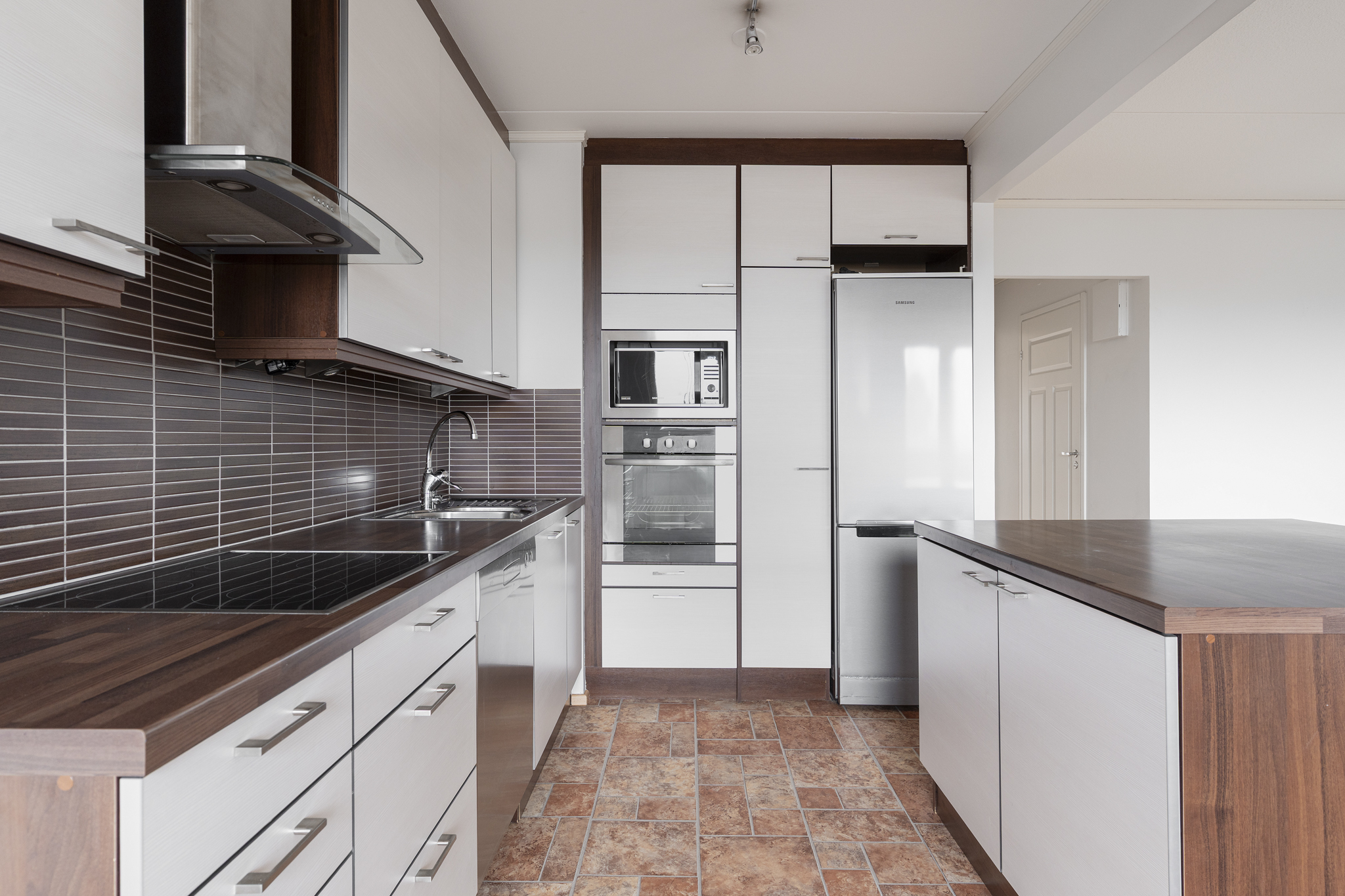 Liesi (Induktioliesi), työtasot (laminaatti), seinät (laatta ja maali), lattiat (laminaatti), jääkaappipakastin, erillisuuni, liesi, liesituuletin, mikroaaltouuni, astianpesukone ja keittiösaareke |