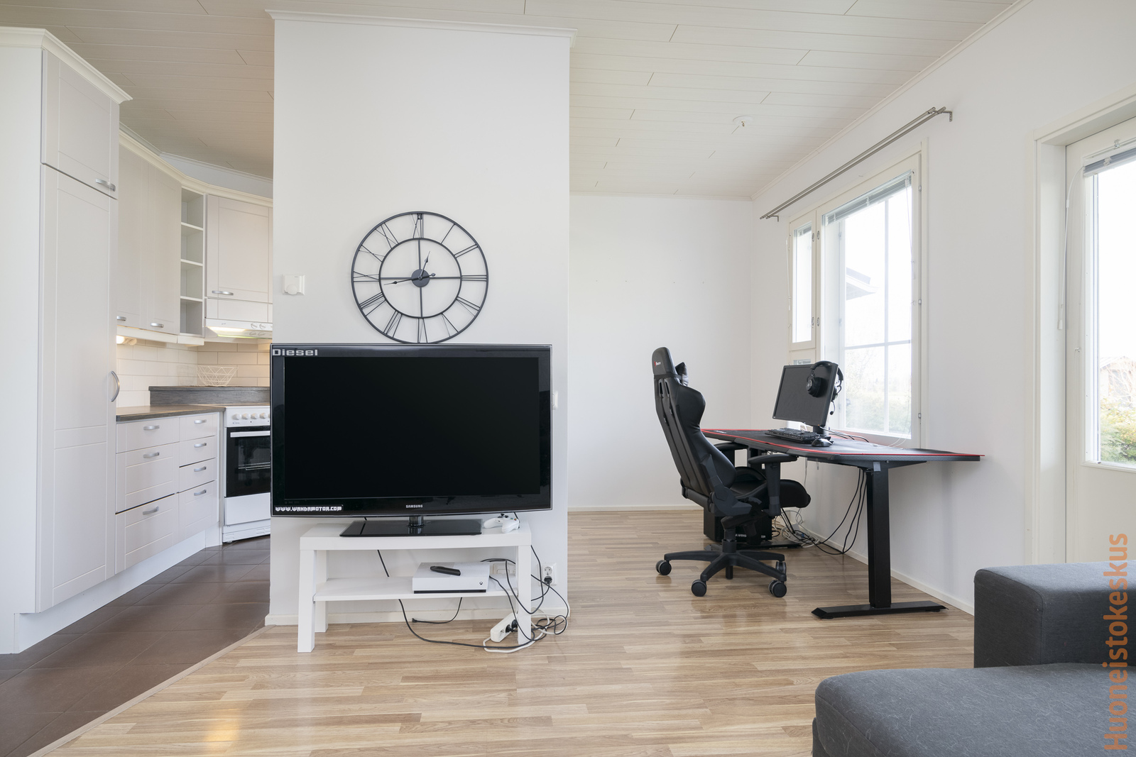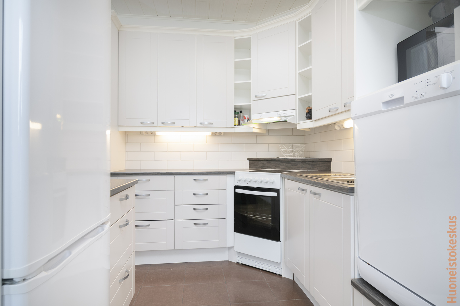 Asunnon pinnat ovat mukavan vaaleat ja huoneisto on valoisa. Keittiössä on paljon kaappi- ja laskutilaa. Makuuhuoneessa on koko seinän leveydeltä kaapistoja.