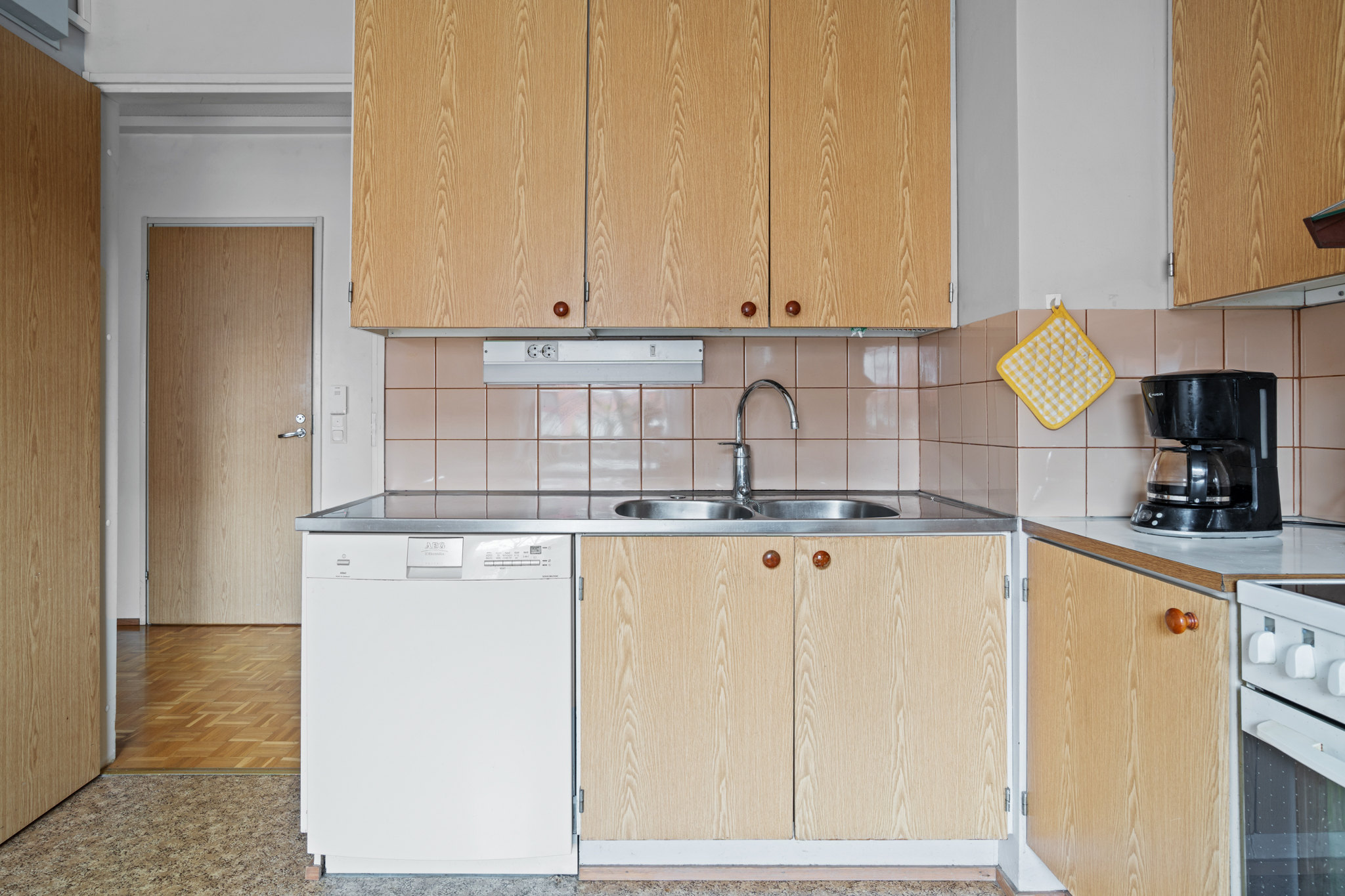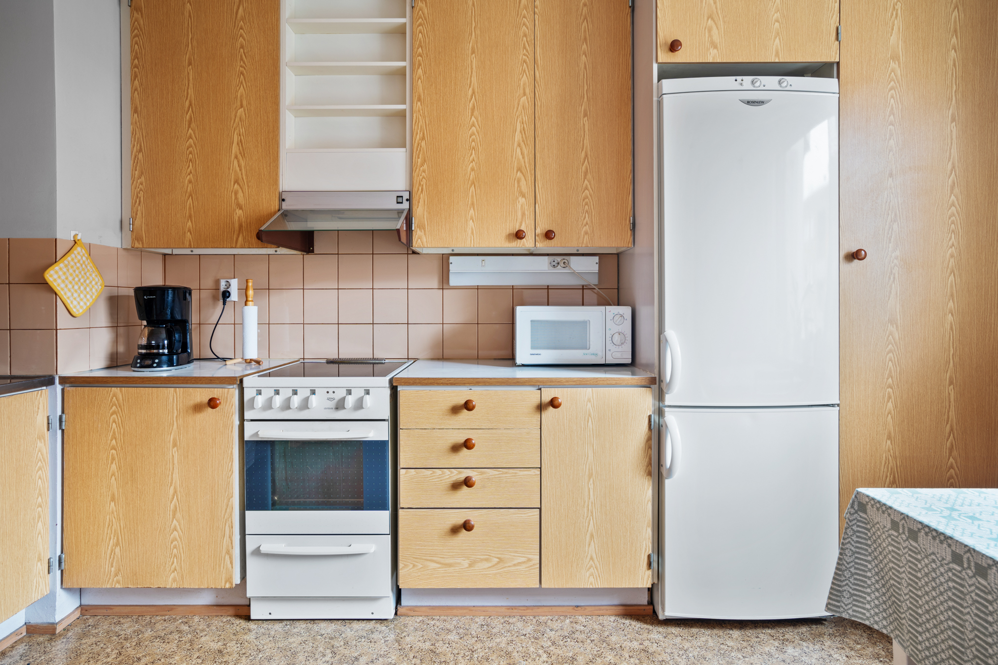 Liesi (Keraaminen liesi), työtasot (laminaatti), seinät (maali), lattiat (muovimatto), jääkaappipakastin, uuni ja astianpesukone |