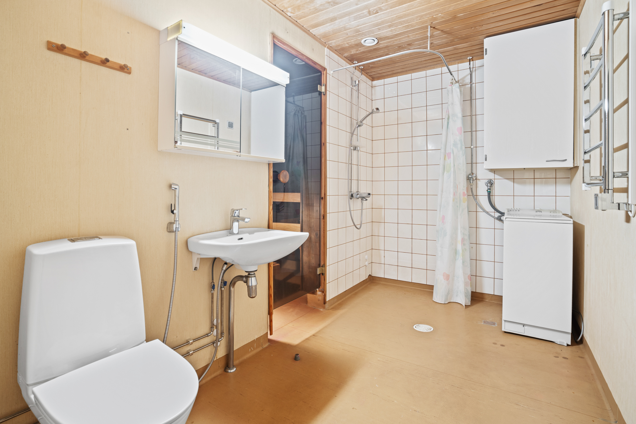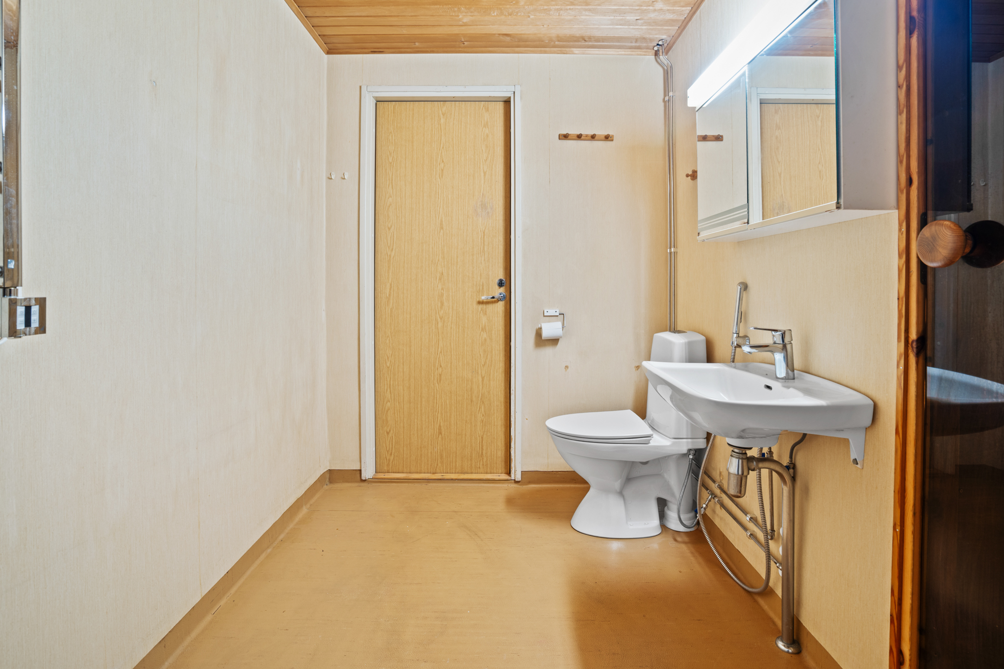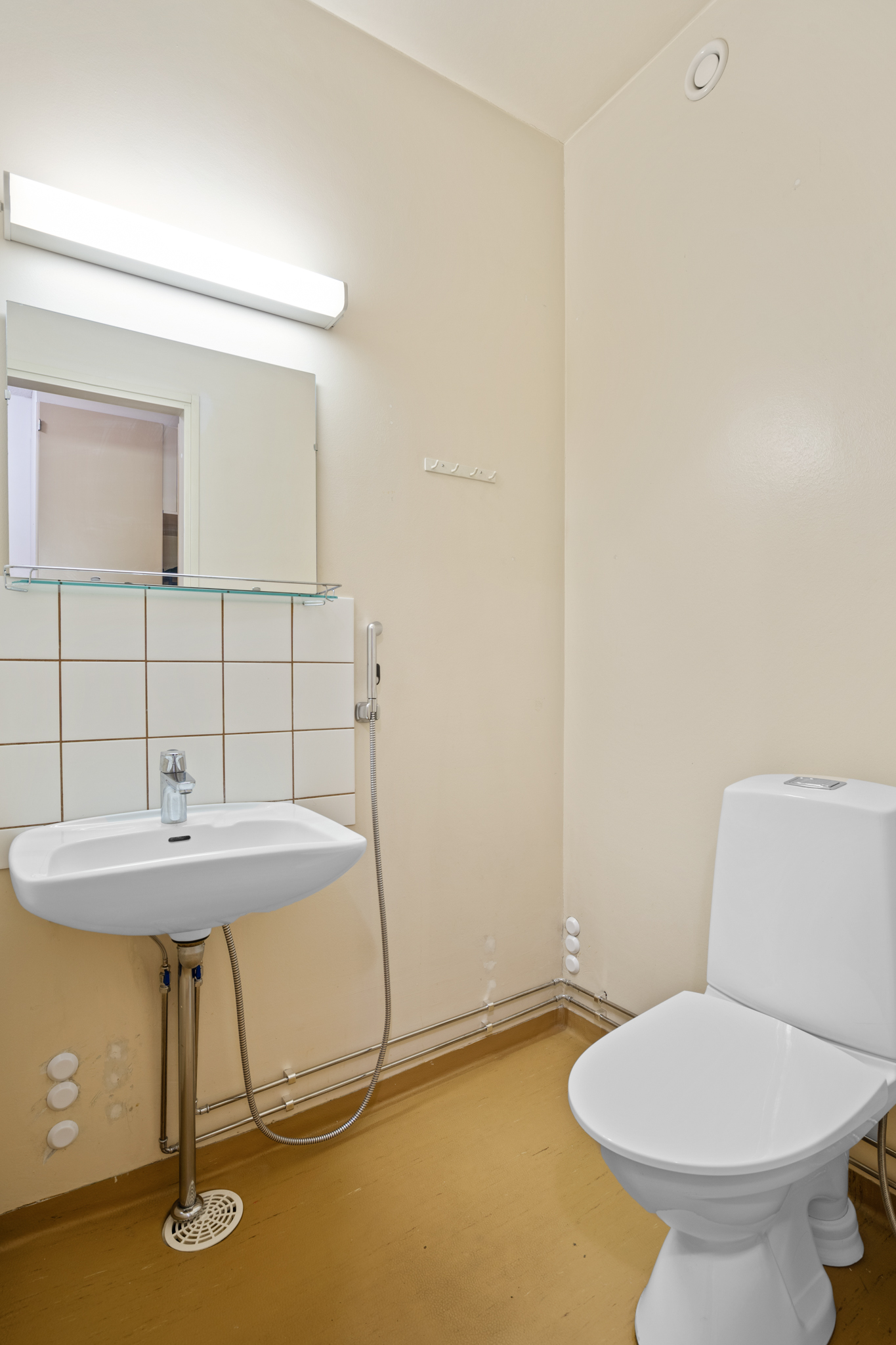 Lukumäärä: 1, WC-istuin, bidee-suihku ja peili, seinät (Maali), lattiat (Muovimatto) |