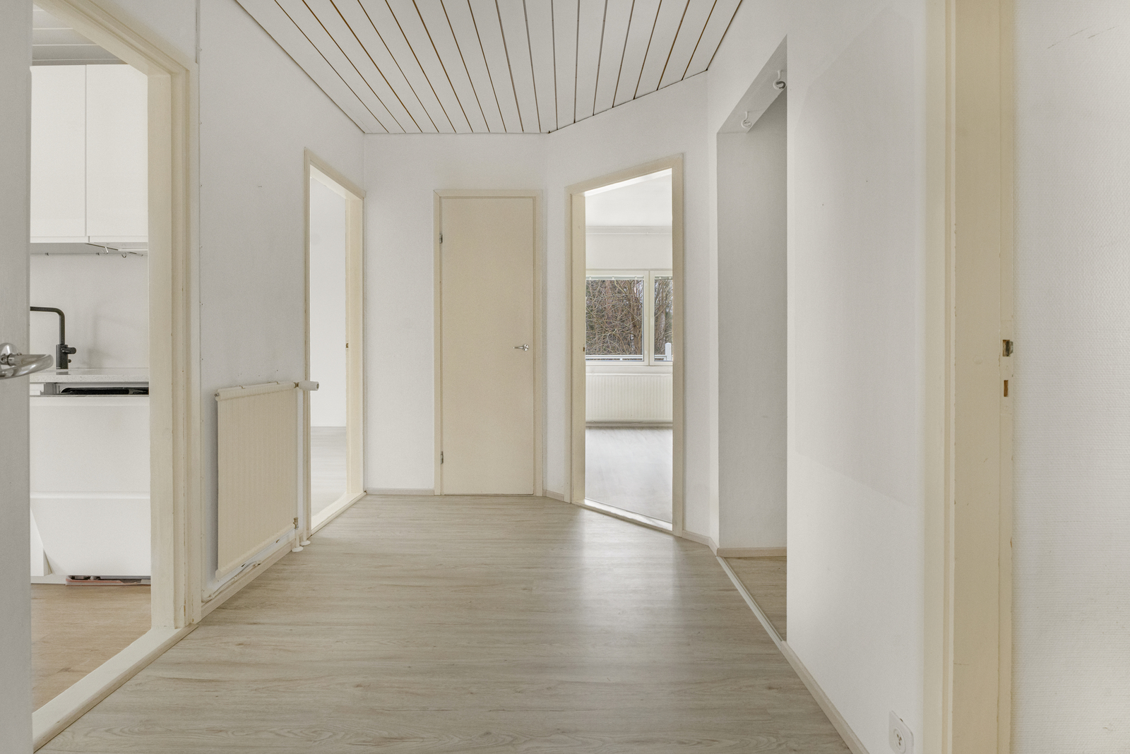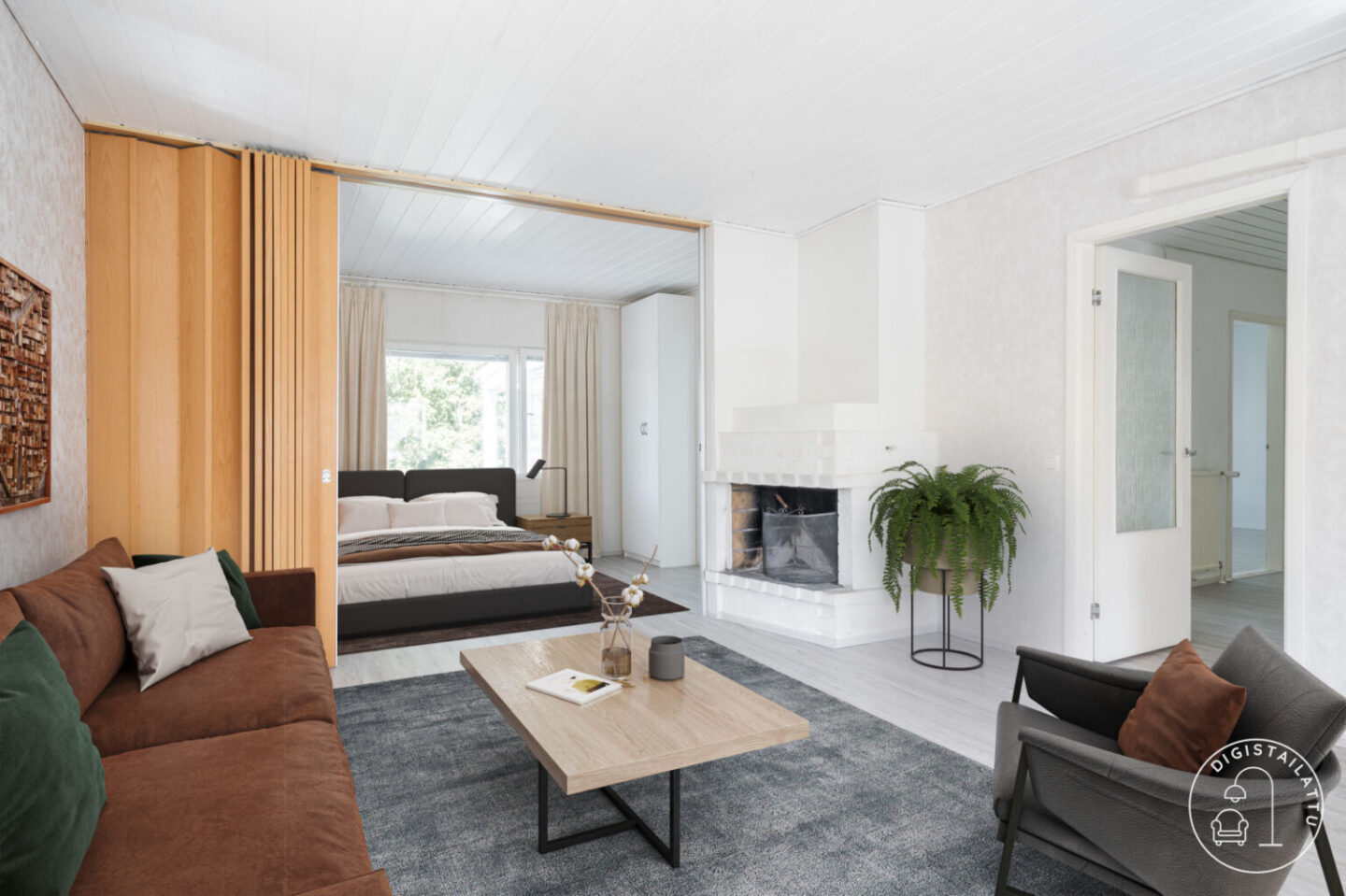 Remontoitu, valoisa keittiö on kodin sydän ja tarjoaa modernin ja käytännöllisen tilan. Olohuoneen yhteydessä oleva ruokailutila voidaan tarvittaessa jakaa erilliseksi huoneeksi, esimerkiksi kolmanneksi makuuhuoneeksi. Olohuoneessa on tunnelmallinen avotakka. Kaksi makuuhuonetta, joista toisessa on vaatehuone. Erillinen wc.
