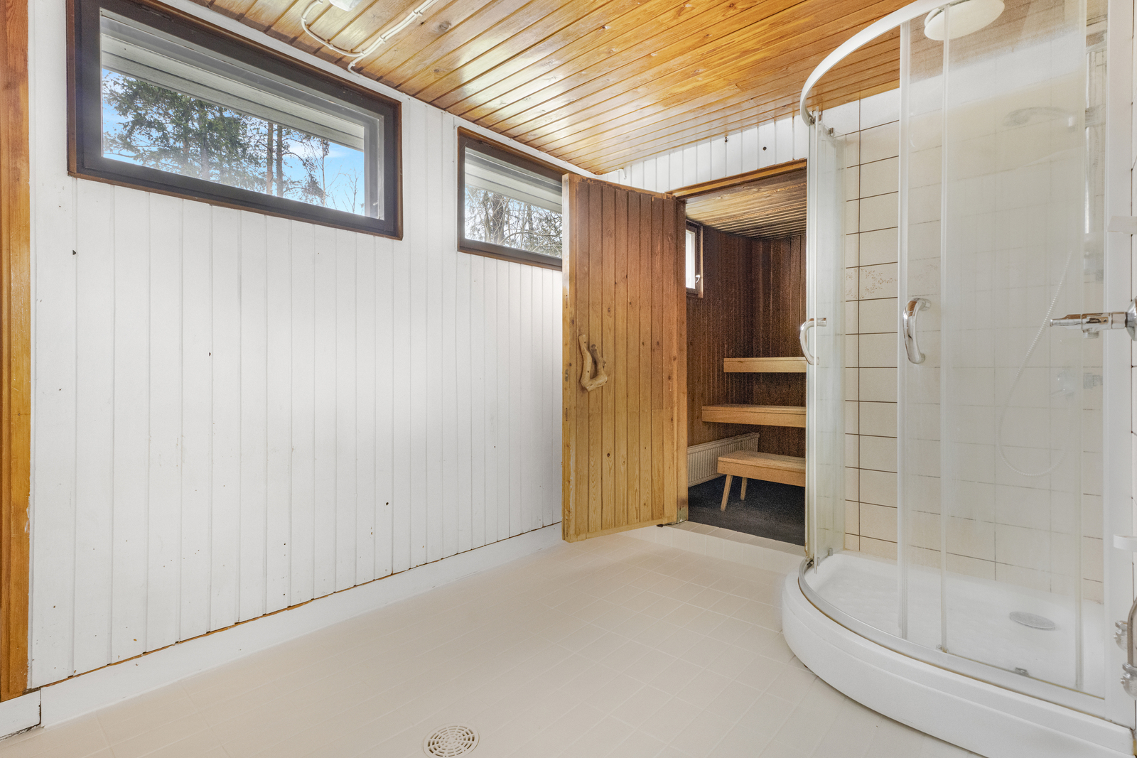 Omassa siivessään sijaitsevat pesuhuone, puulämmitteinen sauna ja tekninen tila, joka on toiminut kodinhoitohuoneena. Lämmin autotalli ja erillinen lämmin varasto tarjoavat runsaasti säilytystilaa, ja autotallin edustalla on tilaa kahdelle autolle.