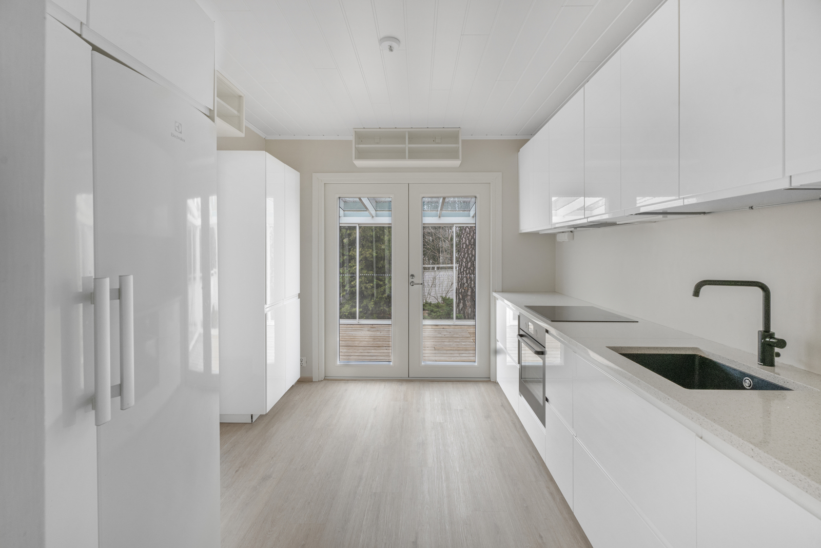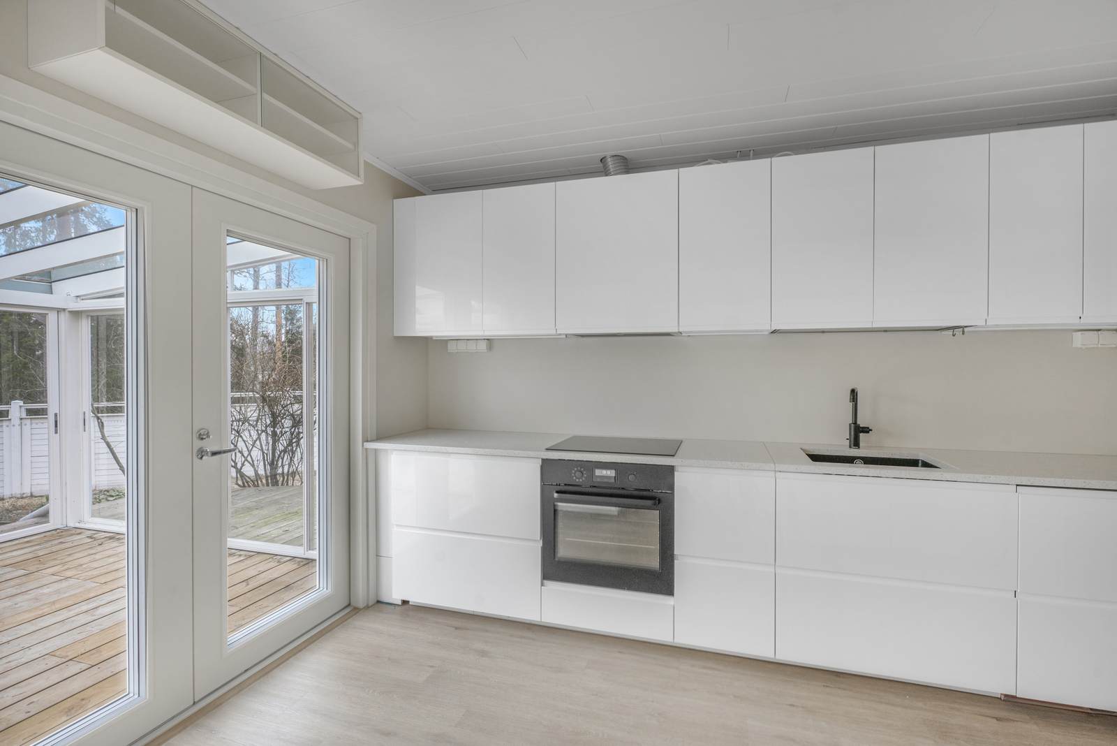 | Keittiön kuvaus | Liesi (Keraaminen liesi), työtasot (kivi), seinät (maali), lattiat (laminaatti), astianpesukone, jääkaappi, liesituuletin ja erillinen pakastin |