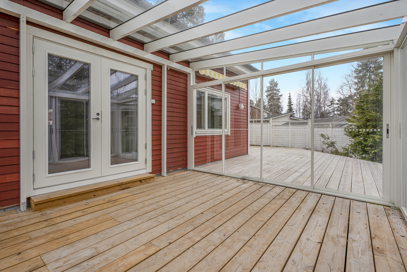 Pihapiiri on kokonaan aidattu, helppohoitoinen ja suojaisa, rajoittuen metsikköön. Pihalla on tilava terassi sekä upea kolmen vuodenajan lasiterassi, jonne pääsee suoraan keittiön pariovista – täydellinen paikka rentoutumiseen ja ulkona nauttimiseen.