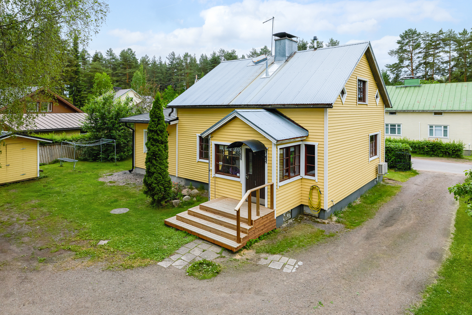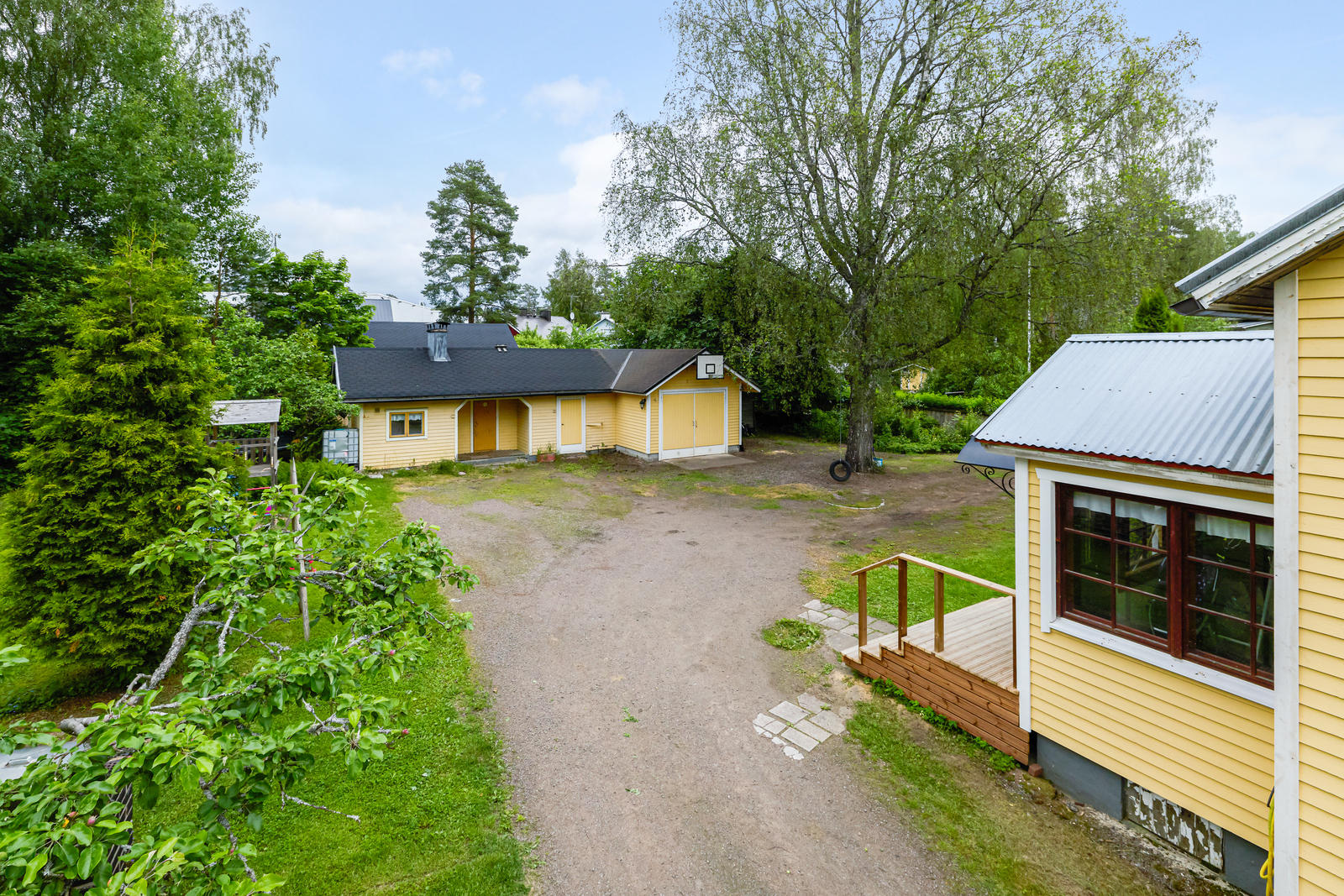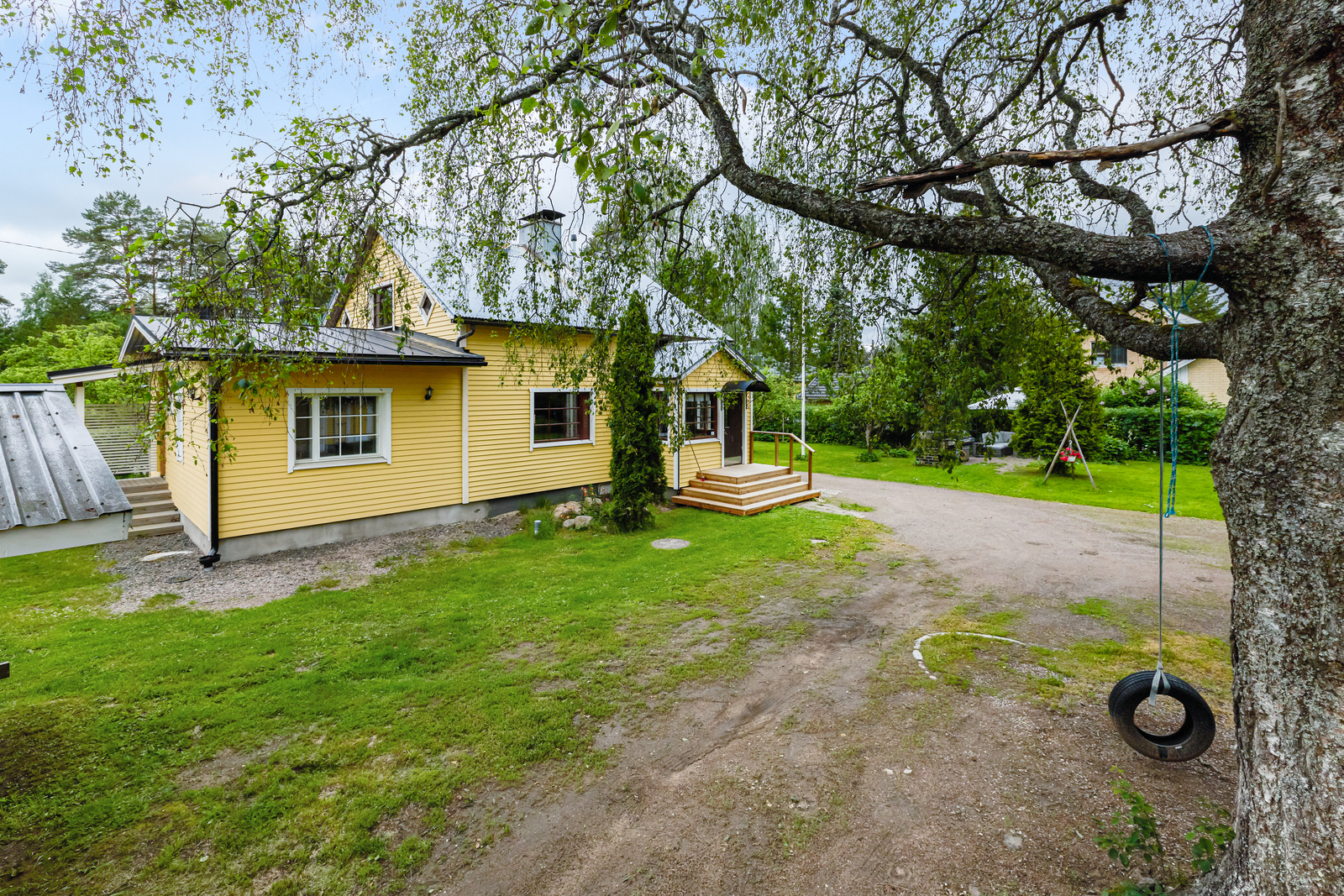 Suurikokoinen piha lasten leikeille, viljelyyn tai rentoutumiseen. Pihasauna puukiukaineen on hurmaava pihalla. Uusi katto valmistuu heinäkuussa 2025.