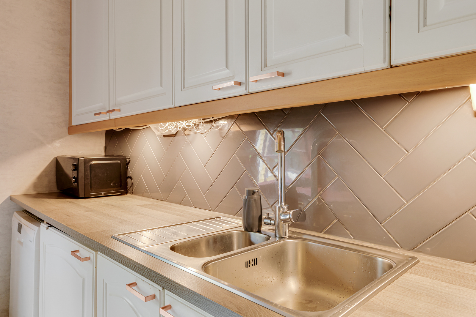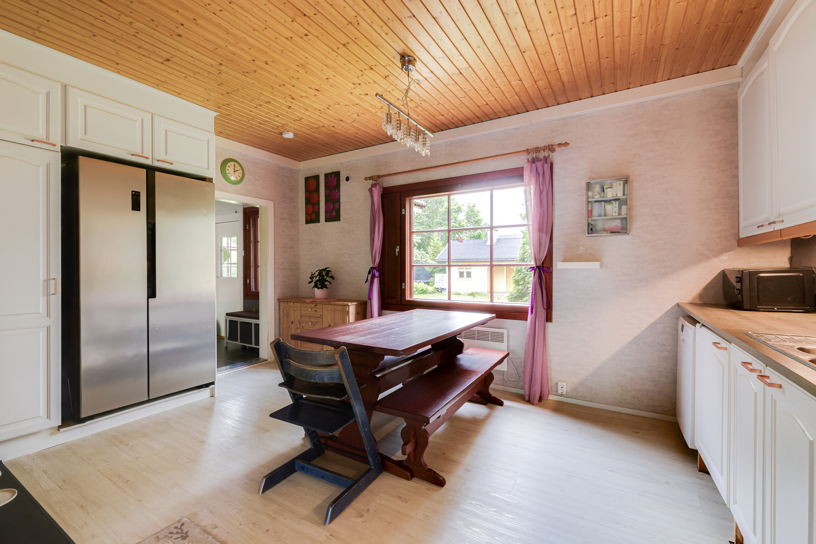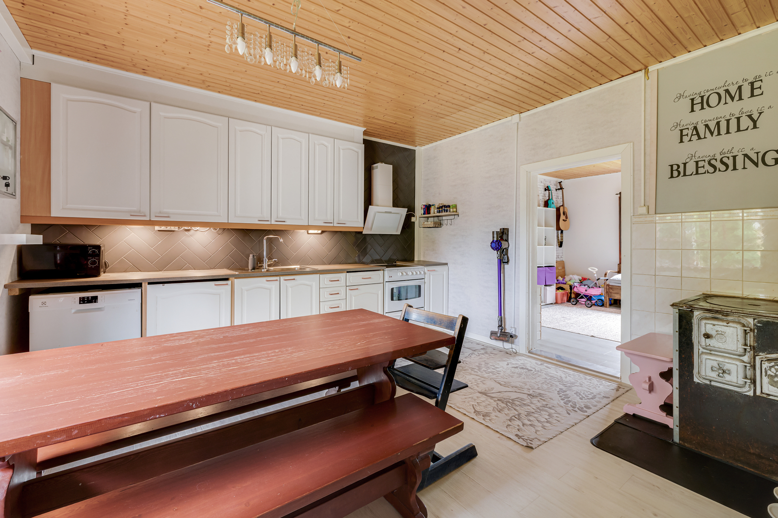 Liesi (Keraaminen liesi ja leivinuuni), seinät (tapetti), lattiat (vinyyli), uuni, jääkaappipakastin, liesituuletin, astianpesukone ja kiinteät valaisimet |